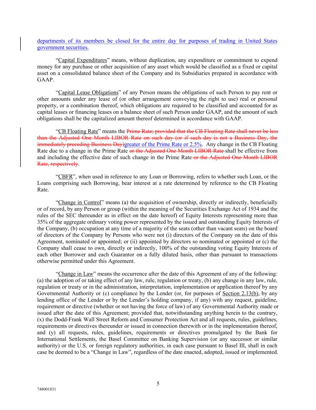 departments of its members be closed for the entire day for purposes of trading in United States government securities. “Capital Expenditures” means, without duplication, any expenditure or commitment to expend money for any purchase or other acquisition of any asset which would be classified as a fixed or capital asset on a consolidated balance sheet of the Company and its Subsidiaries prepared in accordance with GAAP. “Capital Lease Obligations” of any Person means the obligations of such Person to pay rent or other amounts under any lease of (or other arrangement conveying the right to use) real or personal property, or a combination thereof, which obligations are required to be classified and accounted for as capital leases or financing leases on a balance sheet of such Person under GAAP, and the amount of such obligations shall be the capitalized amount thereof determined in accordance with GAAP. “CB Floating Rate” means the Prime Rate; provided that the CB Floating Rate shall never be less than the Adjusted One Month LIBOR Rate on such day (or if such day is not a Business Day, the immediately preceding Business Day)greater of the Prime Rate or 2.5%. Any change in the CB Floating Rate due to a change in the Prime Rate or the Adjusted One Month LIBOR Rate shall be effective from and including the effective date of such change in the Prime Rate or the Adjusted One Month LIBOR Rate, respectively. “CBFR”, when used in reference to any Loan or Borrowing, refers to whether such Loan, or the Loans comprising such Borrowing, bear interest at a rate determined by reference to the CB Floating Rate. “Change in Control” means (a) the acquisition of ownership, directly or indirectly, beneficially or of record, by any Person or group (within the meaning of the Securities Exchange Act of 1934 and the rules of the SEC thereunder as in effect on the date hereof) of Equity Interests representing more than 35% of the aggregate ordinary voting power represented by the issued and outstanding Equity Interests of the Company, (b) occupation at any time of a majority of the seats (other than vacant seats) on the board of directors of the Company by Persons who were not (i) directors of the Company on the date of this Agreement, nominated or appointed; or (ii) appointed by directors so nominated or appointed or (c) the Company shall cease to own, directly or indirectly, 100% of the outstanding voting Equity Interests of each other Borrower and each Guarantor on a fully diluted basis, other than pursuant to transactions otherwise permitted under this Agreement. “Change in Law” means the occurrence after the date of this Agreement of any of the following: (a) the adoption of or taking effect of any law, rule, regulation or treaty, (b) any change in any law, rule, regulation or treaty or in the administration, interpretation, implementation or application thereof by any Governmental Authority or (c) compliance by the Lender (or, for purposes of Section 2.13(b), by any lending office of the Lender or by the Lender’s holding company, if any) with any request, guideline, requirement or directive (whether or not having the force of law) of any Governmental Authority made or issued after the date of this Agreement; provided that, notwithstanding anything herein to the contrary, (x) the Dodd-Frank Wall Street Reform and Consumer Protection Act and all requests, rules, guidelines, requirements or directives thereunder or issued in connection therewith or in the implementation thereof, and (y) all requests, rules, guidelines, requirements or directives promulgated by the Bank for International Settlements, the Basel Committee on Banking Supervision (or any successor or similar authority) or the U.S. or foreign regulatory authorities, in each case pursuant to Basel III, shall in each case be deemed to be a “Change in Law”, regardless of the date enacted, adopted, issued or implemented. 5 748001831