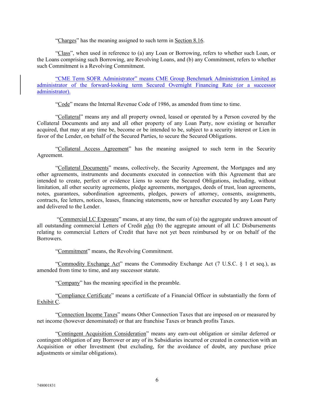 “Charges” has the meaning assigned to such term in Section 8.16. “Class”, when used in reference to (a) any Loan or Borrowing, refers to whether such Loan, or the Loans comprising such Borrowing, are Revolving Loans, and (b) any Commitment, refers to whether such Commitment is a Revolving Commitment. “CME Term SOFR Administrator” means CME Group Benchmark Administration Limited as administrator of the forward-looking term Secured Overnight Financing Rate (or a successor administrator). “Code” means the Internal Revenue Code of 1986, as amended from time to time. “Collateral” means any and all property owned, leased or operated by a Person covered by the Collateral Documents and any and all other property of any Loan Party, now existing or hereafter acquired, that may at any time be, become or be intended to be, subject to a security interest or Lien in favor of the Lender, on behalf of the Secured Parties, to secure the Secured Obligations. “Collateral Access Agreement” has the meaning assigned to such term in the Security Agreement. “Collateral Documents” means, collectively, the Security Agreement, the Mortgages and any other agreements, instruments and documents executed in connection with this Agreement that are intended to create, perfect or evidence Liens to secure the Secured Obligations, including, without limitation, all other security agreements, pledge agreements, mortgages, deeds of trust, loan agreements, notes, guarantees, subordination agreements, pledges, powers of attorney, consents, assignments, contracts, fee letters, notices, leases, financing statements, now or hereafter executed by any Loan Party and delivered to the Lender. “Commercial LC Exposure” means, at any time, the sum of (a) the aggregate undrawn amount of all outstanding commercial Letters of Credit plus (b) the aggregate amount of all LC Disbursements relating to commercial Letters of Credit that have not yet been reimbursed by or on behalf of the Borrowers. “Commitment” means, the Revolving Commitment. “Commodity Exchange Act” means the Commodity Exchange Act (7 U.S.C. § 1 et seq.), as amended from time to time, and any successor statute. “Company” has the meaning specified in the preamble. “Compliance Certificate” means a certificate of a Financial Officer in substantially the form of Exhibit C. “Connection Income Taxes” means Other Connection Taxes that are imposed on or measured by net income (however denominated) or that are franchise Taxes or branch profits Taxes. “Contingent Acquisition Consideration” means any earn-out obligation or similar deferred or contingent obligation of any Borrower or any of its Subsidiaries incurred or created in connection with an Acquisition or other Investment (but excluding, for the avoidance of doubt, any purchase price adjustments or similar obligations). 6 748001831