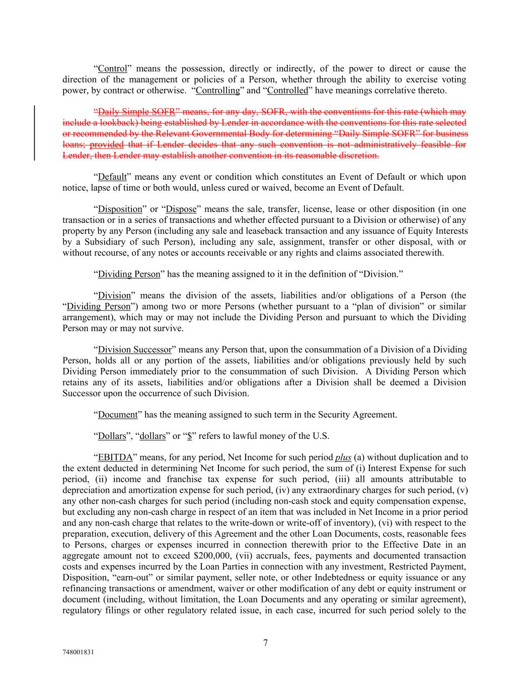 “Control” means the possession, directly or indirectly, of the power to direct or cause the direction of the management or policies of a Person, whether through the ability to exercise voting power, by contract or otherwise. “Controlling” and “Controlled” have meanings correlative thereto. “Daily Simple SOFR” means, for any day, SOFR, with the conventions for this rate (which may include a lookback) being established by Lender in accordance with the conventions for this rate selected or recommended by the Relevant Governmental Body for determining “Daily Simple SOFR” for business loans; provided that if Lender decides that any such convention is not administratively feasible for Lender, then Lender may establish another convention in its reasonable discretion. “Default” means any event or condition which constitutes an Event of Default or which upon notice, lapse of time or both would, unless cured or waived, become an Event of Default. “Disposition” or “Dispose” means the sale, transfer, license, lease or other disposition (in one transaction or in a series of transactions and whether effected pursuant to a Division or otherwise) of any property by any Person (including any sale and leaseback transaction and any issuance of Equity Interests by a Subsidiary of such Person), including any sale, assignment, transfer or other disposal, with or without recourse, of any notes or accounts receivable or any rights and claims associated therewith. “Dividing Person” has the meaning assigned to it in the definition of “Division.” “Division” means the division of the assets, liabilities and/or obligations of a Person (the “Dividing Person”) among two or more Persons (whether pursuant to a “plan of division” or similar arrangement), which may or may not include the Dividing Person and pursuant to which the Dividing Person may or may not survive. “Division Successor” means any Person that, upon the consummation of a Division of a Dividing Person, holds all or any portion of the assets, liabilities and/or obligations previously held by such Dividing Person immediately prior to the consummation of such Division. A Dividing Person which retains any of its assets, liabilities and/or obligations after a Division shall be deemed a Division Successor upon the occurrence of such Division. “Document” has the meaning assigned to such term in the Security Agreement. “Dollars”, “dollars” or “$” refers to lawful money of the U.S. “EBITDA” means, for any period, Net Income for such period plus (a) without duplication and to the extent deducted in determining Net Income for such period, the sum of (i) Interest Expense for such period, (ii) income and franchise tax expense for such period, (iii) all amounts attributable to depreciation and amortization expense for such period, (iv) any extraordinary charges for such period, (v) any other non-cash charges for such period (including non-cash stock and equity compensation expense, but excluding any non-cash charge in respect of an item that was included in Net Income in a prior period and any non-cash charge that relates to the write-down or write-off of inventory), (vi) with respect to the preparation, execution, delivery of this Agreement and the other Loan Documents, costs, reasonable fees to Persons, charges or expenses incurred in connection therewith prior to the Effective Date in an aggregate amount not to exceed $200,000, (vii) accruals, fees, payments and documented transaction costs and expenses incurred by the Loan Parties in connection with any investment, Restricted Payment, Disposition, “earn-out” or similar payment, seller note, or other Indebtedness or equity issuance or any refinancing transactions or amendment, waiver or other modification of any debt or equity instrument or document (including, without limitation, the Loan Documents and any operating or similar agreement), regulatory filings or other regulatory related issue, in each case, incurred for such period solely to the 7 748001831