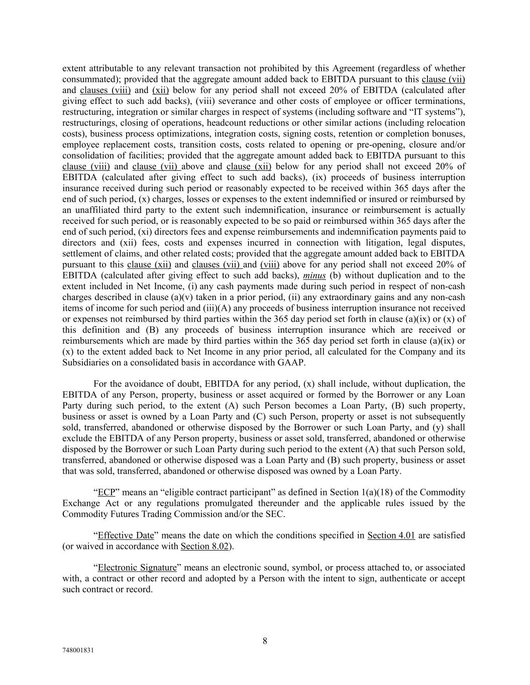 extent attributable to any relevant transaction not prohibited by this Agreement (regardless of whether consummated); provided that the aggregate amount added back to EBITDA pursuant to this clause (vii) and clauses (viii) and (xii) below for any period shall not exceed 20% of EBITDA (calculated after giving effect to such add backs), (viii) severance and other costs of employee or officer terminations, restructuring, integration or similar charges in respect of systems (including software and “IT systems”), restructurings, closing of operations, headcount reductions or other similar actions (including relocation costs), business process optimizations, integration costs, signing costs, retention or completion bonuses, employee replacement costs, transition costs, costs related to opening or pre-opening, closure and/or consolidation of facilities; provided that the aggregate amount added back to EBITDA pursuant to this clause (viii) and clause (vii) above and clause (xii) below for any period shall not exceed 20% of EBITDA (calculated after giving effect to such add backs), (ix) proceeds of business interruption insurance received during such period or reasonably expected to be received within 365 days after the end of such period, (x) charges, losses or expenses to the extent indemnified or insured or reimbursed by an unaffiliated third party to the extent such indemnification, insurance or reimbursement is actually received for such period, or is reasonably expected to be so paid or reimbursed within 365 days after the end of such period, (xi) directors fees and expense reimbursements and indemnification payments paid to directors and (xii) fees, costs and expenses incurred in connection with litigation, legal disputes, settlement of claims, and other related costs; provided that the aggregate amount added back to EBITDA pursuant to this clause (xii) and clauses (vii) and (viii) above for any period shall not exceed 20% of EBITDA (calculated after giving effect to such add backs), minus (b) without duplication and to the extent included in Net Income, (i) any cash payments made during such period in respect of non-cash charges described in clause (a)(v) taken in a prior period, (ii) any extraordinary gains and any non-cash items of income for such period and (iii)(A) any proceeds of business interruption insurance not received or expenses not reimbursed by third parties within the 365 day period set forth in clause (a)(ix) or (x) of this definition and (B) any proceeds of business interruption insurance which are received or reimbursements which are made by third parties within the 365 day period set forth in clause (a)(ix) or (x) to the extent added back to Net Income in any prior period, all calculated for the Company and its Subsidiaries on a consolidated basis in accordance with GAAP. For the avoidance of doubt, EBITDA for any period, (x) shall include, without duplication, the EBITDA of any Person, property, business or asset acquired or formed by the Borrower or any Loan Party during such period, to the extent (A) such Person becomes a Loan Party, (B) such property, business or asset is owned by a Loan Party and (C) such Person, property or asset is not subsequently sold, transferred, abandoned or otherwise disposed by the Borrower or such Loan Party, and (y) shall exclude the EBITDA of any Person property, business or asset sold, transferred, abandoned or otherwise disposed by the Borrower or such Loan Party during such period to the extent (A) that such Person sold, transferred, abandoned or otherwise disposed was a Loan Party and (B) such property, business or asset that was sold, transferred, abandoned or otherwise disposed was owned by a Loan Party. “ECP” means an “eligible contract participant” as defined in Section 1(a)(18) of the Commodity Exchange Act or any regulations promulgated thereunder and the applicable rules issued by the Commodity Futures Trading Commission and/or the SEC. “Effective Date” means the date on which the conditions specified in Section 4.01 are satisfied (or waived in accordance with Section 8.02). “Electronic Signature” means an electronic sound, symbol, or process attached to, or associated with, a contract or other record and adopted by a Person with the intent to sign, authenticate or accept such contract or record. 8 748001831