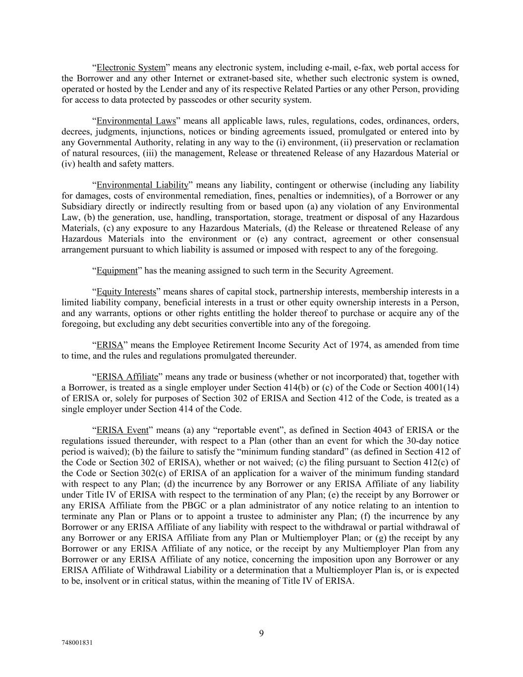 “Electronic System” means any electronic system, including e-mail, e-fax, web portal access for the Borrower and any other Internet or extranet-based site, whether such electronic system is owned, operated or hosted by the Lender and any of its respective Related Parties or any other Person, providing for access to data protected by passcodes or other security system. “Environmental Laws” means all applicable laws, rules, regulations, codes, ordinances, orders, decrees, judgments, injunctions, notices or binding agreements issued, promulgated or entered into by any Governmental Authority, relating in any way to the (i) environment, (ii) preservation or reclamation of natural resources, (iii) the management, Release or threatened Release of any Hazardous Material or (iv) health and safety matters. “Environmental Liability” means any liability, contingent or otherwise (including any liability for damages, costs of environmental remediation, fines, penalties or indemnities), of a Borrower or any Subsidiary directly or indirectly resulting from or based upon (a) any violation of any Environmental Law, (b) the generation, use, handling, transportation, storage, treatment or disposal of any Hazardous Materials, (c) any exposure to any Hazardous Materials, (d) the Release or threatened Release of any Hazardous Materials into the environment or (e) any contract, agreement or other consensual arrangement pursuant to which liability is assumed or imposed with respect to any of the foregoing. “Equipment” has the meaning assigned to such term in the Security Agreement. “Equity Interests” means shares of capital stock, partnership interests, membership interests in a limited liability company, beneficial interests in a trust or other equity ownership interests in a Person, and any warrants, options or other rights entitling the holder thereof to purchase or acquire any of the foregoing, but excluding any debt securities convertible into any of the foregoing. “ERISA” means the Employee Retirement Income Security Act of 1974, as amended from time to time, and the rules and regulations promulgated thereunder. “ERISA Affiliate” means any trade or business (whether or not incorporated) that, together with a Borrower, is treated as a single employer under Section 414(b) or (c) of the Code or Section 4001(14) of ERISA or, solely for purposes of Section 302 of ERISA and Section 412 of the Code, is treated as a single employer under Section 414 of the Code. “ERISA Event” means (a) any “reportable event”, as defined in Section 4043 of ERISA or the regulations issued thereunder, with respect to a Plan (other than an event for which the 30-day notice period is waived); (b) the failure to satisfy the “minimum funding standard” (as defined in Section 412 of the Code or Section 302 of ERISA), whether or not waived; (c) the filing pursuant to Section 412(c) of the Code or Section 302(c) of ERISA of an application for a waiver of the minimum funding standard with respect to any Plan; (d) the incurrence by any Borrower or any ERISA Affiliate of any liability under Title IV of ERISA with respect to the termination of any Plan; (e) the receipt by any Borrower or any ERISA Affiliate from the PBGC or a plan administrator of any notice relating to an intention to terminate any Plan or Plans or to appoint a trustee to administer any Plan; (f) the incurrence by any Borrower or any ERISA Affiliate of any liability with respect to the withdrawal or partial withdrawal of any Borrower or any ERISA Affiliate from any Plan or Multiemployer Plan; or (g) the receipt by any Borrower or any ERISA Affiliate of any notice, or the receipt by any Multiemployer Plan from any Borrower or any ERISA Affiliate of any notice, concerning the imposition upon any Borrower or any ERISA Affiliate of Withdrawal Liability or a determination that a Multiemployer Plan is, or is expected to be, insolvent or in critical status, within the meaning of Title IV of ERISA. 9 748001831