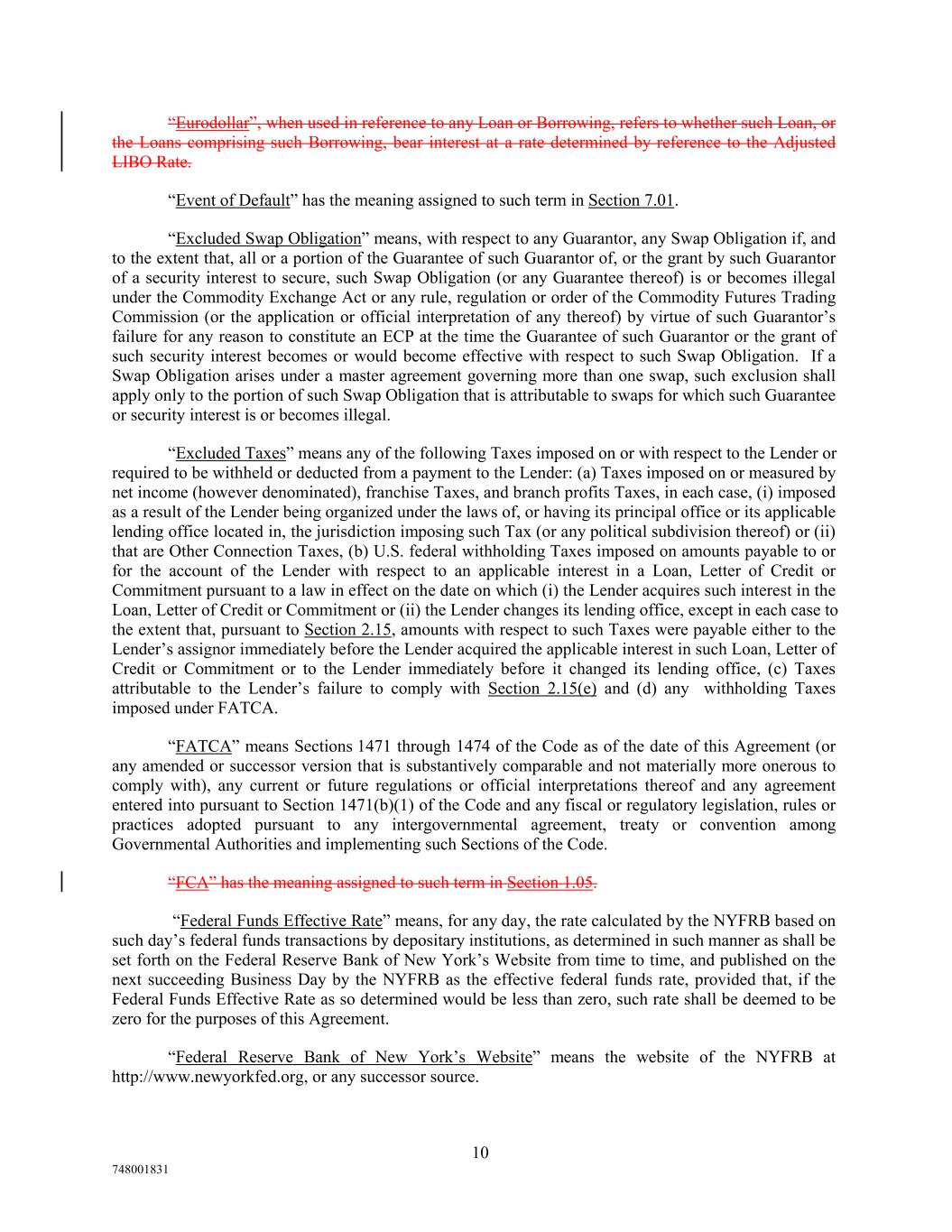 “Eurodollar”, when used in reference to any Loan or Borrowing, refers to whether such Loan, or the Loans comprising such Borrowing, bear interest at a rate determined by reference to the Adjusted LIBO Rate. “Event of Default” has the meaning assigned to such term in Section 7.01. “Excluded Swap Obligation” means, with respect to any Guarantor, any Swap Obligation if, and to the extent that, all or a portion of the Guarantee of such Guarantor of, or the grant by such Guarantor of a security interest to secure, such Swap Obligation (or any Guarantee thereof) is or becomes illegal under the Commodity Exchange Act or any rule, regulation or order of the Commodity Futures Trading Commission (or the application or official interpretation of any thereof) by virtue of such Guarantor’s failure for any reason to constitute an ECP at the time the Guarantee of such Guarantor or the grant of such security interest becomes or would become effective with respect to such Swap Obligation. If a Swap Obligation arises under a master agreement governing more than one swap, such exclusion shall apply only to the portion of such Swap Obligation that is attributable to swaps for which such Guarantee or security interest is or becomes illegal. “Excluded Taxes” means any of the following Taxes imposed on or with respect to the Lender or required to be withheld or deducted from a payment to the Lender: (a) Taxes imposed on or measured by net income (however denominated), franchise Taxes, and branch profits Taxes, in each case, (i) imposed as a result of the Lender being organized under the laws of, or having its principal office or its applicable lending office located in, the jurisdiction imposing such Tax (or any political subdivision thereof) or (ii) that are Other Connection Taxes, (b) U.S. federal withholding Taxes imposed on amounts payable to or for the account of the Lender with respect to an applicable interest in a Loan, Letter of Credit or Commitment pursuant to a law in effect on the date on which (i) the Lender acquires such interest in the Loan, Letter of Credit or Commitment or (ii) the Lender changes its lending office, except in each case to the extent that, pursuant to Section 2.15, amounts with respect to such Taxes were payable either to the Lender’s assignor immediately before the Lender acquired the applicable interest in such Loan, Letter of Credit or Commitment or to the Lender immediately before it changed its lending office, (c) Taxes attributable to the Lender’s failure to comply with Section 2.15(e) and (d) any withholding Taxes imposed under FATCA. “FATCA” means Sections 1471 through 1474 of the Code as of the date of this Agreement (or any amended or successor version that is substantively comparable and not materially more onerous to comply with), any current or future regulations or official interpretations thereof and any agreement entered into pursuant to Section 1471(b)(1) of the Code and any fiscal or regulatory legislation, rules or practices adopted pursuant to any intergovernmental agreement, treaty or convention among Governmental Authorities and implementing such Sections of the Code. “FCA” has the meaning assigned to such term in Section 1.05. “Federal Funds Effective Rate” means, for any day, the rate calculated by the NYFRB based on such day’s federal funds transactions by depositary institutions, as determined in such manner as shall be set forth on the Federal Reserve Bank of New York’s Website from time to time, and published on the next succeeding Business Day by the NYFRB as the effective federal funds rate, provided that, if the Federal Funds Effective Rate as so determined would be less than zero, such rate shall be deemed to be zero for the purposes of this Agreement. “Federal Reserve Bank of New York’s Website” means the website of the NYFRB at http://www.newyorkfed.org, or any successor source. 10 748001831
