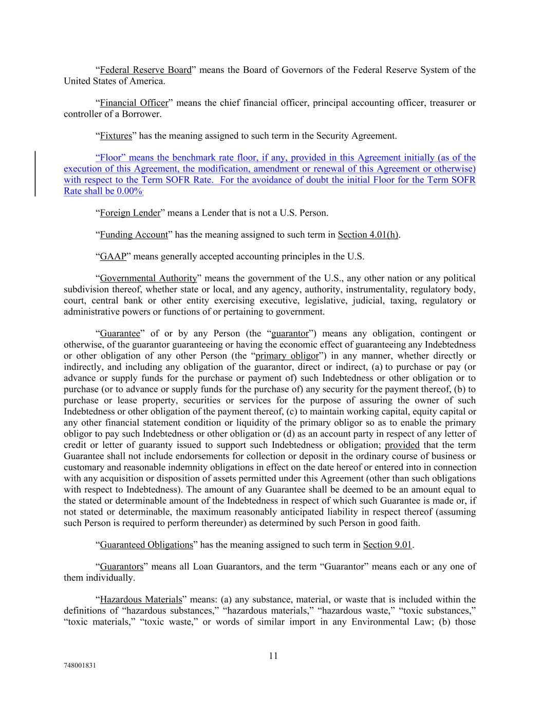“Federal Reserve Board” means the Board of Governors of the Federal Reserve System of the United States of America. “Financial Officer” means the chief financial officer, principal accounting officer, treasurer or controller of a Borrower. “Fixtures” has the meaning assigned to such term in the Security Agreement. “Floor” means the benchmark rate floor, if any, provided in this Agreement initially (as of the execution of this Agreement, the modification, amendment or renewal of this Agreement or otherwise) with respect to the Term SOFR Rate. For the avoidance of doubt the initial Floor for the Term SOFR Rate shall be 0.00%. “Foreign Lender” means a Lender that is not a U.S. Person. “Funding Account” has the meaning assigned to such term in Section 4.01(h). “GAAP” means generally accepted accounting principles in the U.S. “Governmental Authority” means the government of the U.S., any other nation or any political subdivision thereof, whether state or local, and any agency, authority, instrumentality, regulatory body, court, central bank or other entity exercising executive, legislative, judicial, taxing, regulatory or administrative powers or functions of or pertaining to government. “Guarantee” of or by any Person (the “guarantor”) means any obligation, contingent or otherwise, of the guarantor guaranteeing or having the economic effect of guaranteeing any Indebtedness or other obligation of any other Person (the “primary obligor”) in any manner, whether directly or indirectly, and including any obligation of the guarantor, direct or indirect, (a) to purchase or pay (or advance or supply funds for the purchase or payment of) such Indebtedness or other obligation or to purchase (or to advance or supply funds for the purchase of) any security for the payment thereof, (b) to purchase or lease property, securities or services for the purpose of assuring the owner of such Indebtedness or other obligation of the payment thereof, (c) to maintain working capital, equity capital or any other financial statement condition or liquidity of the primary obligor so as to enable the primary obligor to pay such Indebtedness or other obligation or (d) as an account party in respect of any letter of credit or letter of guaranty issued to support such Indebtedness or obligation; provided that the term Guarantee shall not include endorsements for collection or deposit in the ordinary course of business or customary and reasonable indemnity obligations in effect on the date hereof or entered into in connection with any acquisition or disposition of assets permitted under this Agreement (other than such obligations with respect to Indebtedness). The amount of any Guarantee shall be deemed to be an amount equal to the stated or determinable amount of the Indebtedness in respect of which such Guarantee is made or, if not stated or determinable, the maximum reasonably anticipated liability in respect thereof (assuming such Person is required to perform thereunder) as determined by such Person in good faith. “Guaranteed Obligations” has the meaning assigned to such term in Section 9.01. “Guarantors” means all Loan Guarantors, and the term “Guarantor” means each or any one of them individually. “Hazardous Materials” means: (a) any substance, material, or waste that is included within the definitions of “hazardous substances,” “hazardous materials,” “hazardous waste,” “toxic substances,” “toxic materials,” “toxic waste,” or words of similar import in any Environmental Law; (b) those 11 748001831