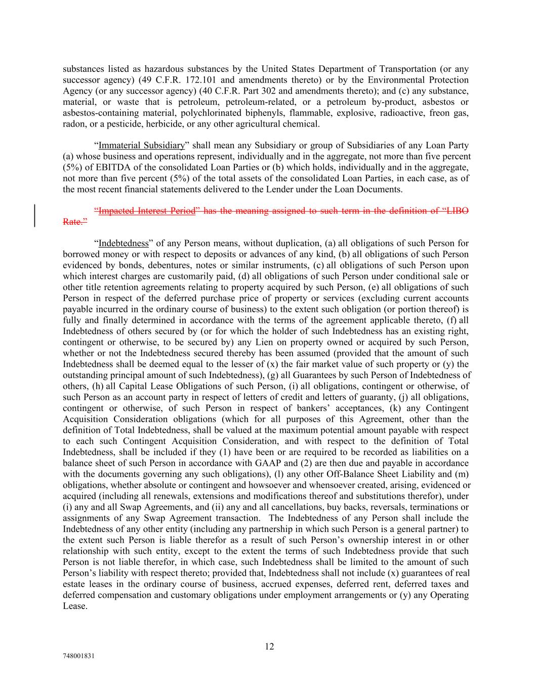 substances listed as hazardous substances by the United States Department of Transportation (or any successor agency) (49 C.F.R. 172.101 and amendments thereto) or by the Environmental Protection Agency (or any successor agency) (40 C.F.R. Part 302 and amendments thereto); and (c) any substance, material, or waste that is petroleum, petroleum-related, or a petroleum by-product, asbestos or asbestos-containing material, polychlorinated biphenyls, flammable, explosive, radioactive, freon gas, radon, or a pesticide, herbicide, or any other agricultural chemical. “Immaterial Subsidiary” shall mean any Subsidiary or group of Subsidiaries of any Loan Party (a) whose business and operations represent, individually and in the aggregate, not more than five percent (5%) of EBITDA of the consolidated Loan Parties or (b) which holds, individually and in the aggregate, not more than five percent (5%) of the total assets of the consolidated Loan Parties, in each case, as of the most recent financial statements delivered to the Lender under the Loan Documents. “Impacted Interest Period” has the meaning assigned to such term in the definition of “LIBO Rate.” “Indebtedness” of any Person means, without duplication, (a) all obligations of such Person for borrowed money or with respect to deposits or advances of any kind, (b) all obligations of such Person evidenced by bonds, debentures, notes or similar instruments, (c) all obligations of such Person upon which interest charges are customarily paid, (d) all obligations of such Person under conditional sale or other title retention agreements relating to property acquired by such Person, (e) all obligations of such Person in respect of the deferred purchase price of property or services (excluding current accounts payable incurred in the ordinary course of business) to the extent such obligation (or portion thereof) is fully and finally determined in accordance with the terms of the agreement applicable thereto, (f) all Indebtedness of others secured by (or for which the holder of such Indebtedness has an existing right, contingent or otherwise, to be secured by) any Lien on property owned or acquired by such Person, whether or not the Indebtedness secured thereby has been assumed (provided that the amount of such Indebtedness shall be deemed equal to the lesser of (x) the fair market value of such property or (y) the outstanding principal amount of such Indebtedness), (g) all Guarantees by such Person of Indebtedness of others, (h) all Capital Lease Obligations of such Person, (i) all obligations, contingent or otherwise, of such Person as an account party in respect of letters of credit and letters of guaranty, (j) all obligations, contingent or otherwise, of such Person in respect of bankers’ acceptances, (k) any Contingent Acquisition Consideration obligations (which for all purposes of this Agreement, other than the definition of Total Indebtedness, shall be valued at the maximum potential amount payable with respect to each such Contingent Acquisition Consideration, and with respect to the definition of Total Indebtedness, shall be included if they (1) have been or are required to be recorded as liabilities on a balance sheet of such Person in accordance with GAAP and (2) are then due and payable in accordance with the documents governing any such obligations), (l) any other Off-Balance Sheet Liability and (m) obligations, whether absolute or contingent and howsoever and whensoever created, arising, evidenced or acquired (including all renewals, extensions and modifications thereof and substitutions therefor), under (i) any and all Swap Agreements, and (ii) any and all cancellations, buy backs, reversals, terminations or assignments of any Swap Agreement transaction. The Indebtedness of any Person shall include the Indebtedness of any other entity (including any partnership in which such Person is a general partner) to the extent such Person is liable therefor as a result of such Person’s ownership interest in or other relationship with such entity, except to the extent the terms of such Indebtedness provide that such Person is not liable therefor, in which case, such Indebtedness shall be limited to the amount of such Person’s liability with respect thereto; provided that, Indebtedness shall not include (x) guarantees of real estate leases in the ordinary course of business, accrued expenses, deferred rent, deferred taxes and deferred compensation and customary obligations under employment arrangements or (y) any Operating Lease. 12 748001831