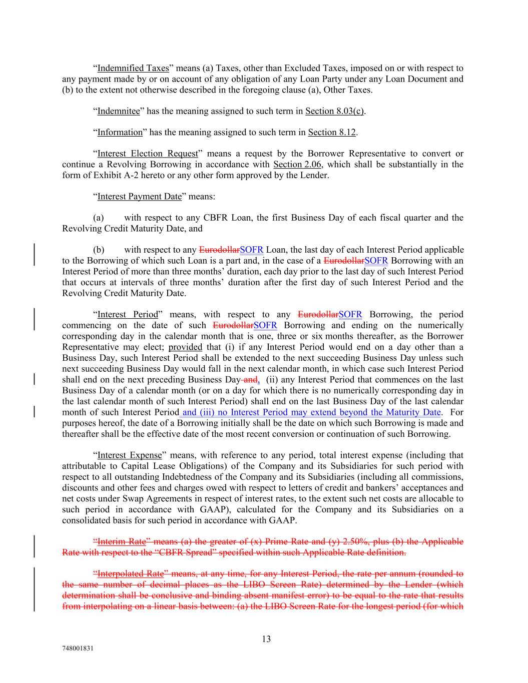 “Indemnified Taxes” means (a) Taxes, other than Excluded Taxes, imposed on or with respect to any payment made by or on account of any obligation of any Loan Party under any Loan Document and (b) to the extent not otherwise described in the foregoing clause (a), Other Taxes. “Indemnitee” has the meaning assigned to such term in Section 8.03(c). “Information” has the meaning assigned to such term in Section 8.12. “Interest Election Request” means a request by the Borrower Representative to convert or continue a Revolving Borrowing in accordance with Section 2.06, which shall be substantially in the form of Exhibit A-2 hereto or any other form approved by the Lender. “Interest Payment Date” means: (a) with respect to any CBFR Loan, the first Business Day of each fiscal quarter and the Revolving Credit Maturity Date, and (b) with respect to any EurodollarSOFR Loan, the last day of each Interest Period applicable to the Borrowing of which such Loan is a part and, in the case of a EurodollarSOFR Borrowing with an Interest Period of more than three months’ duration, each day prior to the last day of such Interest Period that occurs at intervals of three months’ duration after the first day of such Interest Period and the Revolving Credit Maturity Date. “Interest Period” means, with respect to any EurodollarSOFR Borrowing, the period commencing on the date of such EurodollarSOFR Borrowing and ending on the numerically corresponding day in the calendar month that is one, three or six months thereafter, as the Borrower Representative may elect; provided that (i) if any Interest Period would end on a day other than a Business Day, such Interest Period shall be extended to the next succeeding Business Day unless such next succeeding Business Day would fall in the next calendar month, in which case such Interest Period shall end on the next preceding Business Day and, (ii) any Interest Period that commences on the last Business Day of a calendar month (or on a day for which there is no numerically corresponding day in the last calendar month of such Interest Period) shall end on the last Business Day of the last calendar month of such Interest Period and (iii) no Interest Period may extend beyond the Maturity Date. For purposes hereof, the date of a Borrowing initially shall be the date on which such Borrowing is made and thereafter shall be the effective date of the most recent conversion or continuation of such Borrowing. “Interest Expense” means, with reference to any period, total interest expense (including that attributable to Capital Lease Obligations) of the Company and its Subsidiaries for such period with respect to all outstanding Indebtedness of the Company and its Subsidiaries (including all commissions, discounts and other fees and charges owed with respect to letters of credit and bankers’ acceptances and net costs under Swap Agreements in respect of interest rates, to the extent such net costs are allocable to such period in accordance with GAAP), calculated for the Company and its Subsidiaries on a consolidated basis for such period in accordance with GAAP. “Interim Rate” means (a) the greater of (x) Prime Rate and (y) 2.50%, plus (b) the Applicable Rate with respect to the “CBFR Spread” specified within such Applicable Rate definition. “Interpolated Rate” means, at any time, for any Interest Period, the rate per annum (rounded to the same number of decimal places as the LIBO Screen Rate) determined by the Lender (which determination shall be conclusive and binding absent manifest error) to be equal to the rate that results from interpolating on a linear basis between: (a) the LIBO Screen Rate for the longest period (for which 13 748001831