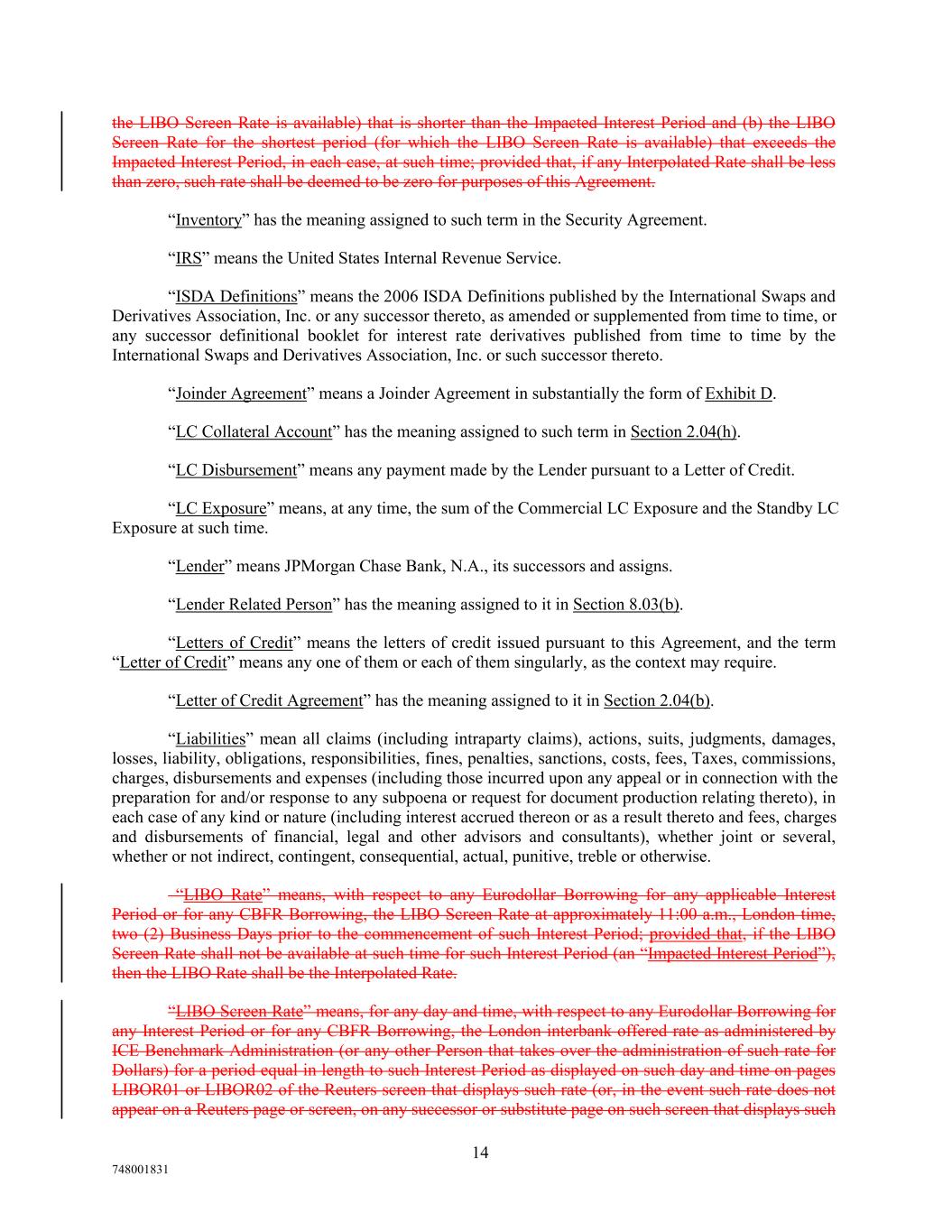 the LIBO Screen Rate is available) that is shorter than the Impacted Interest Period and (b) the LIBO Screen Rate for the shortest period (for which the LIBO Screen Rate is available) that exceeds the Impacted Interest Period, in each case, at such time; provided that, if any Interpolated Rate shall be less than zero, such rate shall be deemed to be zero for purposes of this Agreement. “Inventory” has the meaning assigned to such term in the Security Agreement. “IRS” means the United States Internal Revenue Service. “ISDA Definitions” means the 2006 ISDA Definitions published by the International Swaps and Derivatives Association, Inc. or any successor thereto, as amended or supplemented from time to time, or any successor definitional booklet for interest rate derivatives published from time to time by the International Swaps and Derivatives Association, Inc. or such successor thereto. “Joinder Agreement” means a Joinder Agreement in substantially the form of Exhibit D. “LC Collateral Account” has the meaning assigned to such term in Section 2.04(h). “LC Disbursement” means any payment made by the Lender pursuant to a Letter of Credit. “LC Exposure” means, at any time, the sum of the Commercial LC Exposure and the Standby LC Exposure at such time. “Lender” means JPMorgan Chase Bank, N.A., its successors and assigns. “Lender Related Person” has the meaning assigned to it in Section 8.03(b). “Letters of Credit” means the letters of credit issued pursuant to this Agreement, and the term “Letter of Credit” means any one of them or each of them singularly, as the context may require. “Letter of Credit Agreement” has the meaning assigned to it in Section 2.04(b). “Liabilities” mean all claims (including intraparty claims), actions, suits, judgments, damages, losses, liability, obligations, responsibilities, fines, penalties, sanctions, costs, fees, Taxes, commissions, charges, disbursements and expenses (including those incurred upon any appeal or in connection with the preparation for and/or response to any subpoena or request for document production relating thereto), in each case of any kind or nature (including interest accrued thereon or as a result thereto and fees, charges and disbursements of financial, legal and other advisors and consultants), whether joint or several, whether or not indirect, contingent, consequential, actual, punitive, treble or otherwise. “LIBO Rate” means, with respect to any Eurodollar Borrowing for any applicable Interest Period or for any CBFR Borrowing, the LIBO Screen Rate at approximately 11:00 a.m., London time, two (2) Business Days prior to the commencement of such Interest Period; provided that, if the LIBO Screen Rate shall not be available at such time for such Interest Period (an “Impacted Interest Period”), then the LIBO Rate shall be the Interpolated Rate. “LIBO Screen Rate” means, for any day and time, with respect to any Eurodollar Borrowing for any Interest Period or for any CBFR Borrowing, the London interbank offered rate as administered by ICE Benchmark Administration (or any other Person that takes over the administration of such rate for Dollars) for a period equal in length to such Interest Period as displayed on such day and time on pages LIBOR01 or LIBOR02 of the Reuters screen that displays such rate (or, in the event such rate does not appear on a Reuters page or screen, on any successor or substitute page on such screen that displays such 14 748001831