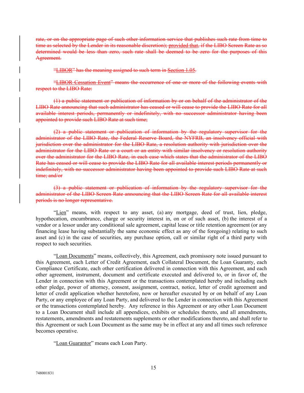 rate, or on the appropriate page of such other information service that publishes such rate from time to time as selected by the Lender in its reasonable discretion); provided that, if the LIBO Screen Rate as so determined would be less than zero, such rate shall be deemed to be zero for the purposes of this Agreement. “LIBOR” has the meaning assigned to such term in Section 1.05. “LIBOR Cessation Event” means the occurrence of one or more of the following events with respect to the LIBO Rate: (1) a public statement or publication of information by or on behalf of the administrator of the LIBO Rate announcing that such administrator has ceased or will cease to provide the LIBO Rate for all available interest periods, permanently or indefinitely, with no successor administrator having been appointed to provide such LIBO Rate at such time; (2) a public statement or publication of information by the regulatory supervisor for the administrator of the LIBO Rate, the Federal Reserve Board, the NYFRB, an insolvency official with jurisdiction over the administrator for the LIBO Rate, a resolution authority with jurisdiction over the administrator for the LIBO Rate or a court or an entity with similar insolvency or resolution authority over the administrator for the LIBO Rate, in each case which states that the administrator of the LIBO Rate has ceased or will cease to provide the LIBO Rate for all available interest periods permanently or indefinitely, with no successor administrator having been appointed to provide such LIBO Rate at such time; and/or (3) a public statement or publication of information by the regulatory supervisor for the administrator of the LIBO Screen Rate announcing that the LIBO Screen Rate for all available interest periods is no longer representative. “Lien” means, with respect to any asset, (a) any mortgage, deed of trust, lien, pledge, hypothecation, encumbrance, charge or security interest in, on or of such asset, (b) the interest of a vendor or a lessor under any conditional sale agreement, capital lease or title retention agreement (or any financing lease having substantially the same economic effect as any of the foregoing) relating to such asset and (c) in the case of securities, any purchase option, call or similar right of a third party with respect to such securities. “Loan Documents” means, collectively, this Agreement, each promissory note issued pursuant to this Agreement, each Letter of Credit Agreement, each Collateral Document, the Loan Guaranty, each Compliance Certificate, each other certification delivered in connection with this Agreement, and each other agreement, instrument, document and certificate executed and delivered to, or in favor of, the Lender in connection with this Agreement or the transactions contemplated hereby and including each other pledge, power of attorney, consent, assignment, contract, notice, letter of credit agreement and letter of credit application whether heretofore, now or hereafter executed by or on behalf of any Loan Party, or any employee of any Loan Party, and delivered to the Lender in connection with this Agreement or the transactions contemplated hereby. Any reference in this Agreement or any other Loan Document to a Loan Document shall include all appendices, exhibits or schedules thereto, and all amendments, restatements, amendments and restatements supplements or other modifications thereto, and shall refer to this Agreement or such Loan Document as the same may be in effect at any and all times such reference becomes operative. “Loan Guarantor” means each Loan Party. 15 748001831