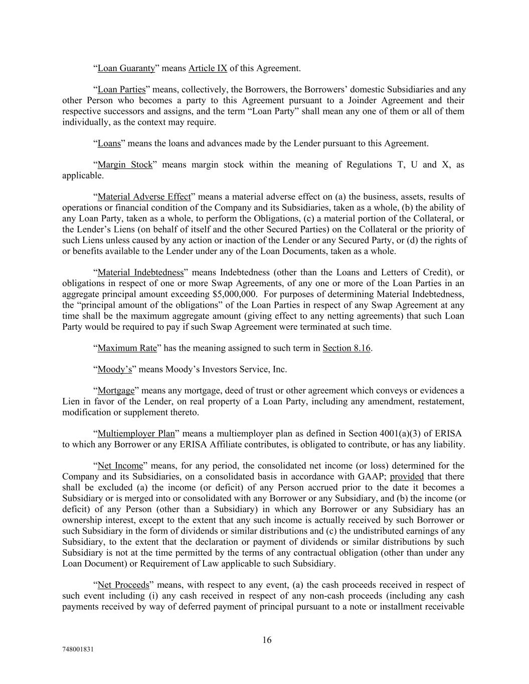 “Loan Guaranty” means Article IX of this Agreement. “Loan Parties” means, collectively, the Borrowers, the Borrowers’ domestic Subsidiaries and any other Person who becomes a party to this Agreement pursuant to a Joinder Agreement and their respective successors and assigns, and the term “Loan Party” shall mean any one of them or all of them individually, as the context may require. “Loans” means the loans and advances made by the Lender pursuant to this Agreement. “Margin Stock” means margin stock within the meaning of Regulations T, U and X, as applicable. “Material Adverse Effect” means a material adverse effect on (a) the business, assets, results of operations or financial condition of the Company and its Subsidiaries, taken as a whole, (b) the ability of any Loan Party, taken as a whole, to perform the Obligations, (c) a material portion of the Collateral, or the Lender’s Liens (on behalf of itself and the other Secured Parties) on the Collateral or the priority of such Liens unless caused by any action or inaction of the Lender or any Secured Party, or (d) the rights of or benefits available to the Lender under any of the Loan Documents, taken as a whole. “Material Indebtedness” means Indebtedness (other than the Loans and Letters of Credit), or obligations in respect of one or more Swap Agreements, of any one or more of the Loan Parties in an aggregate principal amount exceeding $5,000,000. For purposes of determining Material Indebtedness, the “principal amount of the obligations” of the Loan Parties in respect of any Swap Agreement at any time shall be the maximum aggregate amount (giving effect to any netting agreements) that such Loan Party would be required to pay if such Swap Agreement were terminated at such time. “Maximum Rate” has the meaning assigned to such term in Section 8.16. “Moody’s” means Moody’s Investors Service, Inc. “Mortgage” means any mortgage, deed of trust or other agreement which conveys or evidences a Lien in favor of the Lender, on real property of a Loan Party, including any amendment, restatement, modification or supplement thereto. “Multiemployer Plan” means a multiemployer plan as defined in Section 4001(a)(3) of ERISA to which any Borrower or any ERISA Affiliate contributes, is obligated to contribute, or has any liability. “Net Income” means, for any period, the consolidated net income (or loss) determined for the Company and its Subsidiaries, on a consolidated basis in accordance with GAAP; provided that there shall be excluded (a) the income (or deficit) of any Person accrued prior to the date it becomes a Subsidiary or is merged into or consolidated with any Borrower or any Subsidiary, and (b) the income (or deficit) of any Person (other than a Subsidiary) in which any Borrower or any Subsidiary has an ownership interest, except to the extent that any such income is actually received by such Borrower or such Subsidiary in the form of dividends or similar distributions and (c) the undistributed earnings of any Subsidiary, to the extent that the declaration or payment of dividends or similar distributions by such Subsidiary is not at the time permitted by the terms of any contractual obligation (other than under any Loan Document) or Requirement of Law applicable to such Subsidiary. “Net Proceeds” means, with respect to any event, (a) the cash proceeds received in respect of such event including (i) any cash received in respect of any non-cash proceeds (including any cash payments received by way of deferred payment of principal pursuant to a note or installment receivable 16 748001831