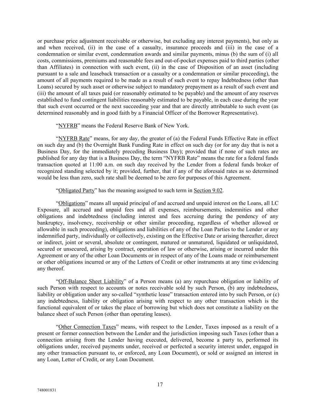 or purchase price adjustment receivable or otherwise, but excluding any interest payments), but only as and when received, (ii) in the case of a casualty, insurance proceeds and (iii) in the case of a condemnation or similar event, condemnation awards and similar payments, minus (b) the sum of (i) all costs, commissions, premiums and reasonable fees and out-of-pocket expenses paid to third parties (other than Affiliates) in connection with such event, (ii) in the case of Disposition of an asset (including pursuant to a sale and leaseback transaction or a casualty or a condemnation or similar proceeding), the amount of all payments required to be made as a result of such event to repay Indebtedness (other than Loans) secured by such asset or otherwise subject to mandatory prepayment as a result of such event and (iii) the amount of all taxes paid (or reasonably estimated to be payable) and the amount of any reserves established to fund contingent liabilities reasonably estimated to be payable, in each case during the year that such event occurred or the next succeeding year and that are directly attributable to such event (as determined reasonably and in good faith by a Financial Officer of the Borrower Representative). “NYFRB” means the Federal Reserve Bank of New York. “NYFRB Rate” means, for any day, the greater of (a) the Federal Funds Effective Rate in effect on such day and (b) the Overnight Bank Funding Rate in effect on such day (or for any day that is not a Business Day, for the immediately preceding Business Day); provided that if none of such rates are published for any day that is a Business Day, the term “NYFRB Rate” means the rate for a federal funds transaction quoted at 11:00 a.m. on such day received by the Lender from a federal funds broker of recognized standing selected by it; provided, further, that if any of the aforesaid rates as so determined would be less than zero, such rate shall be deemed to be zero for purposes of this Agreement. “Obligated Party” has the meaning assigned to such term in Section 9.02. “Obligations” means all unpaid principal of and accrued and unpaid interest on the Loans, all LC Exposure, all accrued and unpaid fees and all expenses, reimbursements, indemnities and other obligations and indebtedness (including interest and fees accruing during the pendency of any bankruptcy, insolvency, receivership or other similar proceeding, regardless of whether allowed or allowable in such proceeding), obligations and liabilities of any of the Loan Parties to the Lender or any indemnified party, individually or collectively, existing on the Effective Date or arising thereafter, direct or indirect, joint or several, absolute or contingent, matured or unmatured, liquidated or unliquidated, secured or unsecured, arising by contract, operation of law or otherwise, arising or incurred under this Agreement or any of the other Loan Documents or in respect of any of the Loans made or reimbursement or other obligations incurred or any of the Letters of Credit or other instruments at any time evidencing any thereof. “Off-Balance Sheet Liability” of a Person means (a) any repurchase obligation or liability of such Person with respect to accounts or notes receivable sold by such Person, (b) any indebtedness, liability or obligation under any so-called “synthetic lease” transaction entered into by such Person, or (c) any indebtedness, liability or obligation arising with respect to any other transaction which is the functional equivalent of or takes the place of borrowing but which does not constitute a liability on the balance sheet of such Person (other than operating leases). “Other Connection Taxes” means, with respect to the Lender, Taxes imposed as a result of a present or former connection between the Lender and the jurisdiction imposing such Taxes (other than a connection arising from the Lender having executed, delivered, become a party to, performed its obligations under, received payments under, received or perfected a security interest under, engaged in any other transaction pursuant to, or enforced, any Loan Document), or sold or assigned an interest in any Loan, Letter of Credit, or any Loan Document. 17 748001831
