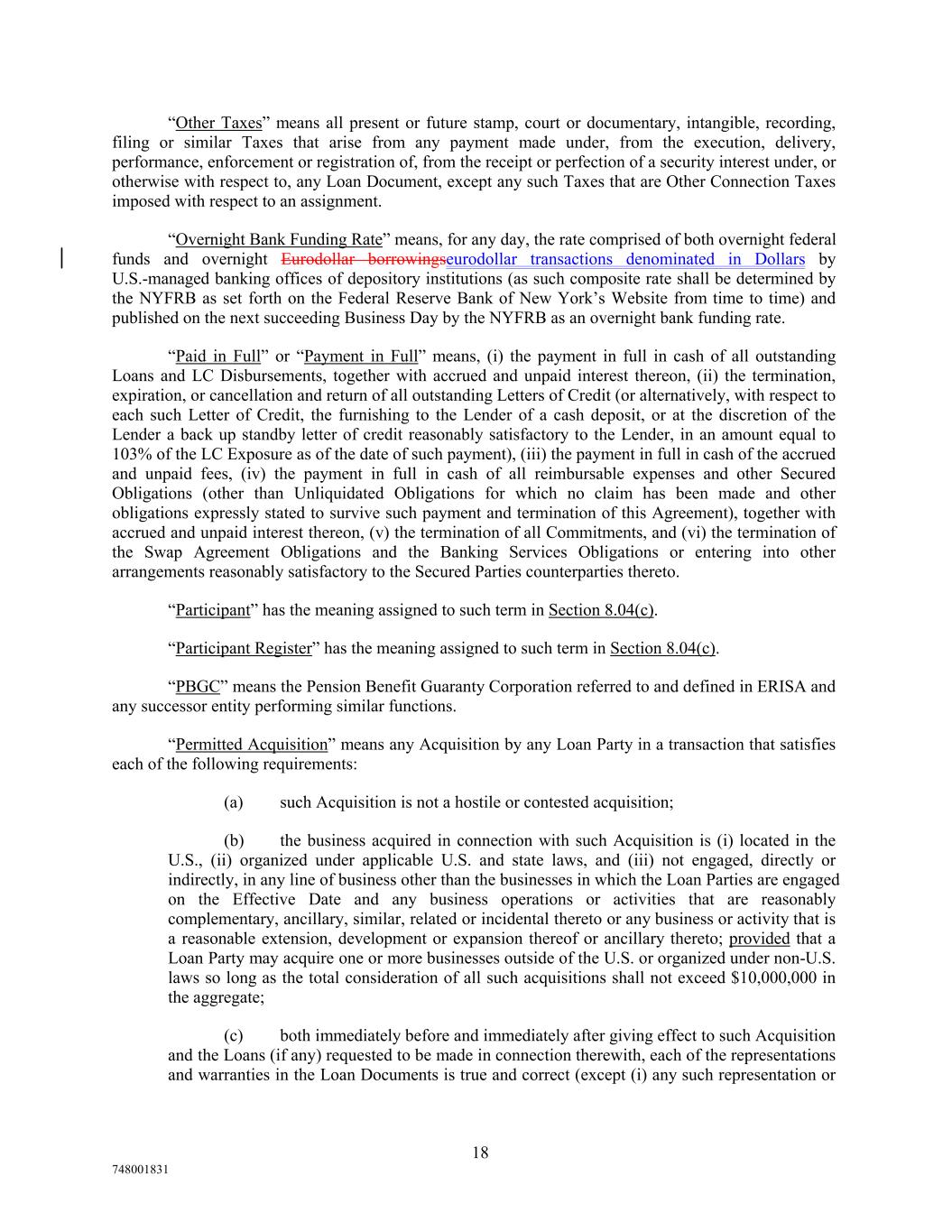 “Other Taxes” means all present or future stamp, court or documentary, intangible, recording, filing or similar Taxes that arise from any payment made under, from the execution, delivery, performance, enforcement or registration of, from the receipt or perfection of a security interest under, or otherwise with respect to, any Loan Document, except any such Taxes that are Other Connection Taxes imposed with respect to an assignment. “Overnight Bank Funding Rate” means, for any day, the rate comprised of both overnight federal funds and overnight Eurodollar borrowingseurodollar transactions denominated in Dollars by U.S.-managed banking offices of depository institutions (as such composite rate shall be determined by the NYFRB as set forth on the Federal Reserve Bank of New York’s Website from time to time) and published on the next succeeding Business Day by the NYFRB as an overnight bank funding rate. “Paid in Full” or “Payment in Full” means, (i) the payment in full in cash of all outstanding Loans and LC Disbursements, together with accrued and unpaid interest thereon, (ii) the termination, expiration, or cancellation and return of all outstanding Letters of Credit (or alternatively, with respect to each such Letter of Credit, the furnishing to the Lender of a cash deposit, or at the discretion of the Lender a back up standby letter of credit reasonably satisfactory to the Lender, in an amount equal to 103% of the LC Exposure as of the date of such payment), (iii) the payment in full in cash of the accrued and unpaid fees, (iv) the payment in full in cash of all reimbursable expenses and other Secured Obligations (other than Unliquidated Obligations for which no claim has been made and other obligations expressly stated to survive such payment and termination of this Agreement), together with accrued and unpaid interest thereon, (v) the termination of all Commitments, and (vi) the termination of the Swap Agreement Obligations and the Banking Services Obligations or entering into other arrangements reasonably satisfactory to the Secured Parties counterparties thereto. “Participant” has the meaning assigned to such term in Section 8.04(c). “Participant Register” has the meaning assigned to such term in Section 8.04(c). “PBGC” means the Pension Benefit Guaranty Corporation referred to and defined in ERISA and any successor entity performing similar functions. “Permitted Acquisition” means any Acquisition by any Loan Party in a transaction that satisfies each of the following requirements: (a) such Acquisition is not a hostile or contested acquisition; (b) the business acquired in connection with such Acquisition is (i) located in the U.S., (ii) organized under applicable U.S. and state laws, and (iii) not engaged, directly or indirectly, in any line of business other than the businesses in which the Loan Parties are engaged on the Effective Date and any business operations or activities that are reasonably complementary, ancillary, similar, related or incidental thereto or any business or activity that is a reasonable extension, development or expansion thereof or ancillary thereto; provided that a Loan Party may acquire one or more businesses outside of the U.S. or organized under non-U.S. laws so long as the total consideration of all such acquisitions shall not exceed $10,000,000 in the aggregate; (c) both immediately before and immediately after giving effect to such Acquisition and the Loans (if any) requested to be made in connection therewith, each of the representations and warranties in the Loan Documents is true and correct (except (i) any such representation or 18 748001831