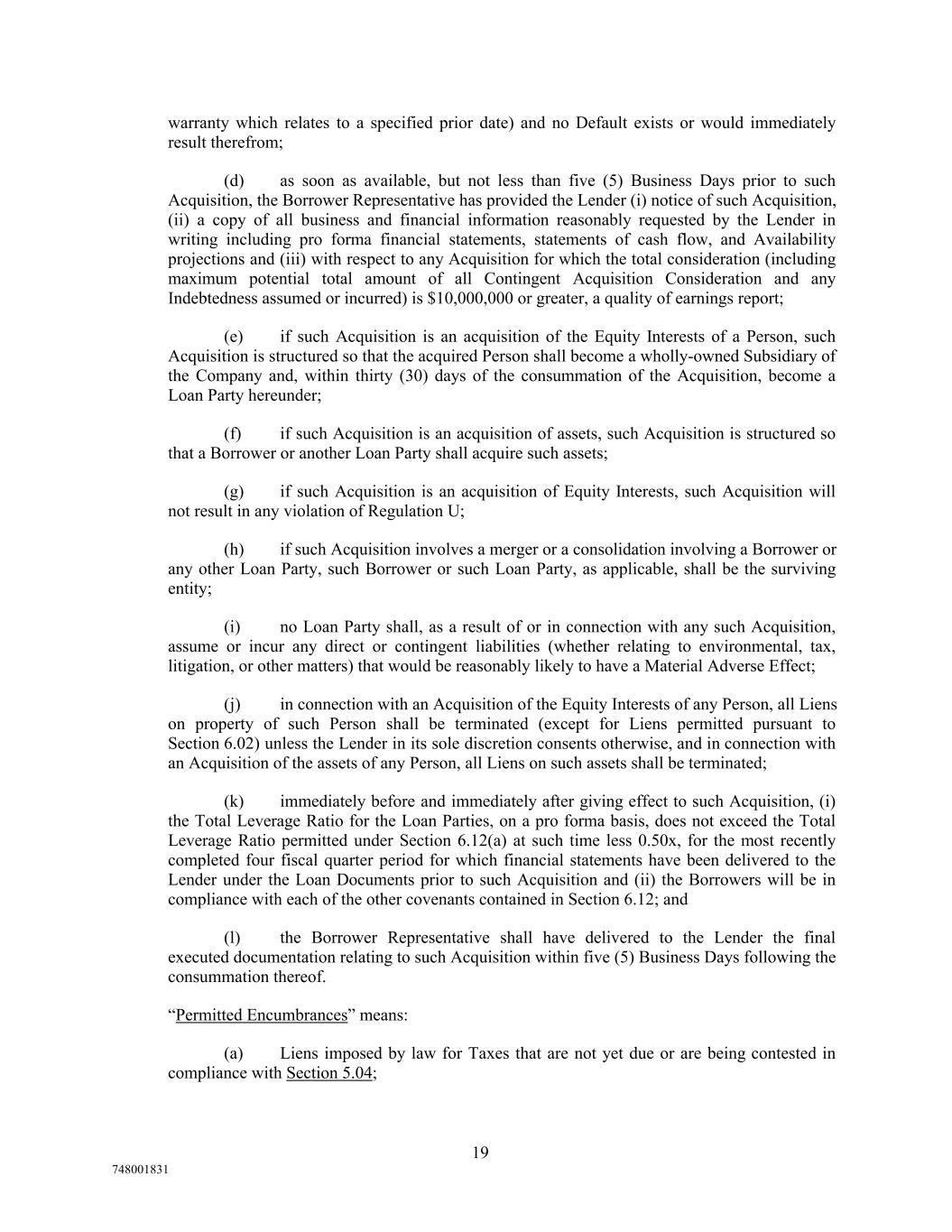 warranty which relates to a specified prior date) and no Default exists or would immediately result therefrom; (d) as soon as available, but not less than five (5) Business Days prior to such Acquisition, the Borrower Representative has provided the Lender (i) notice of such Acquisition, (ii) a copy of all business and financial information reasonably requested by the Lender in writing including pro forma financial statements, statements of cash flow, and Availability projections and (iii) with respect to any Acquisition for which the total consideration (including maximum potential total amount of all Contingent Acquisition Consideration and any Indebtedness assumed or incurred) is $10,000,000 or greater, a quality of earnings report; (e) if such Acquisition is an acquisition of the Equity Interests of a Person, such Acquisition is structured so that the acquired Person shall become a wholly-owned Subsidiary of the Company and, within thirty (30) days of the consummation of the Acquisition, become a Loan Party hereunder; (f) if such Acquisition is an acquisition of assets, such Acquisition is structured so that a Borrower or another Loan Party shall acquire such assets; (g) if such Acquisition is an acquisition of Equity Interests, such Acquisition will not result in any violation of Regulation U; (h) if such Acquisition involves a merger or a consolidation involving a Borrower or any other Loan Party, such Borrower or such Loan Party, as applicable, shall be the surviving entity; (i) no Loan Party shall, as a result of or in connection with any such Acquisition, assume or incur any direct or contingent liabilities (whether relating to environmental, tax, litigation, or other matters) that would be reasonably likely to have a Material Adverse Effect; (j) in connection with an Acquisition of the Equity Interests of any Person, all Liens on property of such Person shall be terminated (except for Liens permitted pursuant to Section 6.02) unless the Lender in its sole discretion consents otherwise, and in connection with an Acquisition of the assets of any Person, all Liens on such assets shall be terminated; (k) immediately before and immediately after giving effect to such Acquisition, (i) the Total Leverage Ratio for the Loan Parties, on a pro forma basis, does not exceed the Total Leverage Ratio permitted under Section 6.12(a) at such time less 0.50x, for the most recently completed four fiscal quarter period for which financial statements have been delivered to the Lender under the Loan Documents prior to such Acquisition and (ii) the Borrowers will be in compliance with each of the other covenants contained in Section 6.12; and (l) the Borrower Representative shall have delivered to the Lender the final executed documentation relating to such Acquisition within five (5) Business Days following the consummation thereof. “Permitted Encumbrances” means: (a) Liens imposed by law for Taxes that are not yet due or are being contested in compliance with Section 5.04; 19 748001831