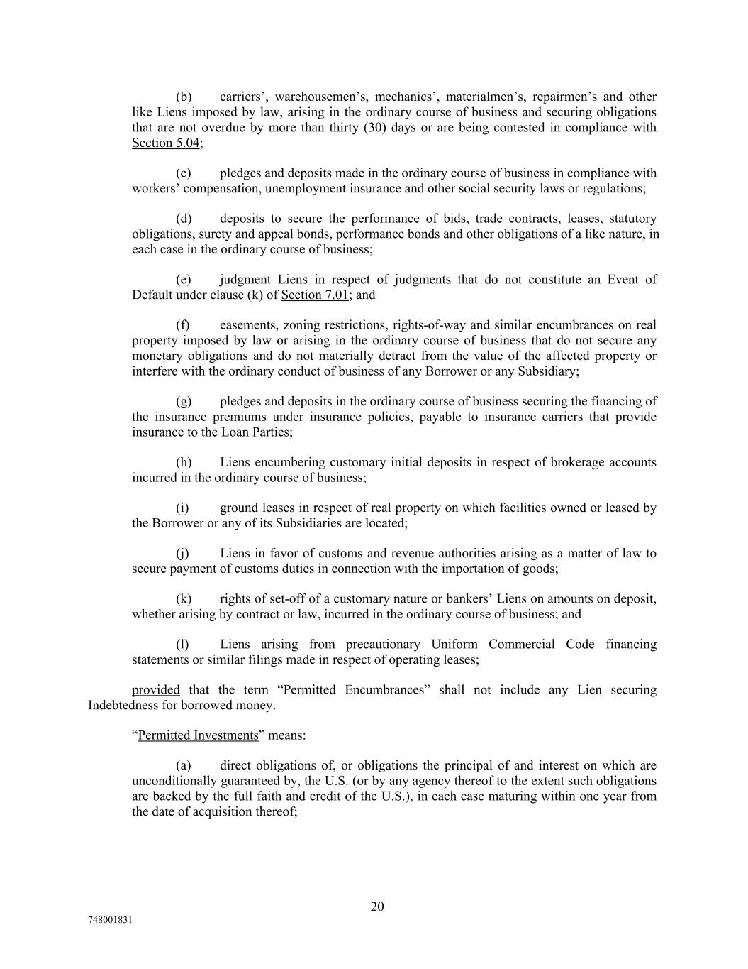 (b) carriers’, warehousemen’s, mechanics’, materialmen’s, repairmen’s and other like Liens imposed by law, arising in the ordinary course of business and securing obligations that are not overdue by more than thirty (30) days or are being contested in compliance with Section 5.04; (c) pledges and deposits made in the ordinary course of business in compliance with workers’ compensation, unemployment insurance and other social security laws or regulations; (d) deposits to secure the performance of bids, trade contracts, leases, statutory obligations, surety and appeal bonds, performance bonds and other obligations of a like nature, in each case in the ordinary course of business; (e) judgment Liens in respect of judgments that do not constitute an Event of Default under clause (k) of Section 7.01; and (f) easements, zoning restrictions, rights-of-way and similar encumbrances on real property imposed by law or arising in the ordinary course of business that do not secure any monetary obligations and do not materially detract from the value of the affected property or interfere with the ordinary conduct of business of any Borrower or any Subsidiary; (g) pledges and deposits in the ordinary course of business securing the financing of the insurance premiums under insurance policies, payable to insurance carriers that provide insurance to the Loan Parties; (h) Liens encumbering customary initial deposits in respect of brokerage accounts incurred in the ordinary course of business; (i) ground leases in respect of real property on which facilities owned or leased by the Borrower or any of its Subsidiaries are located; (j) Liens in favor of customs and revenue authorities arising as a matter of law to secure payment of customs duties in connection with the importation of goods; (k) rights of set-off of a customary nature or bankers’ Liens on amounts on deposit, whether arising by contract or law, incurred in the ordinary course of business; and (l) Liens arising from precautionary Uniform Commercial Code financing statements or similar filings made in respect of operating leases; provided that the term “Permitted Encumbrances” shall not include any Lien securing Indebtedness for borrowed money. “Permitted Investments” means: (a) direct obligations of, or obligations the principal of and interest on which are unconditionally guaranteed by, the U.S. (or by any agency thereof to the extent such obligations are backed by the full faith and credit of the U.S.), in each case maturing within one year from the date of acquisition thereof; 20 748001831