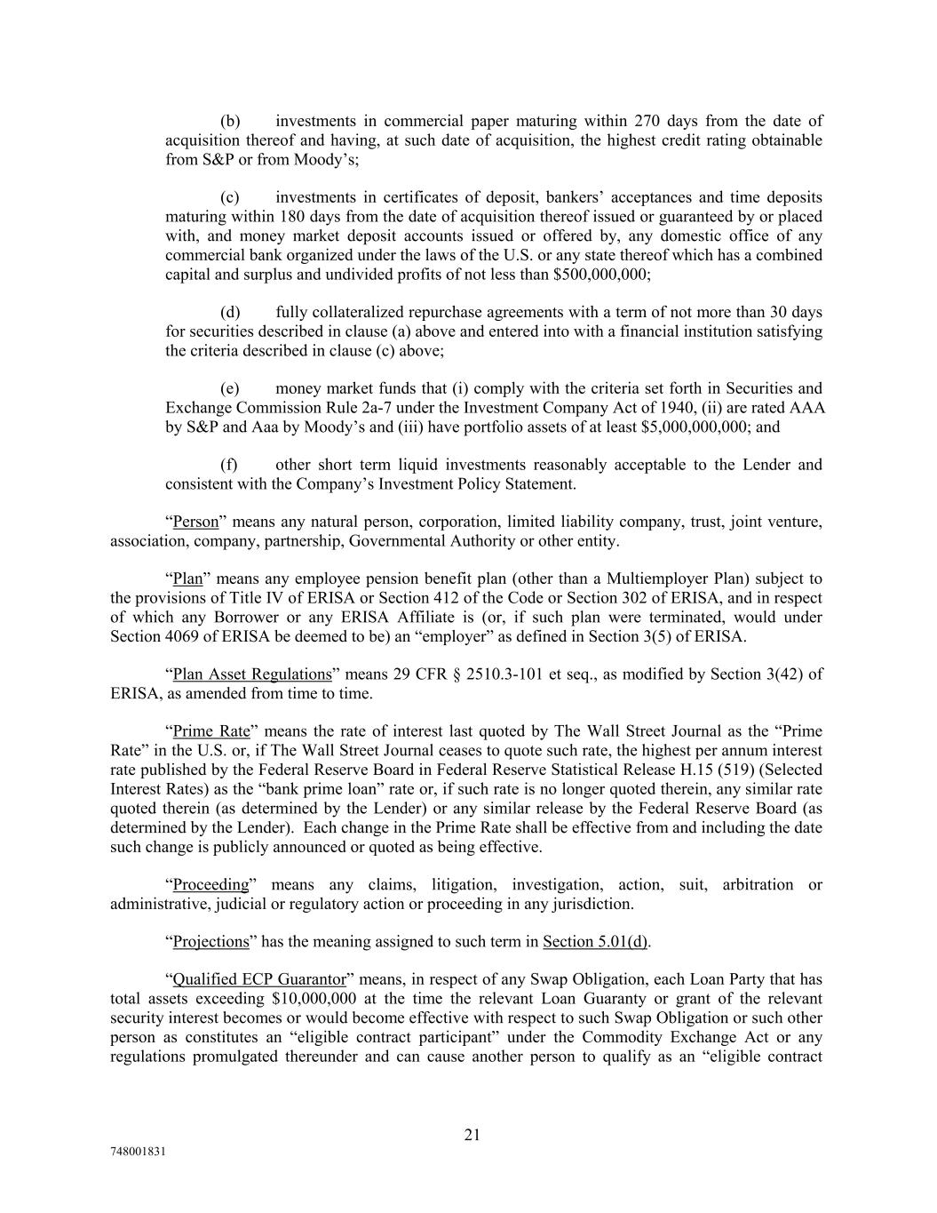 (b) investments in commercial paper maturing within 270 days from the date of acquisition thereof and having, at such date of acquisition, the highest credit rating obtainable from S&P or from Moody’s; (c) investments in certificates of deposit, bankers’ acceptances and time deposits maturing within 180 days from the date of acquisition thereof issued or guaranteed by or placed with, and money market deposit accounts issued or offered by, any domestic office of any commercial bank organized under the laws of the U.S. or any state thereof which has a combined capital and surplus and undivided profits of not less than $500,000,000; (d) fully collateralized repurchase agreements with a term of not more than 30 days for securities described in clause (a) above and entered into with a financial institution satisfying the criteria described in clause (c) above; (e) money market funds that (i) comply with the criteria set forth in Securities and Exchange Commission Rule 2a-7 under the Investment Company Act of 1940, (ii) are rated AAA by S&P and Aaa by Moody’s and (iii) have portfolio assets of at least $5,000,000,000; and (f) other short term liquid investments reasonably acceptable to the Lender and consistent with the Company’s Investment Policy Statement. “Person” means any natural person, corporation, limited liability company, trust, joint venture, association, company, partnership, Governmental Authority or other entity. “Plan” means any employee pension benefit plan (other than a Multiemployer Plan) subject to the provisions of Title IV of ERISA or Section 412 of the Code or Section 302 of ERISA, and in respect of which any Borrower or any ERISA Affiliate is (or, if such plan were terminated, would under Section 4069 of ERISA be deemed to be) an “employer” as defined in Section 3(5) of ERISA. “Plan Asset Regulations” means 29 CFR § 2510.3-101 et seq., as modified by Section 3(42) of ERISA, as amended from time to time. “Prime Rate” means the rate of interest last quoted by The Wall Street Journal as the “Prime Rate” in the U.S. or, if The Wall Street Journal ceases to quote such rate, the highest per annum interest rate published by the Federal Reserve Board in Federal Reserve Statistical Release H.15 (519) (Selected Interest Rates) as the “bank prime loan” rate or, if such rate is no longer quoted therein, any similar rate quoted therein (as determined by the Lender) or any similar release by the Federal Reserve Board (as determined by the Lender). Each change in the Prime Rate shall be effective from and including the date such change is publicly announced or quoted as being effective. “Proceeding” means any claims, litigation, investigation, action, suit, arbitration or administrative, judicial or regulatory action or proceeding in any jurisdiction. “Projections” has the meaning assigned to such term in Section 5.01(d). “Qualified ECP Guarantor” means, in respect of any Swap Obligation, each Loan Party that has total assets exceeding $10,000,000 at the time the relevant Loan Guaranty or grant of the relevant security interest becomes or would become effective with respect to such Swap Obligation or such other person as constitutes an “eligible contract participant” under the Commodity Exchange Act or any regulations promulgated thereunder and can cause another person to qualify as an “eligible contract 21 748001831