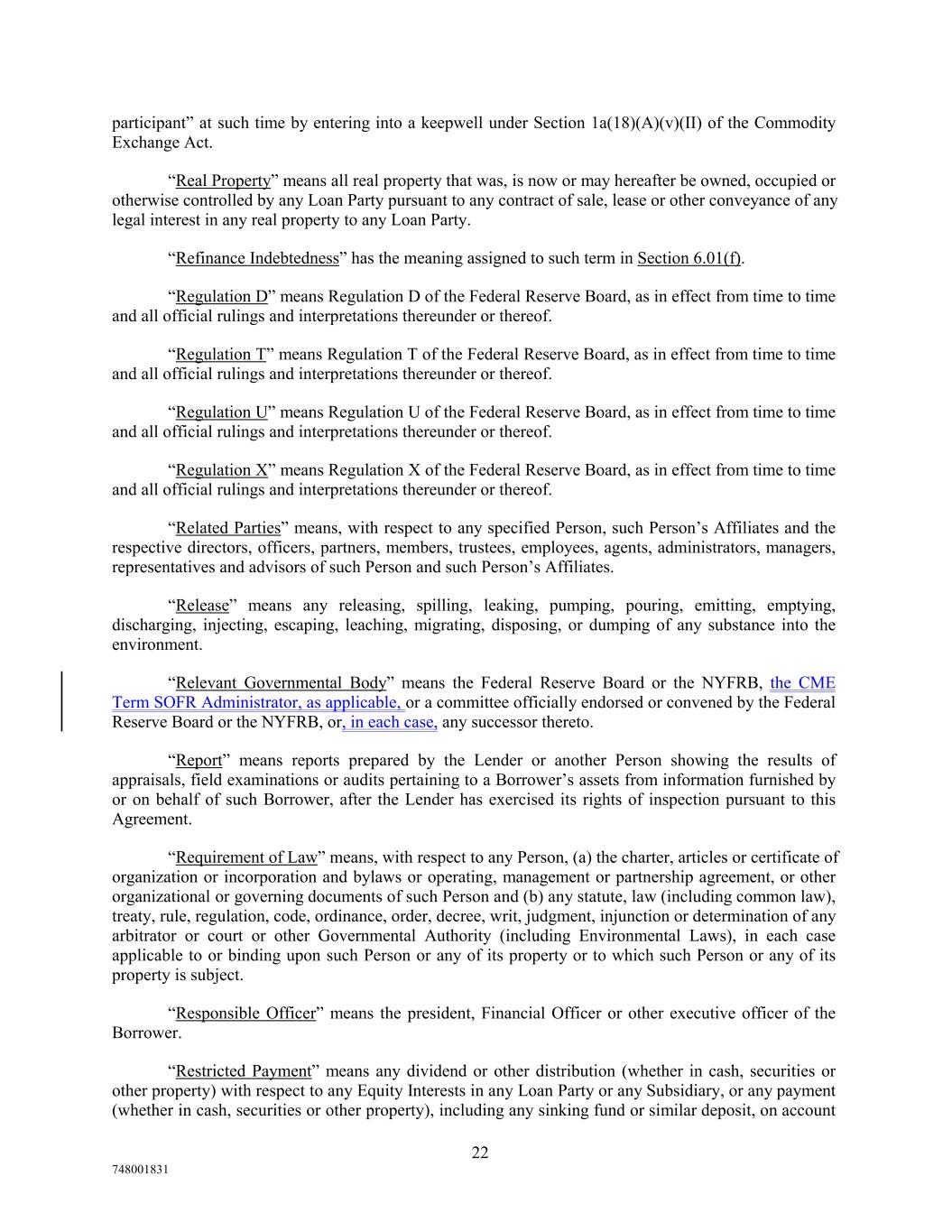 participant” at such time by entering into a keepwell under Section 1a(18)(A)(v)(II) of the Commodity Exchange Act. “Real Property” means all real property that was, is now or may hereafter be owned, occupied or otherwise controlled by any Loan Party pursuant to any contract of sale, lease or other conveyance of any legal interest in any real property to any Loan Party. “Refinance Indebtedness” has the meaning assigned to such term in Section 6.01(f). “Regulation D” means Regulation D of the Federal Reserve Board, as in effect from time to time and all official rulings and interpretations thereunder or thereof. “Regulation T” means Regulation T of the Federal Reserve Board, as in effect from time to time and all official rulings and interpretations thereunder or thereof. “Regulation U” means Regulation U of the Federal Reserve Board, as in effect from time to time and all official rulings and interpretations thereunder or thereof. “Regulation X” means Regulation X of the Federal Reserve Board, as in effect from time to time and all official rulings and interpretations thereunder or thereof. “Related Parties” means, with respect to any specified Person, such Person’s Affiliates and the respective directors, officers, partners, members, trustees, employees, agents, administrators, managers, representatives and advisors of such Person and such Person’s Affiliates. “Release” means any releasing, spilling, leaking, pumping, pouring, emitting, emptying, discharging, injecting, escaping, leaching, migrating, disposing, or dumping of any substance into the environment. “Relevant Governmental Body” means the Federal Reserve Board or the NYFRB, the CME Term SOFR Administrator, as applicable, or a committee officially endorsed or convened by the Federal Reserve Board or the NYFRB, or, in each case, any successor thereto. “Report” means reports prepared by the Lender or another Person showing the results of appraisals, field examinations or audits pertaining to a Borrower’s assets from information furnished by or on behalf of such Borrower, after the Lender has exercised its rights of inspection pursuant to this Agreement. “Requirement of Law” means, with respect to any Person, (a) the charter, articles or certificate of organization or incorporation and bylaws or operating, management or partnership agreement, or other organizational or governing documents of such Person and (b) any statute, law (including common law), treaty, rule, regulation, code, ordinance, order, decree, writ, judgment, injunction or determination of any arbitrator or court or other Governmental Authority (including Environmental Laws), in each case applicable to or binding upon such Person or any of its property or to which such Person or any of its property is subject. “Responsible Officer” means the president, Financial Officer or other executive officer of the Borrower. “Restricted Payment” means any dividend or other distribution (whether in cash, securities or other property) with respect to any Equity Interests in any Loan Party or any Subsidiary, or any payment (whether in cash, securities or other property), including any sinking fund or similar deposit, on account 22 748001831