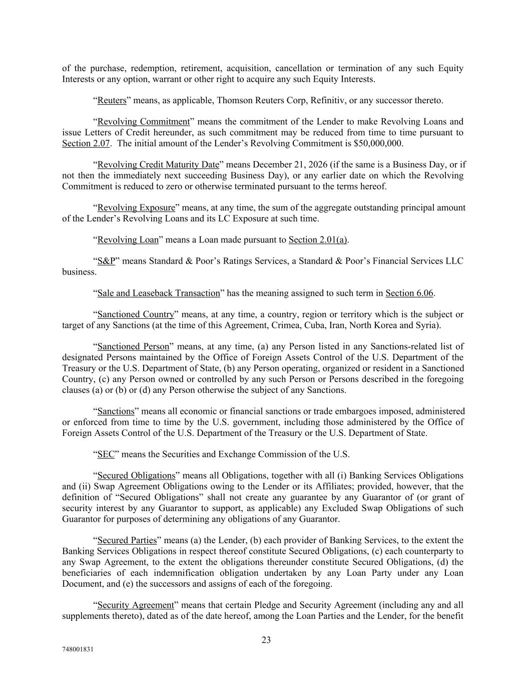 of the purchase, redemption, retirement, acquisition, cancellation or termination of any such Equity Interests or any option, warrant or other right to acquire any such Equity Interests. “Reuters” means, as applicable, Thomson Reuters Corp, Refinitiv, or any successor thereto. “Revolving Commitment” means the commitment of the Lender to make Revolving Loans and issue Letters of Credit hereunder, as such commitment may be reduced from time to time pursuant to Section 2.07. The initial amount of the Lender’s Revolving Commitment is $50,000,000. “Revolving Credit Maturity Date” means December 21, 2026 (if the same is a Business Day, or if not then the immediately next succeeding Business Day), or any earlier date on which the Revolving Commitment is reduced to zero or otherwise terminated pursuant to the terms hereof. “Revolving Exposure” means, at any time, the sum of the aggregate outstanding principal amount of the Lender’s Revolving Loans and its LC Exposure at such time. “Revolving Loan” means a Loan made pursuant to Section 2.01(a). “S&P” means Standard & Poor’s Ratings Services, a Standard & Poor’s Financial Services LLC business. “Sale and Leaseback Transaction” has the meaning assigned to such term in Section 6.06. “Sanctioned Country” means, at any time, a country, region or territory which is the subject or target of any Sanctions (at the time of this Agreement, Crimea, Cuba, Iran, North Korea and Syria). “Sanctioned Person” means, at any time, (a) any Person listed in any Sanctions-related list of designated Persons maintained by the Office of Foreign Assets Control of the U.S. Department of the Treasury or the U.S. Department of State, (b) any Person operating, organized or resident in a Sanctioned Country, (c) any Person owned or controlled by any such Person or Persons described in the foregoing clauses (a) or (b) or (d) any Person otherwise the subject of any Sanctions. “Sanctions” means all economic or financial sanctions or trade embargoes imposed, administered or enforced from time to time by the U.S. government, including those administered by the Office of Foreign Assets Control of the U.S. Department of the Treasury or the U.S. Department of State. “SEC” means the Securities and Exchange Commission of the U.S. “Secured Obligations” means all Obligations, together with all (i) Banking Services Obligations and (ii) Swap Agreement Obligations owing to the Lender or its Affiliates; provided, however, that the definition of “Secured Obligations” shall not create any guarantee by any Guarantor of (or grant of security interest by any Guarantor to support, as applicable) any Excluded Swap Obligations of such Guarantor for purposes of determining any obligations of any Guarantor. “Secured Parties” means (a) the Lender, (b) each provider of Banking Services, to the extent the Banking Services Obligations in respect thereof constitute Secured Obligations, (c) each counterparty to any Swap Agreement, to the extent the obligations thereunder constitute Secured Obligations, (d) the beneficiaries of each indemnification obligation undertaken by any Loan Party under any Loan Document, and (e) the successors and assigns of each of the foregoing. “Security Agreement” means that certain Pledge and Security Agreement (including any and all supplements thereto), dated as of the date hereof, among the Loan Parties and the Lender, for the benefit 23 748001831