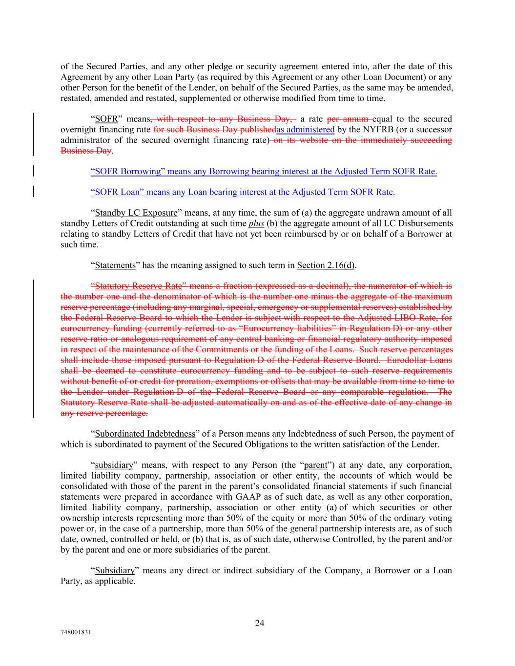 of the Secured Parties, and any other pledge or security agreement entered into, after the date of this Agreement by any other Loan Party (as required by this Agreement or any other Loan Document) or any other Person for the benefit of the Lender, on behalf of the Secured Parties, as the same may be amended, restated, amended and restated, supplemented or otherwise modified from time to time. “SOFR” means, with respect to any Business Day, a rate per annum equal to the secured overnight financing rate for such Business Day publishedas administered by the NYFRB (or a successor administrator of the secured overnight financing rate) on its website on the immediately succeeding Business Day. “SOFR Borrowing” means any Borrowing bearing interest at the Adjusted Term SOFR Rate. “SOFR Loan” means any Loan bearing interest at the Adjusted Term SOFR Rate. “Standby LC Exposure” means, at any time, the sum of (a) the aggregate undrawn amount of all standby Letters of Credit outstanding at such time plus (b) the aggregate amount of all LC Disbursements relating to standby Letters of Credit that have not yet been reimbursed by or on behalf of a Borrower at such time. “Statements” has the meaning assigned to such term in Section 2.16(d). “Statutory Reserve Rate” means a fraction (expressed as a decimal), the numerator of which is the number one and the denominator of which is the number one minus the aggregate of the maximum reserve percentage (including any marginal, special, emergency or supplemental reserves) established by the Federal Reserve Board to which the Lender is subject with respect to the Adjusted LIBO Rate, for eurocurrency funding (currently referred to as “Eurocurrency liabilities” in Regulation D) or any other reserve ratio or analogous requirement of any central banking or financial regulatory authority imposed in respect of the maintenance of the Commitments or the funding of the Loans. Such reserve percentages shall include those imposed pursuant to Regulation D of the Federal Reserve Board. Eurodollar Loans shall be deemed to constitute eurocurrency funding and to be subject to such reserve requirements without benefit of or credit for proration, exemptions or offsets that may be available from time to time to the Lender under Regulation D of the Federal Reserve Board or any comparable regulation. The Statutory Reserve Rate shall be adjusted automatically on and as of the effective date of any change in any reserve percentage. “Subordinated Indebtedness” of a Person means any Indebtedness of such Person, the payment of which is subordinated to payment of the Secured Obligations to the written satisfaction of the Lender. “subsidiary” means, with respect to any Person (the “parent”) at any date, any corporation, limited liability company, partnership, association or other entity, the accounts of which would be consolidated with those of the parent in the parent’s consolidated financial statements if such financial statements were prepared in accordance with GAAP as of such date, as well as any other corporation, limited liability company, partnership, association or other entity (a) of which securities or other ownership interests representing more than 50% of the equity or more than 50% of the ordinary voting power or, in the case of a partnership, more than 50% of the general partnership interests are, as of such date, owned, controlled or held, or (b) that is, as of such date, otherwise Controlled, by the parent and/or by the parent and one or more subsidiaries of the parent. “Subsidiary” means any direct or indirect subsidiary of the Company, a Borrower or a Loan Party, as applicable. 24 748001831