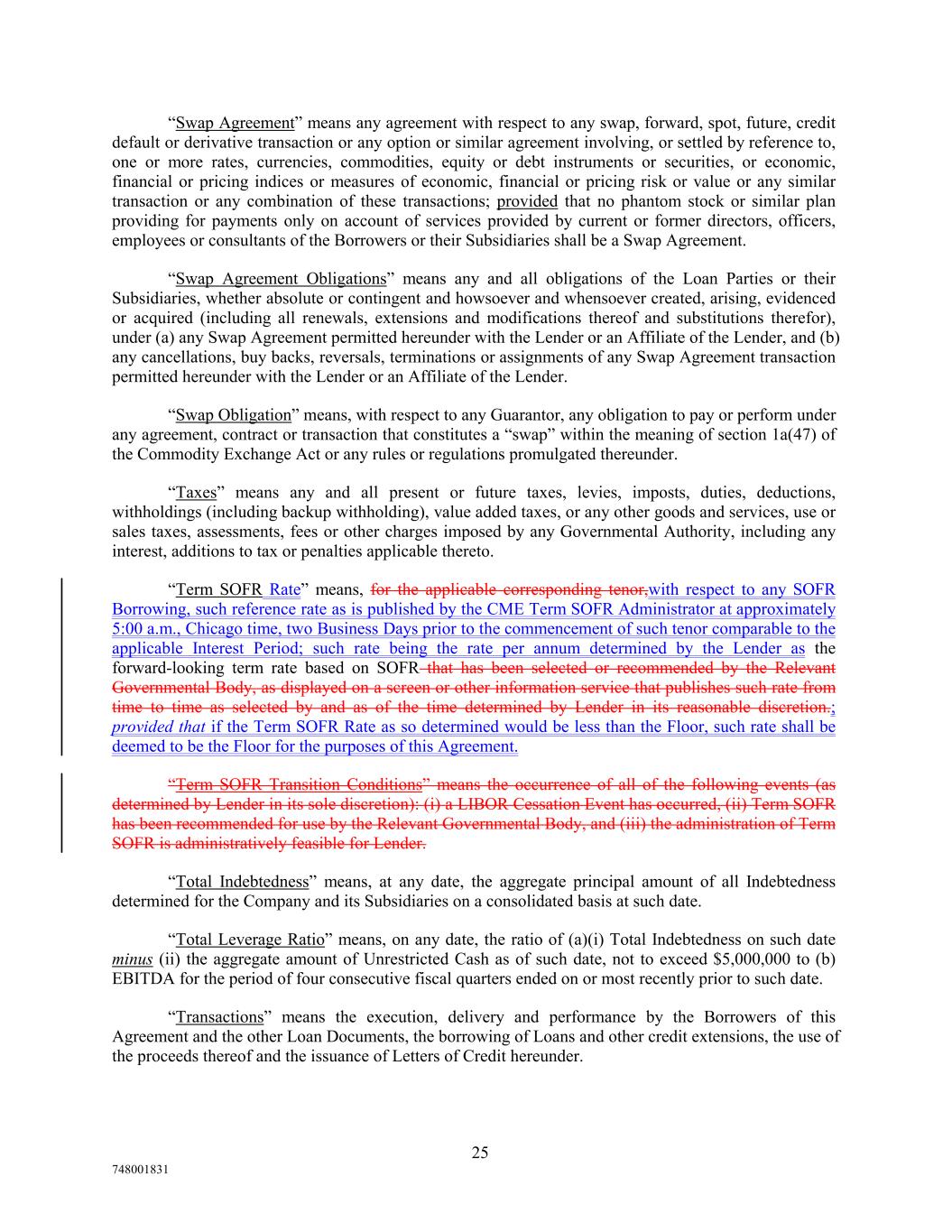 “Swap Agreement” means any agreement with respect to any swap, forward, spot, future, credit default or derivative transaction or any option or similar agreement involving, or settled by reference to, one or more rates, currencies, commodities, equity or debt instruments or securities, or economic, financial or pricing indices or measures of economic, financial or pricing risk or value or any similar transaction or any combination of these transactions; provided that no phantom stock or similar plan providing for payments only on account of services provided by current or former directors, officers, employees or consultants of the Borrowers or their Subsidiaries shall be a Swap Agreement. “Swap Agreement Obligations” means any and all obligations of the Loan Parties or their Subsidiaries, whether absolute or contingent and howsoever and whensoever created, arising, evidenced or acquired (including all renewals, extensions and modifications thereof and substitutions therefor), under (a) any Swap Agreement permitted hereunder with the Lender or an Affiliate of the Lender, and (b) any cancellations, buy backs, reversals, terminations or assignments of any Swap Agreement transaction permitted hereunder with the Lender or an Affiliate of the Lender. “Swap Obligation” means, with respect to any Guarantor, any obligation to pay or perform under any agreement, contract or transaction that constitutes a “swap” within the meaning of section 1a(47) of the Commodity Exchange Act or any rules or regulations promulgated thereunder. “Taxes” means any and all present or future taxes, levies, imposts, duties, deductions, withholdings (including backup withholding), value added taxes, or any other goods and services, use or sales taxes, assessments, fees or other charges imposed by any Governmental Authority, including any interest, additions to tax or penalties applicable thereto. “Term SOFR Rate” means, for the applicable corresponding tenor,with respect to any SOFR Borrowing, such reference rate as is published by the CME Term SOFR Administrator at approximately 5:00 a.m., Chicago time, two Business Days prior to the commencement of such tenor comparable to the applicable Interest Period; such rate being the rate per annum determined by the Lender as the forward-looking term rate based on SOFR that has been selected or recommended by the Relevant Governmental Body, as displayed on a screen or other information service that publishes such rate from time to time as selected by and as of the time determined by Lender in its reasonable discretion.; provided that if the Term SOFR Rate as so determined would be less than the Floor, such rate shall be deemed to be the Floor for the purposes of this Agreement. “Term SOFR Transition Conditions” means the occurrence of all of the following events (as determined by Lender in its sole discretion): (i) a LIBOR Cessation Event has occurred, (ii) Term SOFR has been recommended for use by the Relevant Governmental Body, and (iii) the administration of Term SOFR is administratively feasible for Lender. “Total Indebtedness” means, at any date, the aggregate principal amount of all Indebtedness determined for the Company and its Subsidiaries on a consolidated basis at such date. “Total Leverage Ratio” means, on any date, the ratio of (a)(i) Total Indebtedness on such date minus (ii) the aggregate amount of Unrestricted Cash as of such date, not to exceed $5,000,000 to (b) EBITDA for the period of four consecutive fiscal quarters ended on or most recently prior to such date. “Transactions” means the execution, delivery and performance by the Borrowers of this Agreement and the other Loan Documents, the borrowing of Loans and other credit extensions, the use of the proceeds thereof and the issuance of Letters of Credit hereunder. 25 748001831