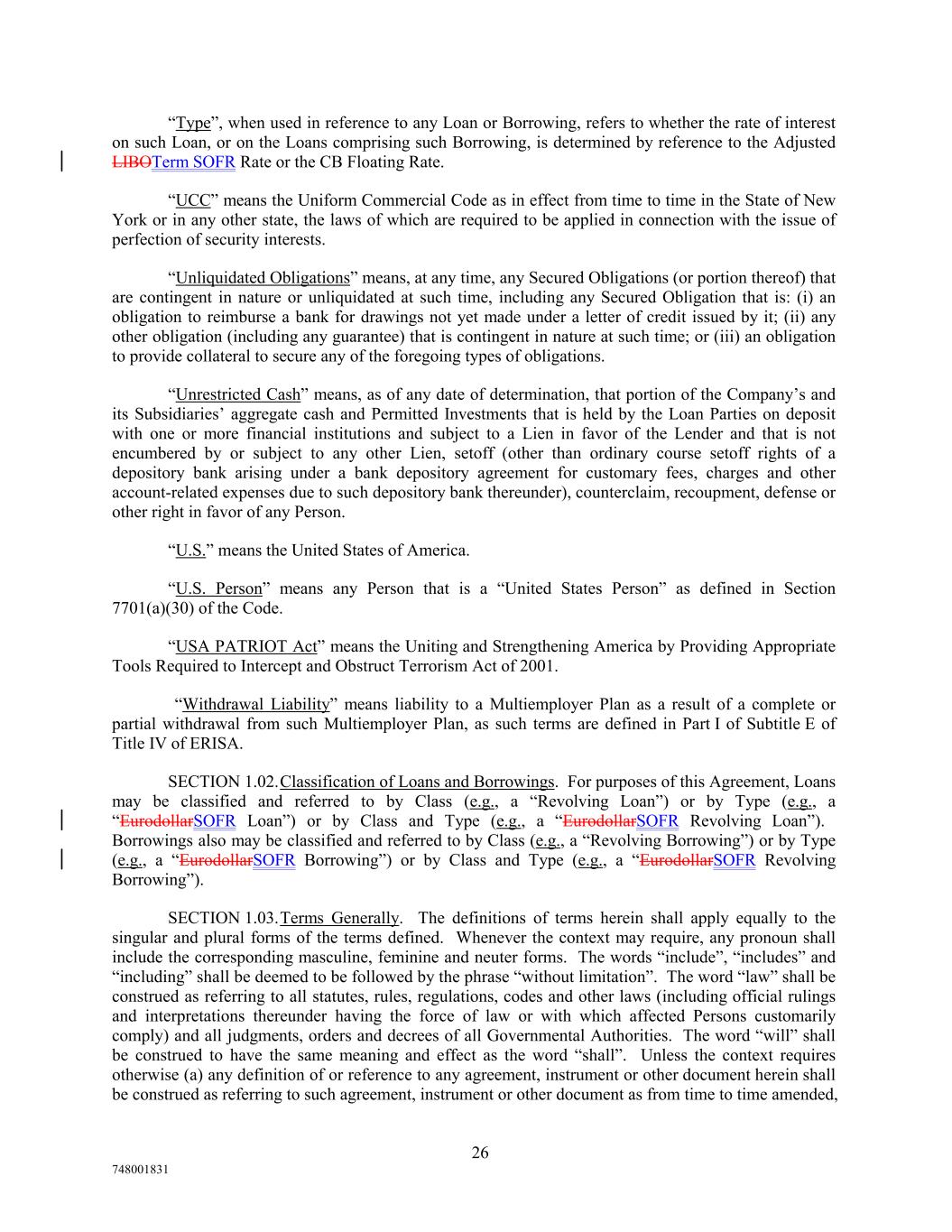 “Type”, when used in reference to any Loan or Borrowing, refers to whether the rate of interest on such Loan, or on the Loans comprising such Borrowing, is determined by reference to the Adjusted LIBOTerm SOFR Rate or the CB Floating Rate. “UCC” means the Uniform Commercial Code as in effect from time to time in the State of New York or in any other state, the laws of which are required to be applied in connection with the issue of perfection of security interests. “Unliquidated Obligations” means, at any time, any Secured Obligations (or portion thereof) that are contingent in nature or unliquidated at such time, including any Secured Obligation that is: (i) an obligation to reimburse a bank for drawings not yet made under a letter of credit issued by it; (ii) any other obligation (including any guarantee) that is contingent in nature at such time; or (iii) an obligation to provide collateral to secure any of the foregoing types of obligations. “Unrestricted Cash” means, as of any date of determination, that portion of the Company’s and its Subsidiaries’ aggregate cash and Permitted Investments that is held by the Loan Parties on deposit with one or more financial institutions and subject to a Lien in favor of the Lender and that is not encumbered by or subject to any other Lien, setoff (other than ordinary course setoff rights of a depository bank arising under a bank depository agreement for customary fees, charges and other account-related expenses due to such depository bank thereunder), counterclaim, recoupment, defense or other right in favor of any Person. “U.S.” means the United States of America. “U.S. Person” means any Person that is a “United States Person” as defined in Section 7701(a)(30) of the Code. “USA PATRIOT Act” means the Uniting and Strengthening America by Providing Appropriate Tools Required to Intercept and Obstruct Terrorism Act of 2001. “Withdrawal Liability” means liability to a Multiemployer Plan as a result of a complete or partial withdrawal from such Multiemployer Plan, as such terms are defined in Part I of Subtitle E of Title IV of ERISA. SECTION 1.02.Classification of Loans and Borrowings. For purposes of this Agreement, Loans may be classified and referred to by Class (e.g., a “Revolving Loan”) or by Type (e.g., a “EurodollarSOFR Loan”) or by Class and Type (e.g., a “EurodollarSOFR Revolving Loan”). Borrowings also may be classified and referred to by Class (e.g., a “Revolving Borrowing”) or by Type (e.g., a “EurodollarSOFR Borrowing”) or by Class and Type (e.g., a “EurodollarSOFR Revolving Borrowing”). SECTION 1.03.Terms Generally. The definitions of terms herein shall apply equally to the singular and plural forms of the terms defined. Whenever the context may require, any pronoun shall include the corresponding masculine, feminine and neuter forms. The words “include”, “includes” and “including” shall be deemed to be followed by the phrase “without limitation”. The word “law” shall be construed as referring to all statutes, rules, regulations, codes and other laws (including official rulings and interpretations thereunder having the force of law or with which affected Persons customarily comply) and all judgments, orders and decrees of all Governmental Authorities. The word “will” shall be construed to have the same meaning and effect as the word “shall”. Unless the context requires otherwise (a) any definition of or reference to any agreement, instrument or other document herein shall be construed as referring to such agreement, instrument or other document as from time to time amended, 26 748001831