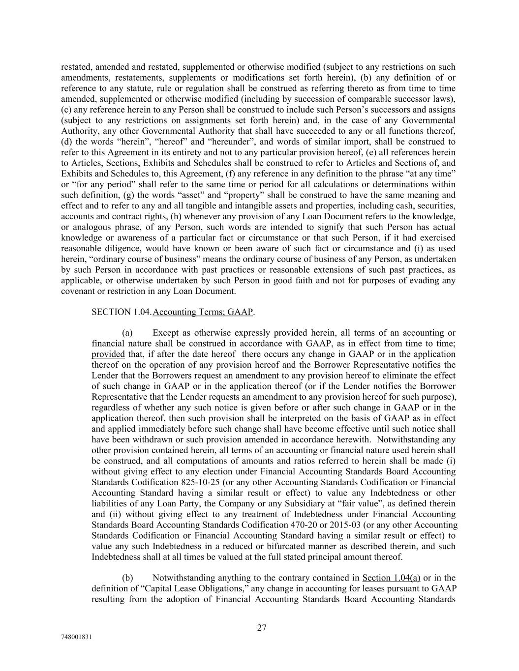 restated, amended and restated, supplemented or otherwise modified (subject to any restrictions on such amendments, restatements, supplements or modifications set forth herein), (b) any definition of or reference to any statute, rule or regulation shall be construed as referring thereto as from time to time amended, supplemented or otherwise modified (including by succession of comparable successor laws), (c) any reference herein to any Person shall be construed to include such Person’s successors and assigns (subject to any restrictions on assignments set forth herein) and, in the case of any Governmental Authority, any other Governmental Authority that shall have succeeded to any or all functions thereof, (d) the words “herein”, “hereof” and “hereunder”, and words of similar import, shall be construed to refer to this Agreement in its entirety and not to any particular provision hereof, (e) all references herein to Articles, Sections, Exhibits and Schedules shall be construed to refer to Articles and Sections of, and Exhibits and Schedules to, this Agreement, (f) any reference in any definition to the phrase “at any time” or “for any period” shall refer to the same time or period for all calculations or determinations within such definition, (g) the words “asset” and “property” shall be construed to have the same meaning and effect and to refer to any and all tangible and intangible assets and properties, including cash, securities, accounts and contract rights, (h) whenever any provision of any Loan Document refers to the knowledge, or analogous phrase, of any Person, such words are intended to signify that such Person has actual knowledge or awareness of a particular fact or circumstance or that such Person, if it had exercised reasonable diligence, would have known or been aware of such fact or circumstance and (i) as used herein, “ordinary course of business” means the ordinary course of business of any Person, as undertaken by such Person in accordance with past practices or reasonable extensions of such past practices, as applicable, or otherwise undertaken by such Person in good faith and not for purposes of evading any covenant or restriction in any Loan Document. SECTION 1.04.Accounting Terms; GAAP. (a) Except as otherwise expressly provided herein, all terms of an accounting or financial nature shall be construed in accordance with GAAP, as in effect from time to time; provided that, if after the date hereof there occurs any change in GAAP or in the application thereof on the operation of any provision hereof and the Borrower Representative notifies the Lender that the Borrowers request an amendment to any provision hereof to eliminate the effect of such change in GAAP or in the application thereof (or if the Lender notifies the Borrower Representative that the Lender requests an amendment to any provision hereof for such purpose), regardless of whether any such notice is given before or after such change in GAAP or in the application thereof, then such provision shall be interpreted on the basis of GAAP as in effect and applied immediately before such change shall have become effective until such notice shall have been withdrawn or such provision amended in accordance herewith. Notwithstanding any other provision contained herein, all terms of an accounting or financial nature used herein shall be construed, and all computations of amounts and ratios referred to herein shall be made (i) without giving effect to any election under Financial Accounting Standards Board Accounting Standards Codification 825-10-25 (or any other Accounting Standards Codification or Financial Accounting Standard having a similar result or effect) to value any Indebtedness or other liabilities of any Loan Party, the Company or any Subsidiary at “fair value”, as defined therein and (ii) without giving effect to any treatment of Indebtedness under Financial Accounting Standards Board Accounting Standards Codification 470-20 or 2015-03 (or any other Accounting Standards Codification or Financial Accounting Standard having a similar result or effect) to value any such Indebtedness in a reduced or bifurcated manner as described therein, and such Indebtedness shall at all times be valued at the full stated principal amount thereof. (b) Notwithstanding anything to the contrary contained in Section 1.04(a) or in the definition of “Capital Lease Obligations,” any change in accounting for leases pursuant to GAAP resulting from the adoption of Financial Accounting Standards Board Accounting Standards 27 748001831