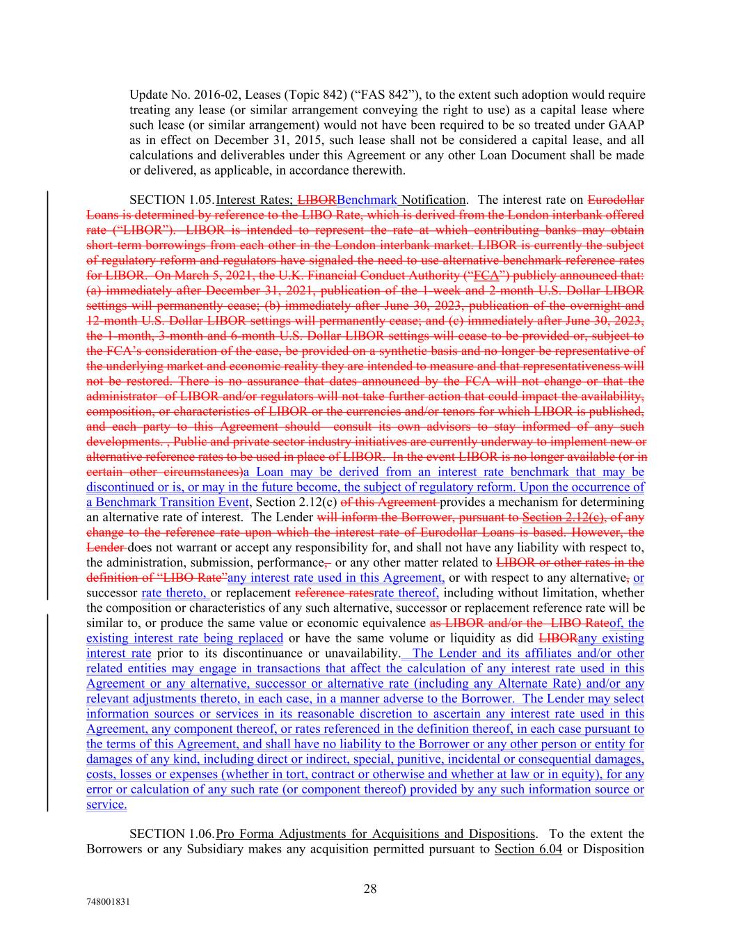 Update No. 2016-02, Leases (Topic 842) (“FAS 842”), to the extent such adoption would require treating any lease (or similar arrangement conveying the right to use) as a capital lease where such lease (or similar arrangement) would not have been required to be so treated under GAAP as in effect on December 31, 2015, such lease shall not be considered a capital lease, and all calculations and deliverables under this Agreement or any other Loan Document shall be made or delivered, as applicable, in accordance therewith. SECTION 1.05.Interest Rates; LIBORBenchmark Notification. The interest rate on Eurodollar Loans is determined by reference to the LIBO Rate, which is derived from the London interbank offered rate (“LIBOR”). LIBOR is intended to represent the rate at which contributing banks may obtain short-term borrowings from each other in the London interbank market. LIBOR is currently the subject of regulatory reform and regulators have signaled the need to use alternative benchmark reference rates for LIBOR. On March 5, 2021, the U.K. Financial Conduct Authority (“FCA”) publicly announced that: (a) immediately after December 31, 2021, publication of the 1-week and 2-month U.S. Dollar LIBOR settings will permanently cease; (b) immediately after June 30, 2023, publication of the overnight and 12-month U.S. Dollar LIBOR settings will permanently cease; and (c) immediately after June 30, 2023, the 1-month, 3-month and 6-month U.S. Dollar LIBOR settings will cease to be provided or, subject to the FCA’s consideration of the case, be provided on a synthetic basis and no longer be representative of the underlying market and economic reality they are intended to measure and that representativeness will not be restored. There is no assurance that dates announced by the FCA will not change or that the administrator of LIBOR and/or regulators will not take further action that could impact the availability, composition, or characteristics of LIBOR or the currencies and/or tenors for which LIBOR is published, and each party to this Agreement should consult its own advisors to stay informed of any such developments. , Public and private sector industry initiatives are currently underway to implement new or alternative reference rates to be used in place of LIBOR. In the event LIBOR is no longer available (or in certain other circumstances)a Loan may be derived from an interest rate benchmark that may be discontinued or is, or may in the future become, the subject of regulatory reform. Upon the occurrence of a Benchmark Transition Event, Section 2.12(c) of this Agreement provides a mechanism for determining an alternative rate of interest. The Lender will inform the Borrower, pursuant to Section 2.12(c), of any change to the reference rate upon which the interest rate of Eurodollar Loans is based. However, the Lender does not warrant or accept any responsibility for, and shall not have any liability with respect to, the administration, submission, performance, or any other matter related to LIBOR or other rates in the definition of “LIBO Rate”any interest rate used in this Agreement, or with respect to any alternative, or successor rate thereto, or replacement reference ratesrate thereof, including without limitation, whether the composition or characteristics of any such alternative, successor or replacement reference rate will be similar to, or produce the same value or economic equivalence as LIBOR and/or the LIBO Rateof, the existing interest rate being replaced or have the same volume or liquidity as did LIBORany existing interest rate prior to its discontinuance or unavailability. The Lender and its affiliates and/or other related entities may engage in transactions that affect the calculation of any interest rate used in this Agreement or any alternative, successor or alternative rate (including any Alternate Rate) and/or any relevant adjustments thereto, in each case, in a manner adverse to the Borrower. The Lender may select information sources or services in its reasonable discretion to ascertain any interest rate used in this Agreement, any component thereof, or rates referenced in the definition thereof, in each case pursuant to the terms of this Agreement, and shall have no liability to the Borrower or any other person or entity for damages of any kind, including direct or indirect, special, punitive, incidental or consequential damages, costs, losses or expenses (whether in tort, contract or otherwise and whether at law or in equity), for any error or calculation of any such rate (or component thereof) provided by any such information source or service. SECTION 1.06.Pro Forma Adjustments for Acquisitions and Dispositions. To the extent the Borrowers or any Subsidiary makes any acquisition permitted pursuant to Section 6.04 or Disposition 28 748001831