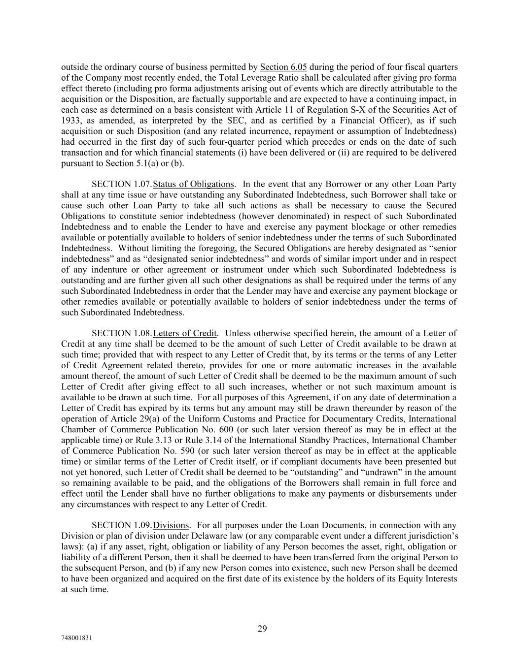 outside the ordinary course of business permitted by Section 6.05 during the period of four fiscal quarters of the Company most recently ended, the Total Leverage Ratio shall be calculated after giving pro forma effect thereto (including pro forma adjustments arising out of events which are directly attributable to the acquisition or the Disposition, are factually supportable and are expected to have a continuing impact, in each case as determined on a basis consistent with Article 11 of Regulation S-X of the Securities Act of 1933, as amended, as interpreted by the SEC, and as certified by a Financial Officer), as if such acquisition or such Disposition (and any related incurrence, repayment or assumption of Indebtedness) had occurred in the first day of such four-quarter period which precedes or ends on the date of such transaction and for which financial statements (i) have been delivered or (ii) are required to be delivered pursuant to Section 5.1(a) or (b). SECTION 1.07.Status of Obligations. In the event that any Borrower or any other Loan Party shall at any time issue or have outstanding any Subordinated Indebtedness, such Borrower shall take or cause such other Loan Party to take all such actions as shall be necessary to cause the Secured Obligations to constitute senior indebtedness (however denominated) in respect of such Subordinated Indebtedness and to enable the Lender to have and exercise any payment blockage or other remedies available or potentially available to holders of senior indebtedness under the terms of such Subordinated Indebtedness. Without limiting the foregoing, the Secured Obligations are hereby designated as “senior indebtedness” and as “designated senior indebtedness” and words of similar import under and in respect of any indenture or other agreement or instrument under which such Subordinated Indebtedness is outstanding and are further given all such other designations as shall be required under the terms of any such Subordinated Indebtedness in order that the Lender may have and exercise any payment blockage or other remedies available or potentially available to holders of senior indebtedness under the terms of such Subordinated Indebtedness. SECTION 1.08.Letters of Credit. Unless otherwise specified herein, the amount of a Letter of Credit at any time shall be deemed to be the amount of such Letter of Credit available to be drawn at such time; provided that with respect to any Letter of Credit that, by its terms or the terms of any Letter of Credit Agreement related thereto, provides for one or more automatic increases in the available amount thereof, the amount of such Letter of Credit shall be deemed to be the maximum amount of such Letter of Credit after giving effect to all such increases, whether or not such maximum amount is available to be drawn at such time. For all purposes of this Agreement, if on any date of determination a Letter of Credit has expired by its terms but any amount may still be drawn thereunder by reason of the operation of Article 29(a) of the Uniform Customs and Practice for Documentary Credits, International Chamber of Commerce Publication No. 600 (or such later version thereof as may be in effect at the applicable time) or Rule 3.13 or Rule 3.14 of the International Standby Practices, International Chamber of Commerce Publication No. 590 (or such later version thereof as may be in effect at the applicable time) or similar terms of the Letter of Credit itself, or if compliant documents have been presented but not yet honored, such Letter of Credit shall be deemed to be “outstanding” and “undrawn” in the amount so remaining available to be paid, and the obligations of the Borrowers shall remain in full force and effect until the Lender shall have no further obligations to make any payments or disbursements under any circumstances with respect to any Letter of Credit. SECTION 1.09.Divisions. For all purposes under the Loan Documents, in connection with any Division or plan of division under Delaware law (or any comparable event under a different jurisdiction’s laws): (a) if any asset, right, obligation or liability of any Person becomes the asset, right, obligation or liability of a different Person, then it shall be deemed to have been transferred from the original Person to the subsequent Person, and (b) if any new Person comes into existence, such new Person shall be deemed to have been organized and acquired on the first date of its existence by the holders of its Equity Interests at such time. 29 748001831