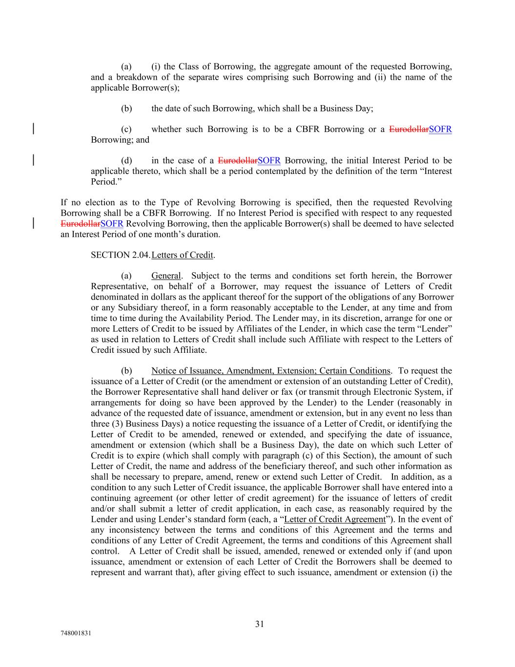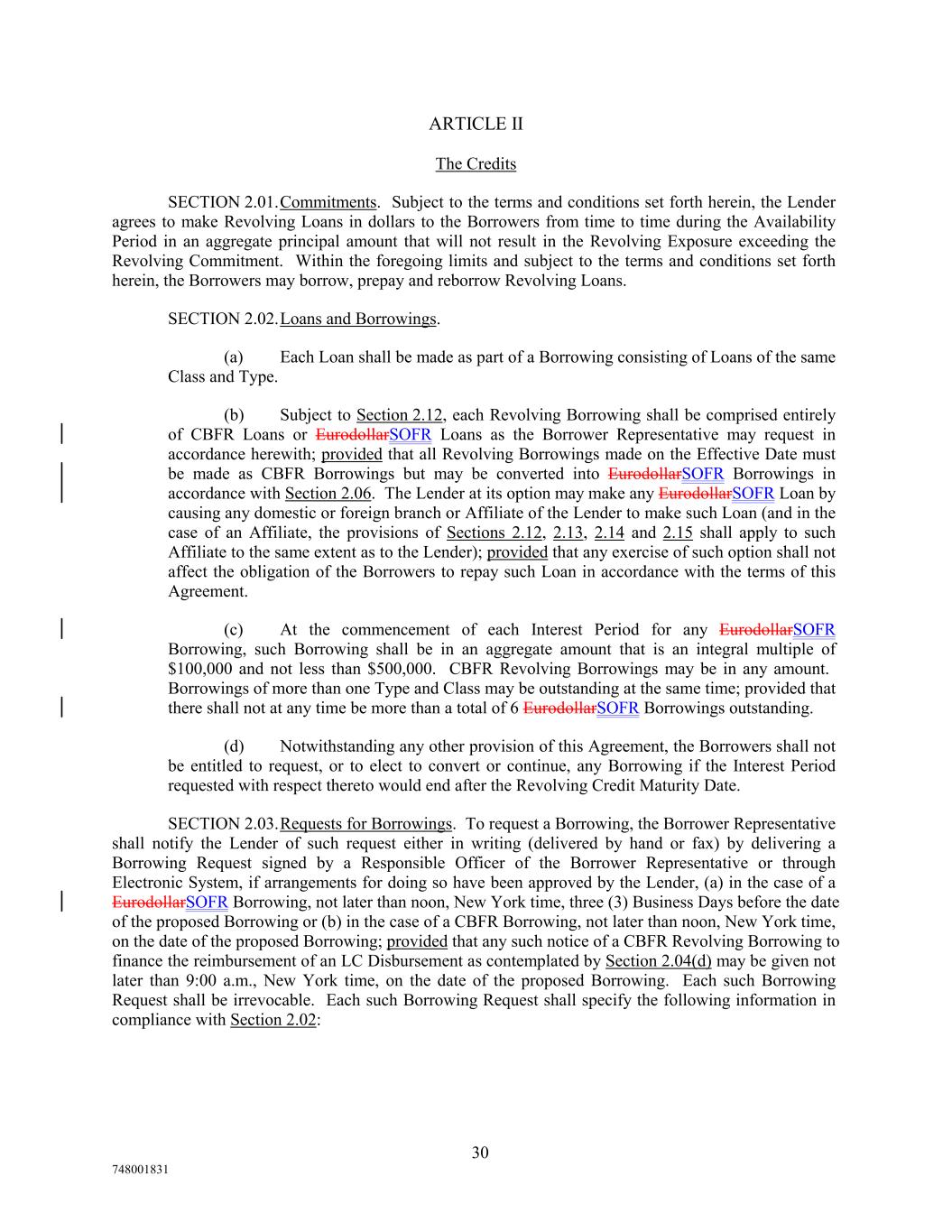 ARTICLE II The Credits SECTION 2.01.Commitments. Subject to the terms and conditions set forth herein, the Lender agrees to make Revolving Loans in dollars to the Borrowers from time to time during the Availability Period in an aggregate principal amount that will not result in the Revolving Exposure exceeding the Revolving Commitment. Within the foregoing limits and subject to the terms and conditions set forth herein, the Borrowers may borrow, prepay and reborrow Revolving Loans. SECTION 2.02.Loans and Borrowings. (a) Each Loan shall be made as part of a Borrowing consisting of Loans of the same Class and Type. (b) Subject to Section 2.12, each Revolving Borrowing shall be comprised entirely of CBFR Loans or EurodollarSOFR Loans as the Borrower Representative may request in accordance herewith; provided that all Revolving Borrowings made on the Effective Date must be made as CBFR Borrowings but may be converted into EurodollarSOFR Borrowings in accordance with Section 2.06. The Lender at its option may make any EurodollarSOFR Loan by causing any domestic or foreign branch or Affiliate of the Lender to make such Loan (and in the case of an Affiliate, the provisions of Sections 2.12, 2.13, 2.14 and 2.15 shall apply to such Affiliate to the same extent as to the Lender); provided that any exercise of such option shall not affect the obligation of the Borrowers to repay such Loan in accordance with the terms of this Agreement. (c) At the commencement of each Interest Period for any EurodollarSOFR Borrowing, such Borrowing shall be in an aggregate amount that is an integral multiple of $100,000 and not less than $500,000. CBFR Revolving Borrowings may be in any amount. Borrowings of more than one Type and Class may be outstanding at the same time; provided that there shall not at any time be more than a total of 6 EurodollarSOFR Borrowings outstanding. (d) Notwithstanding any other provision of this Agreement, the Borrowers shall not be entitled to request, or to elect to convert or continue, any Borrowing if the Interest Period requested with respect thereto would end after the Revolving Credit Maturity Date. SECTION 2.03.Requests for Borrowings. To request a Borrowing, the Borrower Representative shall notify the Lender of such request either in writing (delivered by hand or fax) by delivering a Borrowing Request signed by a Responsible Officer of the Borrower Representative or through Electronic System, if arrangements for doing so have been approved by the Lender, (a) in the case of a EurodollarSOFR Borrowing, not later than noon, New York time, three (3) Business Days before the date of the proposed Borrowing or (b) in the case of a CBFR Borrowing, not later than noon, New York time, on the date of the proposed Borrowing; provided that any such notice of a CBFR Revolving Borrowing to finance the reimbursement of an LC Disbursement as contemplated by Section 2.04(d) may be given not later than 9:00 a.m., New York time, on the date of the proposed Borrowing. Each such Borrowing Request shall be irrevocable. Each such Borrowing Request shall specify the following information in compliance with Section 2.02: 30 748001831