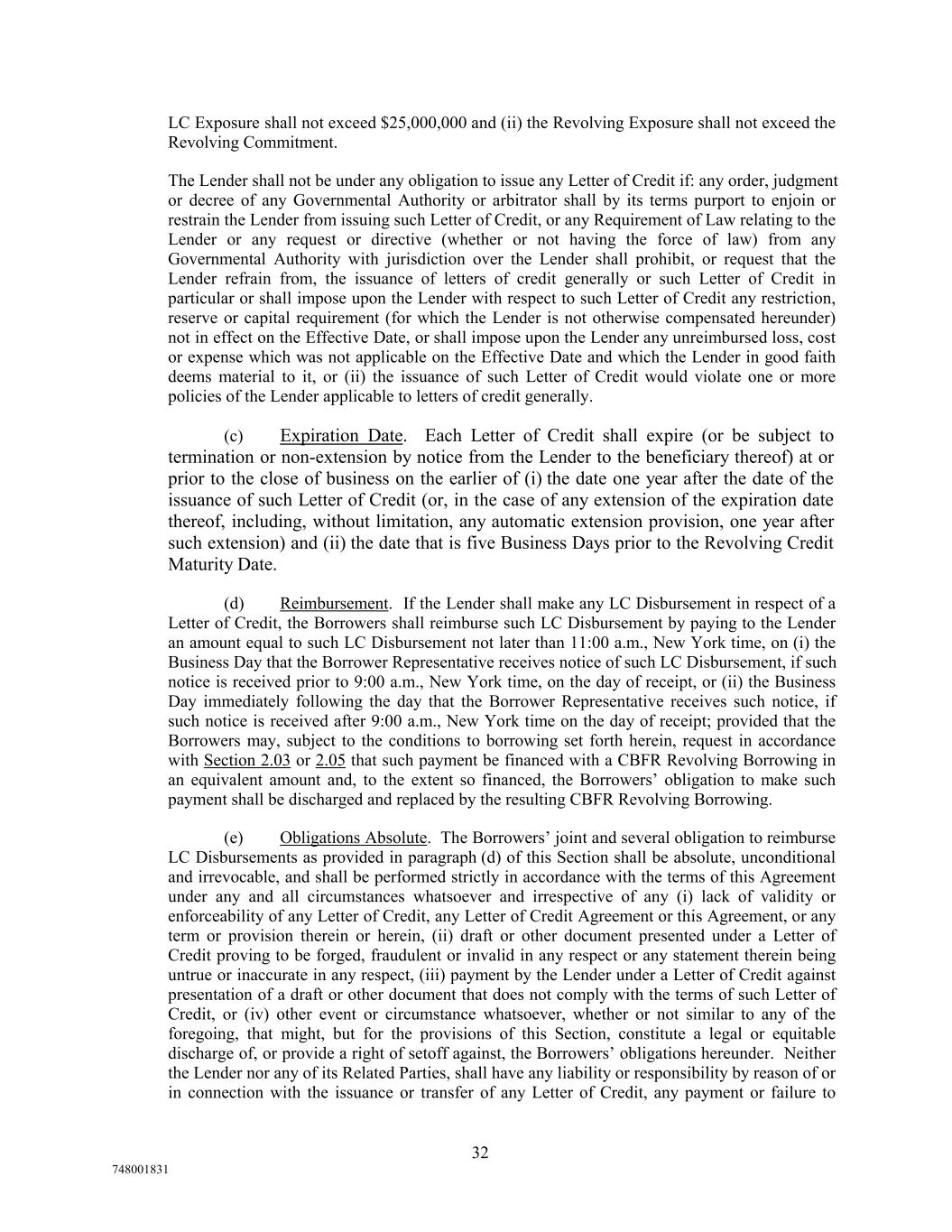 LC Exposure shall not exceed $25,000,000 and (ii) the Revolving Exposure shall not exceed the Revolving Commitment. The Lender shall not be under any obligation to issue any Letter of Credit if: any order, judgment or decree of any Governmental Authority or arbitrator shall by its terms purport to enjoin or restrain the Lender from issuing such Letter of Credit, or any Requirement of Law relating to the Lender or any request or directive (whether or not having the force of law) from any Governmental Authority with jurisdiction over the Lender shall prohibit, or request that the Lender refrain from, the issuance of letters of credit generally or such Letter of Credit in particular or shall impose upon the Lender with respect to such Letter of Credit any restriction, reserve or capital requirement (for which the Lender is not otherwise compensated hereunder) not in effect on the Effective Date, or shall impose upon the Lender any unreimbursed loss, cost or expense which was not applicable on the Effective Date and which the Lender in good faith deems material to it, or (ii) the issuance of such Letter of Credit would violate one or more policies of the Lender applicable to letters of credit generally. (c) Expiration Date. Each Letter of Credit shall expire (or be subject to termination or non-extension by notice from the Lender to the beneficiary thereof) at or prior to the close of business on the earlier of (i) the date one year after the date of the issuance of such Letter of Credit (or, in the case of any extension of the expiration date thereof, including, without limitation, any automatic extension provision, one year after such extension) and (ii) the date that is five Business Days prior to the Revolving Credit Maturity Date. (d) Reimbursement. If the Lender shall make any LC Disbursement in respect of a Letter of Credit, the Borrowers shall reimburse such LC Disbursement by paying to the Lender an amount equal to such LC Disbursement not later than 11:00 a.m., New York time, on (i) the Business Day that the Borrower Representative receives notice of such LC Disbursement, if such notice is received prior to 9:00 a.m., New York time, on the day of receipt, or (ii) the Business Day immediately following the day that the Borrower Representative receives such notice, if such notice is received after 9:00 a.m., New York time on the day of receipt; provided that the Borrowers may, subject to the conditions to borrowing set forth herein, request in accordance with Section 2.03 or 2.05 that such payment be financed with a CBFR Revolving Borrowing in an equivalent amount and, to the extent so financed, the Borrowers’ obligation to make such payment shall be discharged and replaced by the resulting CBFR Revolving Borrowing. (e) Obligations Absolute. The Borrowers’ joint and several obligation to reimburse LC Disbursements as provided in paragraph (d) of this Section shall be absolute, unconditional and irrevocable, and shall be performed strictly in accordance with the terms of this Agreement under any and all circumstances whatsoever and irrespective of any (i) lack of validity or enforceability of any Letter of Credit, any Letter of Credit Agreement or this Agreement, or any term or provision therein or herein, (ii) draft or other document presented under a Letter of Credit proving to be forged, fraudulent or invalid in any respect or any statement therein being untrue or inaccurate in any respect, (iii) payment by the Lender under a Letter of Credit against presentation of a draft or other document that does not comply with the terms of such Letter of Credit, or (iv) other event or circumstance whatsoever, whether or not similar to any of the foregoing, that might, but for the provisions of this Section, constitute a legal or equitable discharge of, or provide a right of setoff against, the Borrowers’ obligations hereunder. Neither the Lender nor any of its Related Parties, shall have any liability or responsibility by reason of or in connection with the issuance or transfer of any Letter of Credit, any payment or failure to 32 748001831