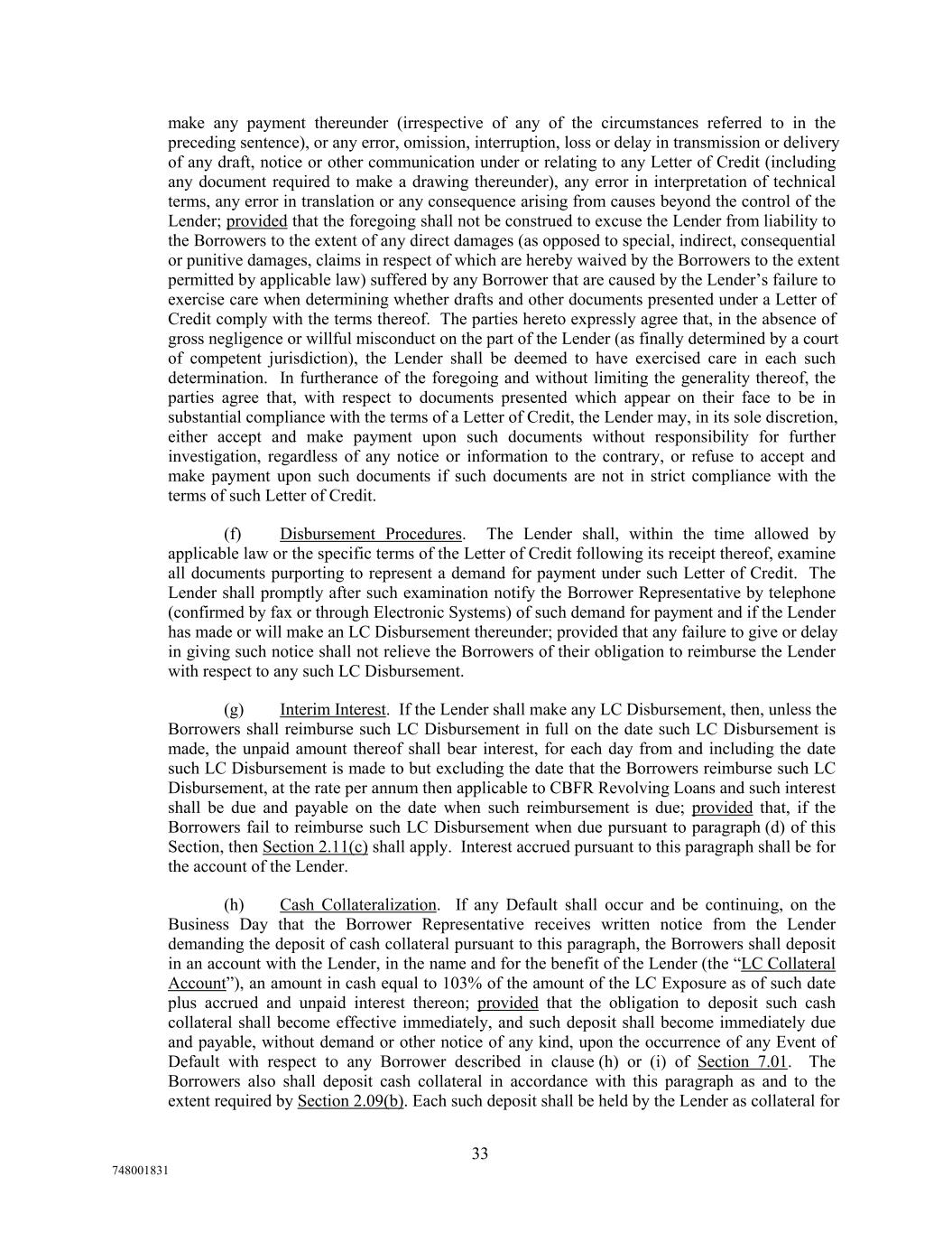 make any payment thereunder (irrespective of any of the circumstances referred to in the preceding sentence), or any error, omission, interruption, loss or delay in transmission or delivery of any draft, notice or other communication under or relating to any Letter of Credit (including any document required to make a drawing thereunder), any error in interpretation of technical terms, any error in translation or any consequence arising from causes beyond the control of the Lender; provided that the foregoing shall not be construed to excuse the Lender from liability to the Borrowers to the extent of any direct damages (as opposed to special, indirect, consequential or punitive damages, claims in respect of which are hereby waived by the Borrowers to the extent permitted by applicable law) suffered by any Borrower that are caused by the Lender’s failure to exercise care when determining whether drafts and other documents presented under a Letter of Credit comply with the terms thereof. The parties hereto expressly agree that, in the absence of gross negligence or willful misconduct on the part of the Lender (as finally determined by a court of competent jurisdiction), the Lender shall be deemed to have exercised care in each such determination. In furtherance of the foregoing and without limiting the generality thereof, the parties agree that, with respect to documents presented which appear on their face to be in substantial compliance with the terms of a Letter of Credit, the Lender may, in its sole discretion, either accept and make payment upon such documents without responsibility for further investigation, regardless of any notice or information to the contrary, or refuse to accept and make payment upon such documents if such documents are not in strict compliance with the terms of such Letter of Credit. (f) Disbursement Procedures. The Lender shall, within the time allowed by applicable law or the specific terms of the Letter of Credit following its receipt thereof, examine all documents purporting to represent a demand for payment under such Letter of Credit. The Lender shall promptly after such examination notify the Borrower Representative by telephone (confirmed by fax or through Electronic Systems) of such demand for payment and if the Lender has made or will make an LC Disbursement thereunder; provided that any failure to give or delay in giving such notice shall not relieve the Borrowers of their obligation to reimburse the Lender with respect to any such LC Disbursement. (g) Interim Interest. If the Lender shall make any LC Disbursement, then, unless the Borrowers shall reimburse such LC Disbursement in full on the date such LC Disbursement is made, the unpaid amount thereof shall bear interest, for each day from and including the date such LC Disbursement is made to but excluding the date that the Borrowers reimburse such LC Disbursement, at the rate per annum then applicable to CBFR Revolving Loans and such interest shall be due and payable on the date when such reimbursement is due; provided that, if the Borrowers fail to reimburse such LC Disbursement when due pursuant to paragraph (d) of this Section, then Section 2.11(c) shall apply. Interest accrued pursuant to this paragraph shall be for the account of the Lender. (h) Cash Collateralization. If any Default shall occur and be continuing, on the Business Day that the Borrower Representative receives written notice from the Lender demanding the deposit of cash collateral pursuant to this paragraph, the Borrowers shall deposit in an account with the Lender, in the name and for the benefit of the Lender (the “LC Collateral Account”), an amount in cash equal to 103% of the amount of the LC Exposure as of such date plus accrued and unpaid interest thereon; provided that the obligation to deposit such cash collateral shall become effective immediately, and such deposit shall become immediately due and payable, without demand or other notice of any kind, upon the occurrence of any Event of Default with respect to any Borrower described in clause (h) or (i) of Section 7.01. The Borrowers also shall deposit cash collateral in accordance with this paragraph as and to the extent required by Section 2.09(b). Each such deposit shall be held by the Lender as collateral for 33 748001831