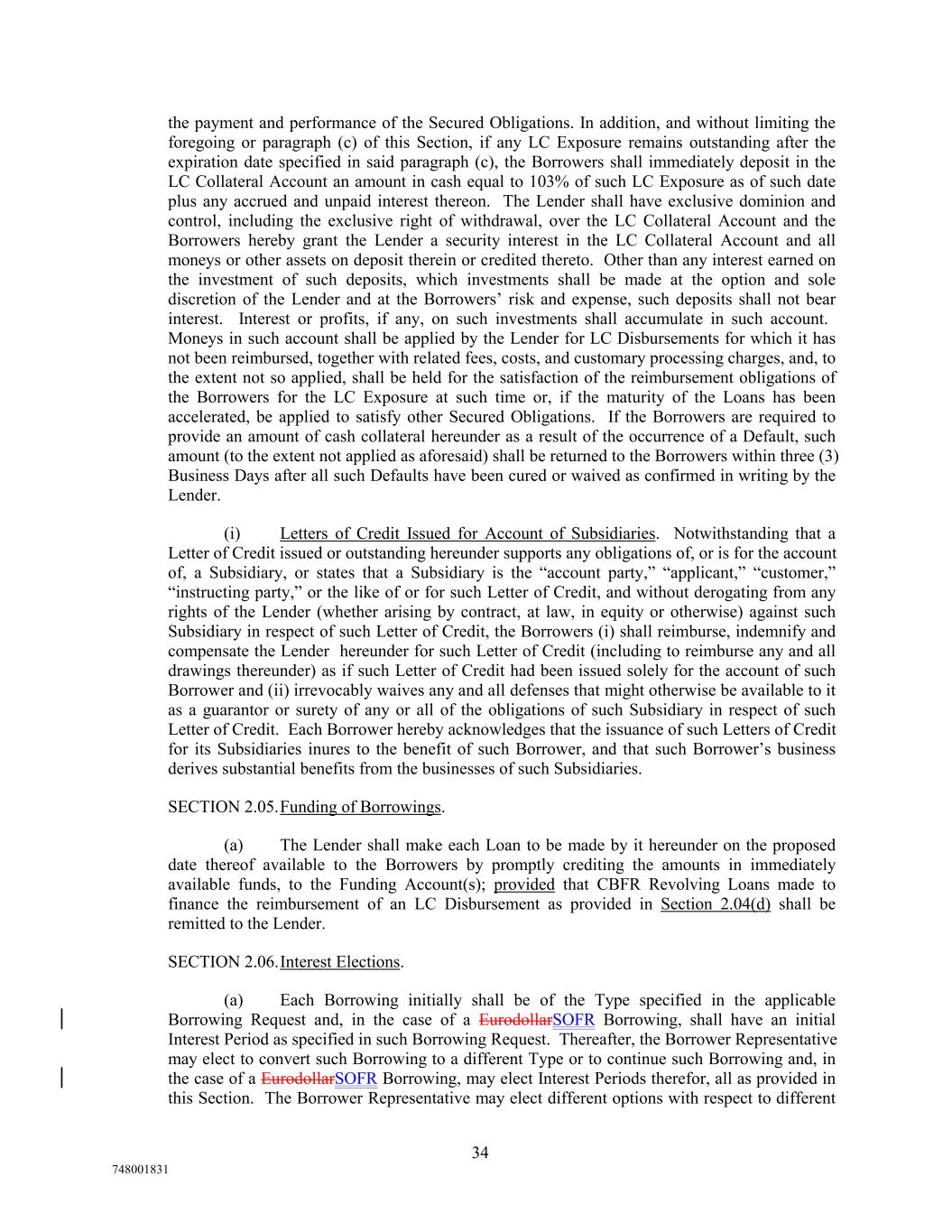 the payment and performance of the Secured Obligations. In addition, and without limiting the foregoing or paragraph (c) of this Section, if any LC Exposure remains outstanding after the expiration date specified in said paragraph (c), the Borrowers shall immediately deposit in the LC Collateral Account an amount in cash equal to 103% of such LC Exposure as of such date plus any accrued and unpaid interest thereon. The Lender shall have exclusive dominion and control, including the exclusive right of withdrawal, over the LC Collateral Account and the Borrowers hereby grant the Lender a security interest in the LC Collateral Account and all moneys or other assets on deposit therein or credited thereto. Other than any interest earned on the investment of such deposits, which investments shall be made at the option and sole discretion of the Lender and at the Borrowers’ risk and expense, such deposits shall not bear interest. Interest or profits, if any, on such investments shall accumulate in such account. Moneys in such account shall be applied by the Lender for LC Disbursements for which it has not been reimbursed, together with related fees, costs, and customary processing charges, and, to the extent not so applied, shall be held for the satisfaction of the reimbursement obligations of the Borrowers for the LC Exposure at such time or, if the maturity of the Loans has been accelerated, be applied to satisfy other Secured Obligations. If the Borrowers are required to provide an amount of cash collateral hereunder as a result of the occurrence of a Default, such amount (to the extent not applied as aforesaid) shall be returned to the Borrowers within three (3) Business Days after all such Defaults have been cured or waived as confirmed in writing by the Lender. (i) Letters of Credit Issued for Account of Subsidiaries. Notwithstanding that a Letter of Credit issued or outstanding hereunder supports any obligations of, or is for the account of, a Subsidiary, or states that a Subsidiary is the “account party,” “applicant,” “customer,” “instructing party,” or the like of or for such Letter of Credit, and without derogating from any rights of the Lender (whether arising by contract, at law, in equity or otherwise) against such Subsidiary in respect of such Letter of Credit, the Borrowers (i) shall reimburse, indemnify and compensate the Lender hereunder for such Letter of Credit (including to reimburse any and all drawings thereunder) as if such Letter of Credit had been issued solely for the account of such Borrower and (ii) irrevocably waives any and all defenses that might otherwise be available to it as a guarantor or surety of any or all of the obligations of such Subsidiary in respect of such Letter of Credit. Each Borrower hereby acknowledges that the issuance of such Letters of Credit for its Subsidiaries inures to the benefit of such Borrower, and that such Borrower’s business derives substantial benefits from the businesses of such Subsidiaries. SECTION 2.05.Funding of Borrowings. (a) The Lender shall make each Loan to be made by it hereunder on the proposed date thereof available to the Borrowers by promptly crediting the amounts in immediately available funds, to the Funding Account(s); provided that CBFR Revolving Loans made to finance the reimbursement of an LC Disbursement as provided in Section 2.04(d) shall be remitted to the Lender. SECTION 2.06.Interest Elections. (a) Each Borrowing initially shall be of the Type specified in the applicable Borrowing Request and, in the case of a EurodollarSOFR Borrowing, shall have an initial Interest Period as specified in such Borrowing Request. Thereafter, the Borrower Representative may elect to convert such Borrowing to a different Type or to continue such Borrowing and, in the case of a EurodollarSOFR Borrowing, may elect Interest Periods therefor, all as provided in this Section. The Borrower Representative may elect different options with respect to different 34 748001831