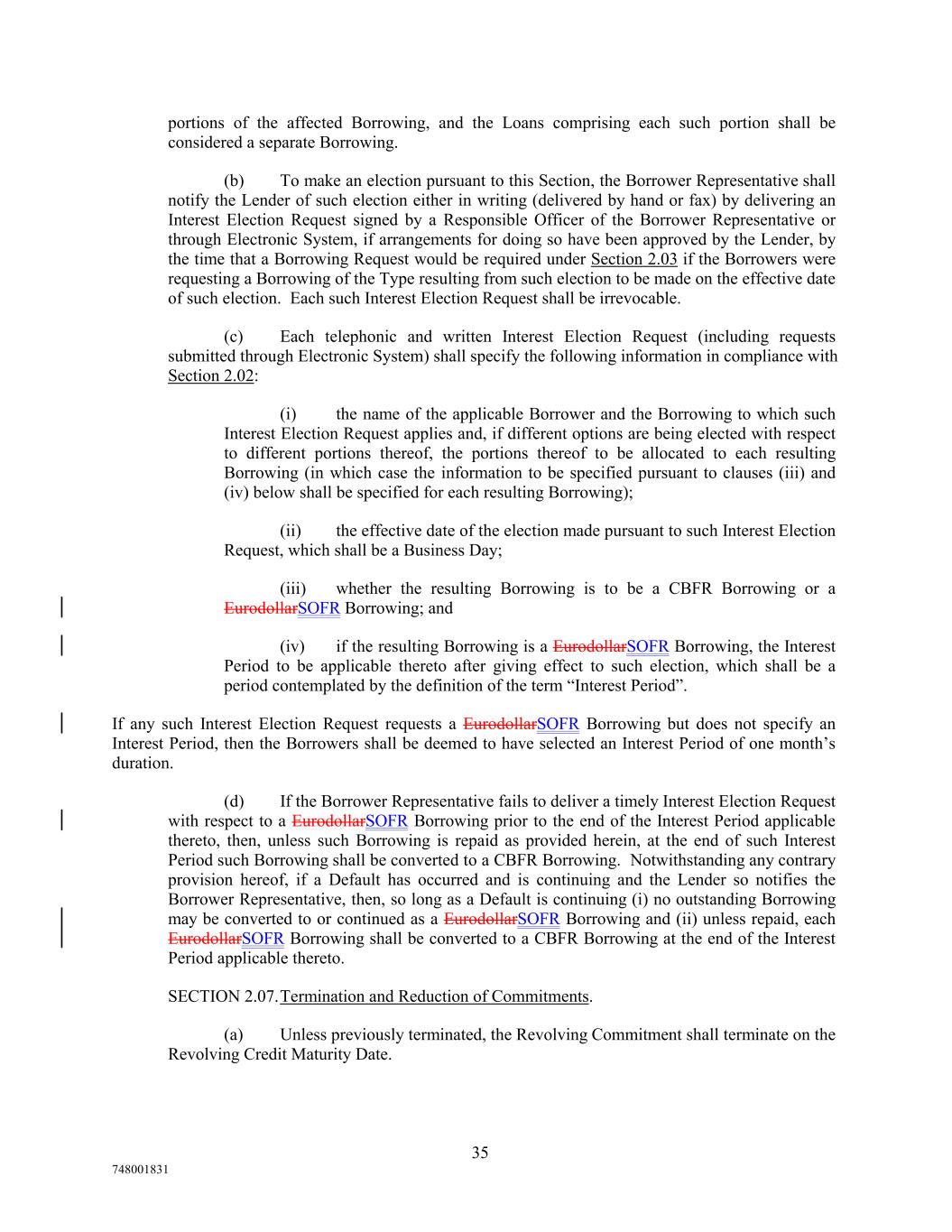 portions of the affected Borrowing, and the Loans comprising each such portion shall be considered a separate Borrowing. (b) To make an election pursuant to this Section, the Borrower Representative shall notify the Lender of such election either in writing (delivered by hand or fax) by delivering an Interest Election Request signed by a Responsible Officer of the Borrower Representative or through Electronic System, if arrangements for doing so have been approved by the Lender, by the time that a Borrowing Request would be required under Section 2.03 if the Borrowers were requesting a Borrowing of the Type resulting from such election to be made on the effective date of such election. Each such Interest Election Request shall be irrevocable. (c) Each telephonic and written Interest Election Request (including requests submitted through Electronic System) shall specify the following information in compliance with Section 2.02: (i) the name of the applicable Borrower and the Borrowing to which such Interest Election Request applies and, if different options are being elected with respect to different portions thereof, the portions thereof to be allocated to each resulting Borrowing (in which case the information to be specified pursuant to clauses (iii) and (iv) below shall be specified for each resulting Borrowing); (ii) the effective date of the election made pursuant to such Interest Election Request, which shall be a Business Day; (iii) whether the resulting Borrowing is to be a CBFR Borrowing or a EurodollarSOFR Borrowing; and (iv) if the resulting Borrowing is a EurodollarSOFR Borrowing, the Interest Period to be applicable thereto after giving effect to such election, which shall be a period contemplated by the definition of the term “Interest Period”. If any such Interest Election Request requests a EurodollarSOFR Borrowing but does not specify an Interest Period, then the Borrowers shall be deemed to have selected an Interest Period of one month’s duration. (d) If the Borrower Representative fails to deliver a timely Interest Election Request with respect to a EurodollarSOFR Borrowing prior to the end of the Interest Period applicable thereto, then, unless such Borrowing is repaid as provided herein, at the end of such Interest Period such Borrowing shall be converted to a CBFR Borrowing. Notwithstanding any contrary provision hereof, if a Default has occurred and is continuing and the Lender so notifies the Borrower Representative, then, so long as a Default is continuing (i) no outstanding Borrowing may be converted to or continued as a EurodollarSOFR Borrowing and (ii) unless repaid, each EurodollarSOFR Borrowing shall be converted to a CBFR Borrowing at the end of the Interest Period applicable thereto. SECTION 2.07.Termination and Reduction of Commitments. (a) Unless previously terminated, the Revolving Commitment shall terminate on the Revolving Credit Maturity Date. 35 748001831