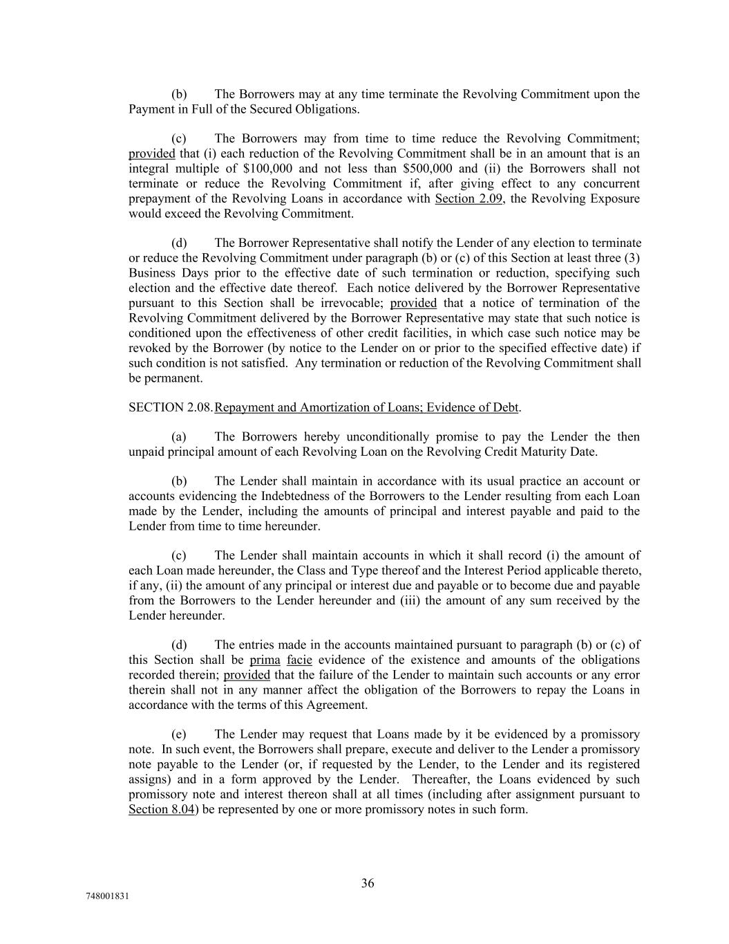(b) The Borrowers may at any time terminate the Revolving Commitment upon the Payment in Full of the Secured Obligations. (c) The Borrowers may from time to time reduce the Revolving Commitment; provided that (i) each reduction of the Revolving Commitment shall be in an amount that is an integral multiple of $100,000 and not less than $500,000 and (ii) the Borrowers shall not terminate or reduce the Revolving Commitment if, after giving effect to any concurrent prepayment of the Revolving Loans in accordance with Section 2.09, the Revolving Exposure would exceed the Revolving Commitment. (d) The Borrower Representative shall notify the Lender of any election to terminate or reduce the Revolving Commitment under paragraph (b) or (c) of this Section at least three (3) Business Days prior to the effective date of such termination or reduction, specifying such election and the effective date thereof. Each notice delivered by the Borrower Representative pursuant to this Section shall be irrevocable; provided that a notice of termination of the Revolving Commitment delivered by the Borrower Representative may state that such notice is conditioned upon the effectiveness of other credit facilities, in which case such notice may be revoked by the Borrower (by notice to the Lender on or prior to the specified effective date) if such condition is not satisfied. Any termination or reduction of the Revolving Commitment shall be permanent. SECTION 2.08.Repayment and Amortization of Loans; Evidence of Debt. (a) The Borrowers hereby unconditionally promise to pay the Lender the then unpaid principal amount of each Revolving Loan on the Revolving Credit Maturity Date. (b) The Lender shall maintain in accordance with its usual practice an account or accounts evidencing the Indebtedness of the Borrowers to the Lender resulting from each Loan made by the Lender, including the amounts of principal and interest payable and paid to the Lender from time to time hereunder. (c) The Lender shall maintain accounts in which it shall record (i) the amount of each Loan made hereunder, the Class and Type thereof and the Interest Period applicable thereto, if any, (ii) the amount of any principal or interest due and payable or to become due and payable from the Borrowers to the Lender hereunder and (iii) the amount of any sum received by the Lender hereunder. (d) The entries made in the accounts maintained pursuant to paragraph (b) or (c) of this Section shall be prima facie evidence of the existence and amounts of the obligations recorded therein; provided that the failure of the Lender to maintain such accounts or any error therein shall not in any manner affect the obligation of the Borrowers to repay the Loans in accordance with the terms of this Agreement. (e) The Lender may request that Loans made by it be evidenced by a promissory note. In such event, the Borrowers shall prepare, execute and deliver to the Lender a promissory note payable to the Lender (or, if requested by the Lender, to the Lender and its registered assigns) and in a form approved by the Lender. Thereafter, the Loans evidenced by such promissory note and interest thereon shall at all times (including after assignment pursuant to Section 8.04) be represented by one or more promissory notes in such form. 36 748001831