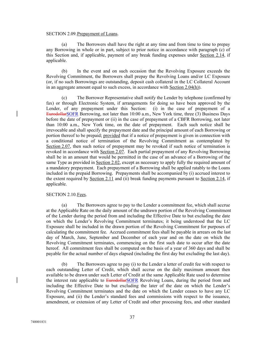 SECTION 2.09.Prepayment of Loans. (a) The Borrowers shall have the right at any time and from time to time to prepay any Borrowing in whole or in part, subject to prior notice in accordance with paragraph (c) of this Section and, if applicable, payment of any break funding expenses under Section 2.14, if applicable. (b) In the event and on such occasion that the Revolving Exposure exceeds the Revolving Commitment, the Borrowers shall prepay the Revolving Loans and/or LC Exposure (or, if no such Borrowings are outstanding, deposit cash collateral in the LC Collateral Account in an aggregate amount equal to such excess, in accordance with Section 2.04(h)). (c) The Borrower Representative shall notify the Lender by telephone (confirmed by fax) or through Electronic System, if arrangements for doing so have been approved by the Lender, of any prepayment under this Section: (i) in the case of prepayment of a EurodollarSOFR Borrowing, not later than 10:00 a.m., New York time, three (3) Business Days before the date of prepayment or (ii) in the case of prepayment of a CBFR Borrowing, not later than 10:00 a.m., New York time, on the date of prepayment. Each such notice shall be irrevocable and shall specify the prepayment date and the principal amount of each Borrowing or portion thereof to be prepaid; provided that if a notice of prepayment is given in connection with a conditional notice of termination of the Revolving Commitment as contemplated by Section 2.07, then such notice of prepayment may be revoked if such notice of termination is revoked in accordance with Section 2.07. Each partial prepayment of any Revolving Borrowing shall be in an amount that would be permitted in the case of an advance of a Borrowing of the same Type as provided in Section 2.02, except as necessary to apply fully the required amount of a mandatory prepayment. Each prepayment of a Borrowing shall be applied ratably to the Loans included in the prepaid Borrowing. Prepayments shall be accompanied by (i) accrued interest to the extent required by Section 2.11 and (ii) break funding payments pursuant to Section 2.14, if applicable. SECTION 2.10.Fees. (a) The Borrowers agree to pay to the Lender a commitment fee, which shall accrue at the Applicable Rate on the daily amount of the undrawn portion of the Revolving Commitment of the Lender during the period from and including the Effective Date to but excluding the date on which the Lender’s Revolving Commitment terminates; it being understood that the LC Exposure shall be included in the drawn portion of the Revolving Commitment for purposes of calculating the commitment fee. Accrued commitment fees shall be payable in arrears on the last day of March, June, September and December of each year and on the date on which the Revolving Commitment terminates, commencing on the first such date to occur after the date hereof. All commitment fees shall be computed on the basis of a year of 360 days and shall be payable for the actual number of days elapsed (including the first day but excluding the last day). (b) The Borrowers agree to pay (i) to the Lender a letter of credit fee with respect to each outstanding Letter of Credit, which shall accrue on the daily maximum amount then available to be drawn under such Letter of Credit at the same Applicable Rate used to determine the interest rate applicable to EurodollarSOFR Revolving Loans, during the period from and including the Effective Date to but excluding the later of the date on which the Lender’s Revolving Commitment terminates and the date on which the Lender ceases to have any LC Exposure, and (ii) the Lender’s standard fees and commissions with respect to the issuance, amendment, or extension of any Letter of Credit and other processing fees, and other standard 37 748001831