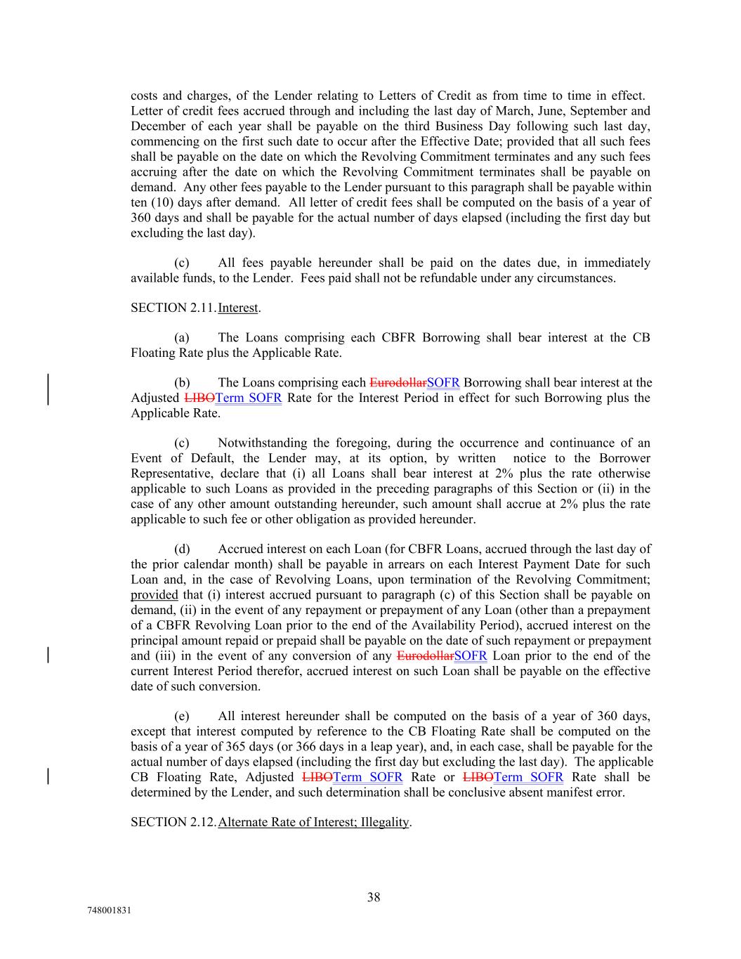 costs and charges, of the Lender relating to Letters of Credit as from time to time in effect. Letter of credit fees accrued through and including the last day of March, June, September and December of each year shall be payable on the third Business Day following such last day, commencing on the first such date to occur after the Effective Date; provided that all such fees shall be payable on the date on which the Revolving Commitment terminates and any such fees accruing after the date on which the Revolving Commitment terminates shall be payable on demand. Any other fees payable to the Lender pursuant to this paragraph shall be payable within ten (10) days after demand. All letter of credit fees shall be computed on the basis of a year of 360 days and shall be payable for the actual number of days elapsed (including the first day but excluding the last day). (c) All fees payable hereunder shall be paid on the dates due, in immediately available funds, to the Lender. Fees paid shall not be refundable under any circumstances. SECTION 2.11.Interest. (a) The Loans comprising each CBFR Borrowing shall bear interest at the CB Floating Rate plus the Applicable Rate. (b) The Loans comprising each EurodollarSOFR Borrowing shall bear interest at the Adjusted LIBOTerm SOFR Rate for the Interest Period in effect for such Borrowing plus the Applicable Rate. (c) Notwithstanding the foregoing, during the occurrence and continuance of an Event of Default, the Lender may, at its option, by written notice to the Borrower Representative, declare that (i) all Loans shall bear interest at 2% plus the rate otherwise applicable to such Loans as provided in the preceding paragraphs of this Section or (ii) in the case of any other amount outstanding hereunder, such amount shall accrue at 2% plus the rate applicable to such fee or other obligation as provided hereunder. (d) Accrued interest on each Loan (for CBFR Loans, accrued through the last day of the prior calendar month) shall be payable in arrears on each Interest Payment Date for such Loan and, in the case of Revolving Loans, upon termination of the Revolving Commitment; provided that (i) interest accrued pursuant to paragraph (c) of this Section shall be payable on demand, (ii) in the event of any repayment or prepayment of any Loan (other than a prepayment of a CBFR Revolving Loan prior to the end of the Availability Period), accrued interest on the principal amount repaid or prepaid shall be payable on the date of such repayment or prepayment and (iii) in the event of any conversion of any EurodollarSOFR Loan prior to the end of the current Interest Period therefor, accrued interest on such Loan shall be payable on the effective date of such conversion. (e) All interest hereunder shall be computed on the basis of a year of 360 days, except that interest computed by reference to the CB Floating Rate shall be computed on the basis of a year of 365 days (or 366 days in a leap year), and, in each case, shall be payable for the actual number of days elapsed (including the first day but excluding the last day). The applicable CB Floating Rate, Adjusted LIBOTerm SOFR Rate or LIBOTerm SOFR Rate shall be determined by the Lender, and such determination shall be conclusive absent manifest error. SECTION 2.12.Alternate Rate of Interest; Illegality. 38 748001831
