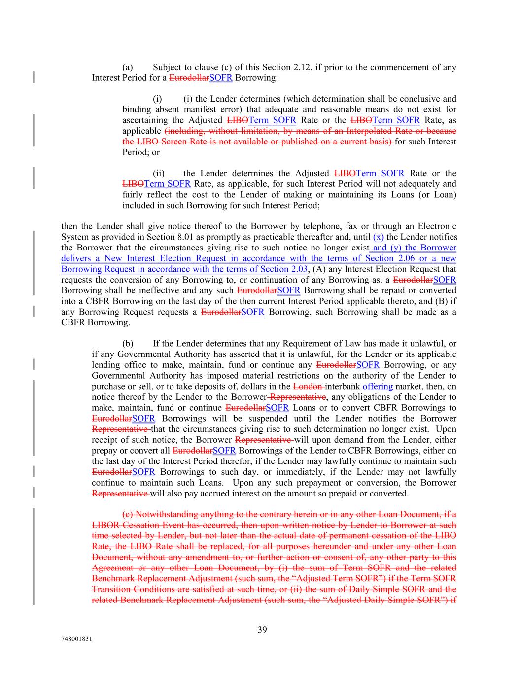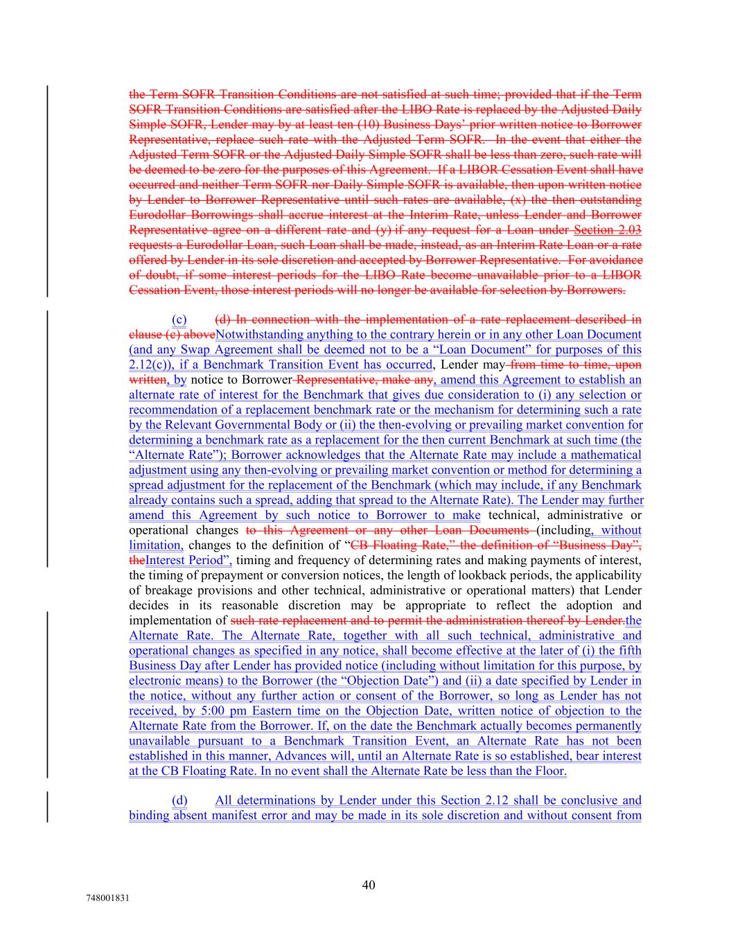 the Term SOFR Transition Conditions are not satisfied at such time; provided that if the Term SOFR Transition Conditions are satisfied after the LIBO Rate is replaced by the Adjusted Daily Simple SOFR, Lender may by at least ten (10) Business Days’ prior written notice to Borrower Representative, replace such rate with the Adjusted Term SOFR. In the event that either the Adjusted Term SOFR or the Adjusted Daily Simple SOFR shall be less than zero, such rate will be deemed to be zero for the purposes of this Agreement. If a LIBOR Cessation Event shall have occurred and neither Term SOFR nor Daily Simple SOFR is available, then upon written notice by Lender to Borrower Representative until such rates are available, (x) the then outstanding Eurodollar Borrowings shall accrue interest at the Interim Rate, unless Lender and Borrower Representative agree on a different rate and (y) if any request for a Loan under Section 2.03 requests a Eurodollar Loan, such Loan shall be made, instead, as an Interim Rate Loan or a rate offered by Lender in its sole discretion and accepted by Borrower Representative. For avoidance of doubt, if some interest periods for the LIBO Rate become unavailable prior to a LIBOR Cessation Event, those interest periods will no longer be available for selection by Borrowers. (c) (d) In connection with the implementation of a rate replacement described in clause (c) aboveNotwithstanding anything to the contrary herein or in any other Loan Document (and any Swap Agreement shall be deemed not to be a “Loan Document” for purposes of this 2.12(c)), if a Benchmark Transition Event has occurred, Lender may from time to time, upon written, by notice to Borrower Representative, make any, amend this Agreement to establish an alternate rate of interest for the Benchmark that gives due consideration to (i) any selection or recommendation of a replacement benchmark rate or the mechanism for determining such a rate by the Relevant Governmental Body or (ii) the then-evolving or prevailing market convention for determining a benchmark rate as a replacement for the then current Benchmark at such time (the “Alternate Rate”); Borrower acknowledges that the Alternate Rate may include a mathematical adjustment using any then-evolving or prevailing market convention or method for determining a spread adjustment for the replacement of the Benchmark (which may include, if any Benchmark already contains such a spread, adding that spread to the Alternate Rate). The Lender may further amend this Agreement by such notice to Borrower to make technical, administrative or operational changes to this Agreement or any other Loan Documents (including, without limitation, changes to the definition of “CB Floating Rate,” the definition of “Business Day”, theInterest Period”, timing and frequency of determining rates and making payments of interest, the timing of prepayment or conversion notices, the length of lookback periods, the applicability of breakage provisions and other technical, administrative or operational matters) that Lender decides in its reasonable discretion may be appropriate to reflect the adoption and implementation of such rate replacement and to permit the administration thereof by Lender.the Alternate Rate. The Alternate Rate, together with all such technical, administrative and operational changes as specified in any notice, shall become effective at the later of (i) the fifth Business Day after Lender has provided notice (including without limitation for this purpose, by electronic means) to the Borrower (the “Objection Date”) and (ii) a date specified by Lender in the notice, without any further action or consent of the Borrower, so long as Lender has not received, by 5:00 pm Eastern time on the Objection Date, written notice of objection to the Alternate Rate from the Borrower. If, on the date the Benchmark actually becomes permanently unavailable pursuant to a Benchmark Transition Event, an Alternate Rate has not been established in this manner, Advances will, until an Alternate Rate is so established, bear interest at the CB Floating Rate. In no event shall the Alternate Rate be less than the Floor. (d) All determinations by Lender under this Section 2.12 shall be conclusive and binding absent manifest error and may be made in its sole discretion and without consent from 40 748001831