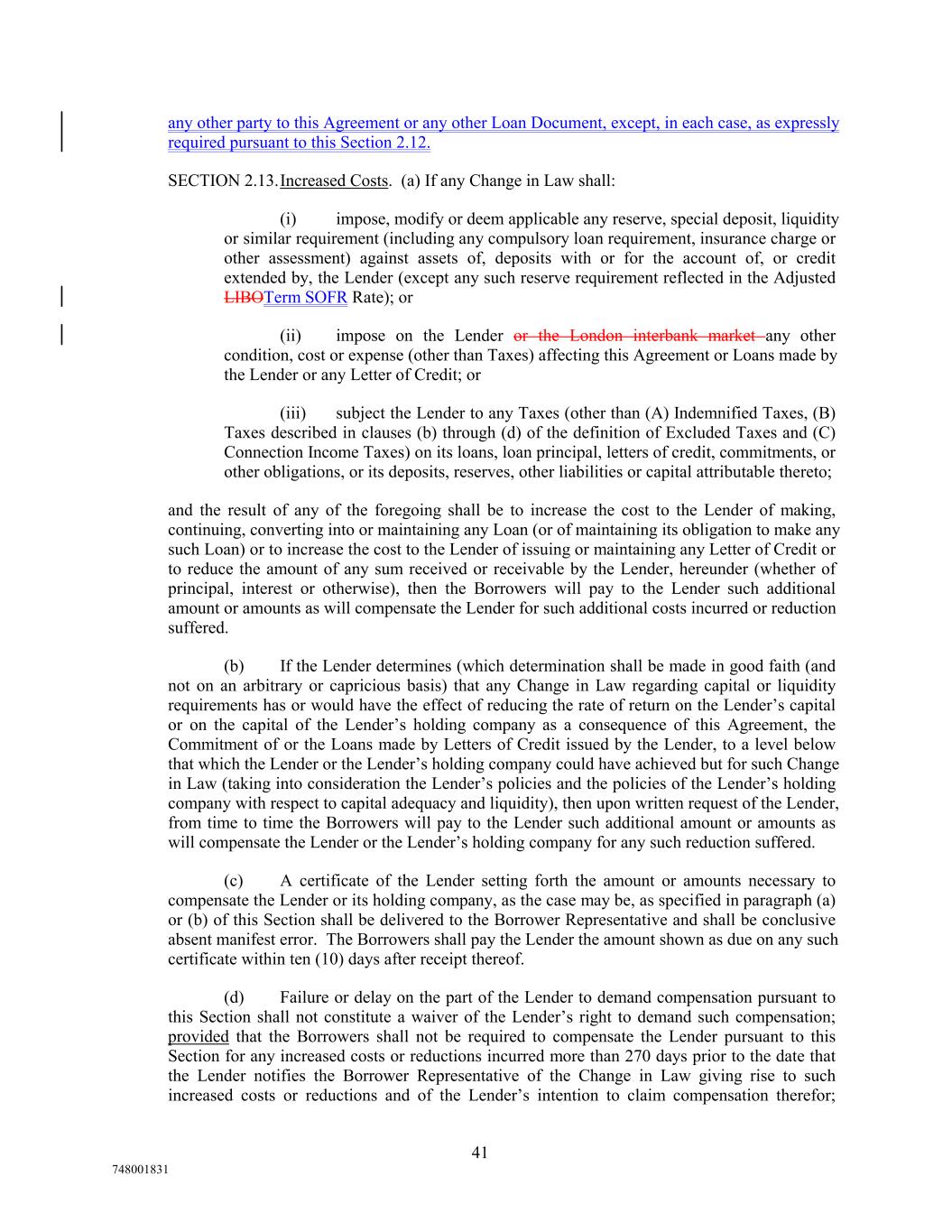 any other party to this Agreement or any other Loan Document, except, in each case, as expressly required pursuant to this Section 2.12. SECTION 2.13.Increased Costs. (a) If any Change in Law shall: (i) impose, modify or deem applicable any reserve, special deposit, liquidity or similar requirement (including any compulsory loan requirement, insurance charge or other assessment) against assets of, deposits with or for the account of, or credit extended by, the Lender (except any such reserve requirement reflected in the Adjusted LIBOTerm SOFR Rate); or (ii) impose on the Lender or the London interbank market any other condition, cost or expense (other than Taxes) affecting this Agreement or Loans made by the Lender or any Letter of Credit; or (iii) subject the Lender to any Taxes (other than (A) Indemnified Taxes, (B) Taxes described in clauses (b) through (d) of the definition of Excluded Taxes and (C) Connection Income Taxes) on its loans, loan principal, letters of credit, commitments, or other obligations, or its deposits, reserves, other liabilities or capital attributable thereto; and the result of any of the foregoing shall be to increase the cost to the Lender of making, continuing, converting into or maintaining any Loan (or of maintaining its obligation to make any such Loan) or to increase the cost to the Lender of issuing or maintaining any Letter of Credit or to reduce the amount of any sum received or receivable by the Lender, hereunder (whether of principal, interest or otherwise), then the Borrowers will pay to the Lender such additional amount or amounts as will compensate the Lender for such additional costs incurred or reduction suffered. (b) If the Lender determines (which determination shall be made in good faith (and not on an arbitrary or capricious basis) that any Change in Law regarding capital or liquidity requirements has or would have the effect of reducing the rate of return on the Lender’s capital or on the capital of the Lender’s holding company as a consequence of this Agreement, the Commitment of or the Loans made by Letters of Credit issued by the Lender, to a level below that which the Lender or the Lender’s holding company could have achieved but for such Change in Law (taking into consideration the Lender’s policies and the policies of the Lender’s holding company with respect to capital adequacy and liquidity), then upon written request of the Lender, from time to time the Borrowers will pay to the Lender such additional amount or amounts as will compensate the Lender or the Lender’s holding company for any such reduction suffered. (c) A certificate of the Lender setting forth the amount or amounts necessary to compensate the Lender or its holding company, as the case may be, as specified in paragraph (a) or (b) of this Section shall be delivered to the Borrower Representative and shall be conclusive absent manifest error. The Borrowers shall pay the Lender the amount shown as due on any such certificate within ten (10) days after receipt thereof. (d) Failure or delay on the part of the Lender to demand compensation pursuant to this Section shall not constitute a waiver of the Lender’s right to demand such compensation; provided that the Borrowers shall not be required to compensate the Lender pursuant to this Section for any increased costs or reductions incurred more than 270 days prior to the date that the Lender notifies the Borrower Representative of the Change in Law giving rise to such increased costs or reductions and of the Lender’s intention to claim compensation therefor; 41 748001831
