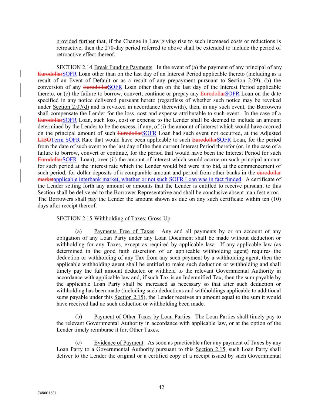 provided further that, if the Change in Law giving rise to such increased costs or reductions is retroactive, then the 270-day period referred to above shall be extended to include the period of retroactive effect thereof. SECTION 2.14.Break Funding Payments. In the event of (a) the payment of any principal of any EurodollarSOFR Loan other than on the last day of an Interest Period applicable thereto (including as a result of an Event of Default or as a result of any prepayment pursuant to Section 2.09), (b) the conversion of any EurodollarSOFR Loan other than on the last day of the Interest Period applicable thereto, or (c) the failure to borrow, convert, continue or prepay any EurodollarSOFR Loan on the date specified in any notice delivered pursuant hereto (regardless of whether such notice may be revoked under Section 2.07(d) and is revoked in accordance therewith), then, in any such event, the Borrowers shall compensate the Lender for the loss, cost and expense attributable to such event. In the case of a EurodollarSOFR Loan, such loss, cost or expense to the Lender shall be deemed to include an amount determined by the Lender to be the excess, if any, of (i) the amount of interest which would have accrued on the principal amount of such EurodollarSOFR Loan had such event not occurred, at the Adjusted LIBOTerm SOFR Rate that would have been applicable to such EurodollarSOFR Loan, for the period from the date of such event to the last day of the then current Interest Period therefor (or, in the case of a failure to borrow, convert or continue, for the period that would have been the Interest Period for such EurodollarSOFR Loan), over (ii) the amount of interest which would accrue on such principal amount for such period at the interest rate which the Lender would bid were it to bid, at the commencement of such period, for dollar deposits of a comparable amount and period from other banks in the eurodollar marketapplicable interbank market, whether or not such SOFR Loan was in fact funded. A certificate of the Lender setting forth any amount or amounts that the Lender is entitled to receive pursuant to this Section shall be delivered to the Borrower Representative and shall be conclusive absent manifest error. The Borrowers shall pay the Lender the amount shown as due on any such certificate within ten (10) days after receipt thereof. SECTION 2.15.Withholding of Taxes; Gross-Up. (a) Payments Free of Taxes. Any and all payments by or on account of any obligation of any Loan Party under any Loan Document shall be made without deduction or withholding for any Taxes, except as required by applicable law. If any applicable law (as determined in the good faith discretion of an applicable withholding agent) requires the deduction or withholding of any Tax from any such payment by a withholding agent, then the applicable withholding agent shall be entitled to make such deduction or withholding and shall timely pay the full amount deducted or withheld to the relevant Governmental Authority in accordance with applicable law and, if such Tax is an Indemnified Tax, then the sum payable by the applicable Loan Party shall be increased as necessary so that after such deduction or withholding has been made (including such deductions and withholdings applicable to additional sums payable under this Section 2.15), the Lender receives an amount equal to the sum it would have received had no such deduction or withholding been made. (b) Payment of Other Taxes by Loan Parties. The Loan Parties shall timely pay to the relevant Governmental Authority in accordance with applicable law, or at the option of the Lender timely reimburse it for, Other Taxes. (c) Evidence of Payment. As soon as practicable after any payment of Taxes by any Loan Party to a Governmental Authority pursuant to this Section 2.15, such Loan Party shall deliver to the Lender the original or a certified copy of a receipt issued by such Governmental 42 748001831
