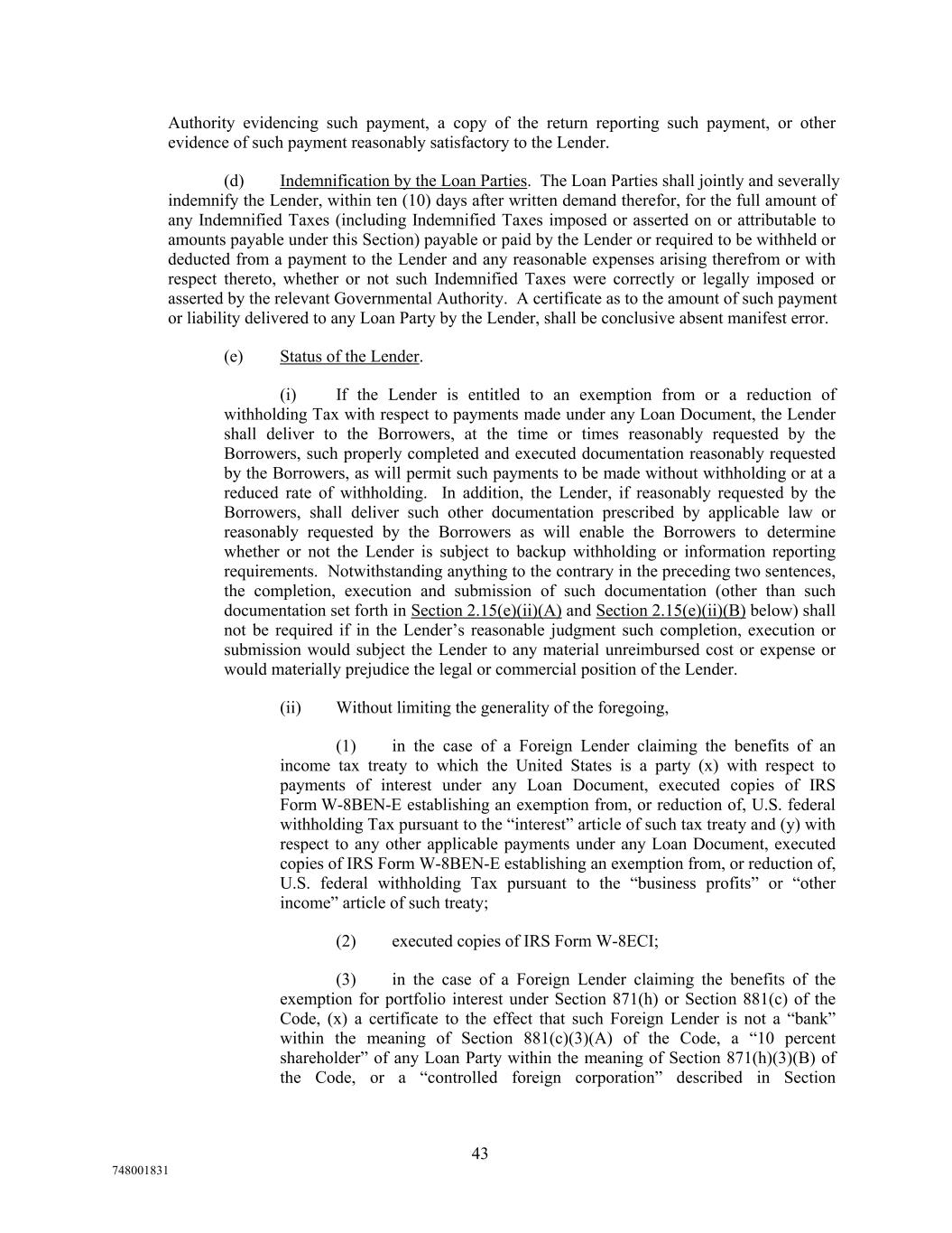 Authority evidencing such payment, a copy of the return reporting such payment, or other evidence of such payment reasonably satisfactory to the Lender. (d) Indemnification by the Loan Parties. The Loan Parties shall jointly and severally indemnify the Lender, within ten (10) days after written demand therefor, for the full amount of any Indemnified Taxes (including Indemnified Taxes imposed or asserted on or attributable to amounts payable under this Section) payable or paid by the Lender or required to be withheld or deducted from a payment to the Lender and any reasonable expenses arising therefrom or with respect thereto, whether or not such Indemnified Taxes were correctly or legally imposed or asserted by the relevant Governmental Authority. A certificate as to the amount of such payment or liability delivered to any Loan Party by the Lender, shall be conclusive absent manifest error. (e) Status of the Lender. (i) If the Lender is entitled to an exemption from or a reduction of withholding Tax with respect to payments made under any Loan Document, the Lender shall deliver to the Borrowers, at the time or times reasonably requested by the Borrowers, such properly completed and executed documentation reasonably requested by the Borrowers, as will permit such payments to be made without withholding or at a reduced rate of withholding. In addition, the Lender, if reasonably requested by the Borrowers, shall deliver such other documentation prescribed by applicable law or reasonably requested by the Borrowers as will enable the Borrowers to determine whether or not the Lender is subject to backup withholding or information reporting requirements. Notwithstanding anything to the contrary in the preceding two sentences, the completion, execution and submission of such documentation (other than such documentation set forth in Section 2.15(e)(ii)(A) and Section 2.15(e)(ii)(B) below) shall not be required if in the Lender’s reasonable judgment such completion, execution or submission would subject the Lender to any material unreimbursed cost or expense or would materially prejudice the legal or commercial position of the Lender. (ii) Without limiting the generality of the foregoing, (1) in the case of a Foreign Lender claiming the benefits of an income tax treaty to which the United States is a party (x) with respect to payments of interest under any Loan Document, executed copies of IRS Form W-8BEN-E establishing an exemption from, or reduction of, U.S. federal withholding Tax pursuant to the “interest” article of such tax treaty and (y) with respect to any other applicable payments under any Loan Document, executed copies of IRS Form W-8BEN-E establishing an exemption from, or reduction of, U.S. federal withholding Tax pursuant to the “business profits” or “other income” article of such treaty; (2) executed copies of IRS Form W-8ECI; (3) in the case of a Foreign Lender claiming the benefits of the exemption for portfolio interest under Section 871(h) or Section 881(c) of the Code, (x) a certificate to the effect that such Foreign Lender is not a “bank” within the meaning of Section 881(c)(3)(A) of the Code, a “10 percent shareholder” of any Loan Party within the meaning of Section 871(h)(3)(B) of the Code, or a “controlled foreign corporation” described in Section 43 748001831