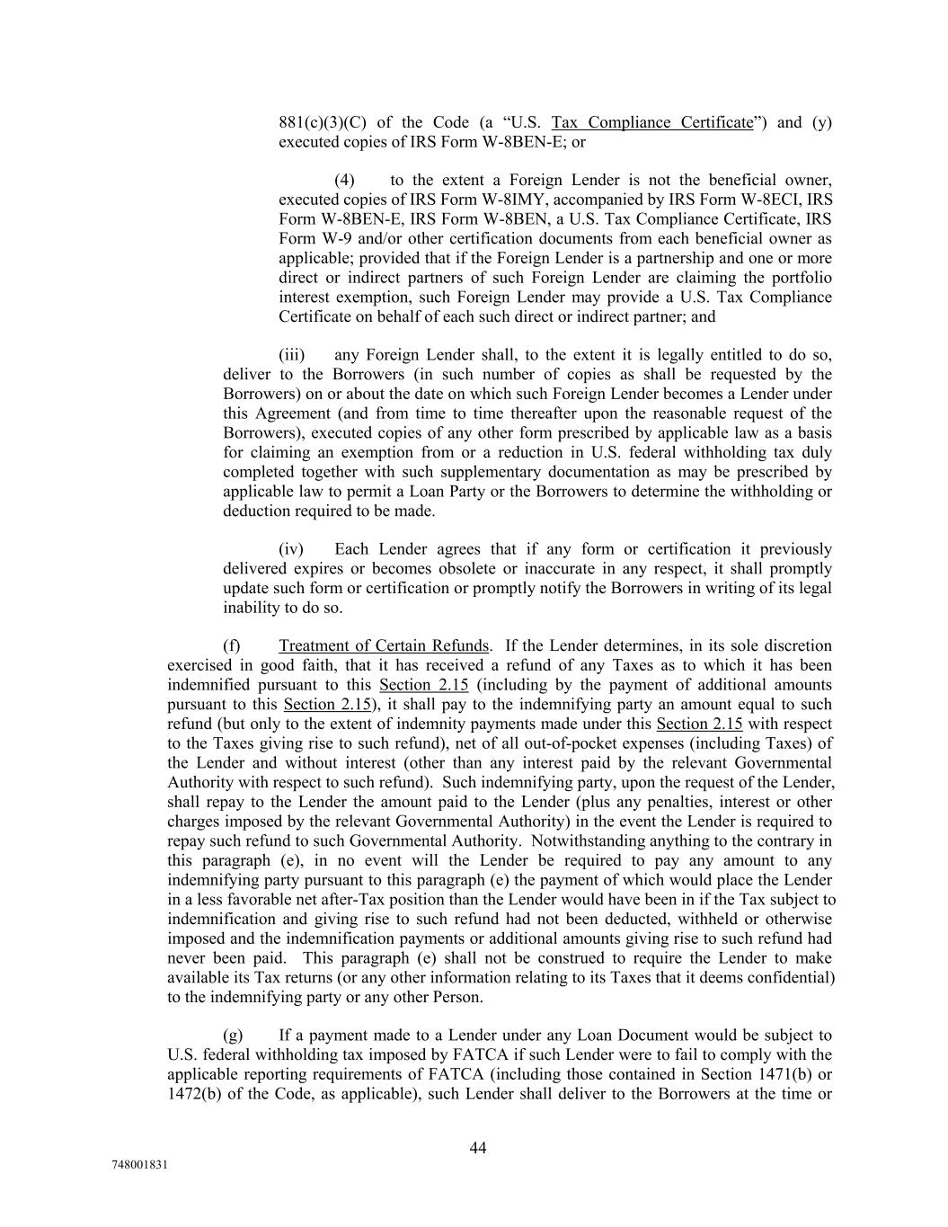 881(c)(3)(C) of the Code (a “U.S. Tax Compliance Certificate”) and (y) executed copies of IRS Form W-8BEN-E; or (4) to the extent a Foreign Lender is not the beneficial owner, executed copies of IRS Form W-8IMY, accompanied by IRS Form W-8ECI, IRS Form W-8BEN-E, IRS Form W-8BEN, a U.S. Tax Compliance Certificate, IRS Form W-9 and/or other certification documents from each beneficial owner as applicable; provided that if the Foreign Lender is a partnership and one or more direct or indirect partners of such Foreign Lender are claiming the portfolio interest exemption, such Foreign Lender may provide a U.S. Tax Compliance Certificate on behalf of each such direct or indirect partner; and (iii) any Foreign Lender shall, to the extent it is legally entitled to do so, deliver to the Borrowers (in such number of copies as shall be requested by the Borrowers) on or about the date on which such Foreign Lender becomes a Lender under this Agreement (and from time to time thereafter upon the reasonable request of the Borrowers), executed copies of any other form prescribed by applicable law as a basis for claiming an exemption from or a reduction in U.S. federal withholding tax duly completed together with such supplementary documentation as may be prescribed by applicable law to permit a Loan Party or the Borrowers to determine the withholding or deduction required to be made. (iv) Each Lender agrees that if any form or certification it previously delivered expires or becomes obsolete or inaccurate in any respect, it shall promptly update such form or certification or promptly notify the Borrowers in writing of its legal inability to do so. (f) Treatment of Certain Refunds. If the Lender determines, in its sole discretion exercised in good faith, that it has received a refund of any Taxes as to which it has been indemnified pursuant to this Section 2.15 (including by the payment of additional amounts pursuant to this Section 2.15), it shall pay to the indemnifying party an amount equal to such refund (but only to the extent of indemnity payments made under this Section 2.15 with respect to the Taxes giving rise to such refund), net of all out-of-pocket expenses (including Taxes) of the Lender and without interest (other than any interest paid by the relevant Governmental Authority with respect to such refund). Such indemnifying party, upon the request of the Lender, shall repay to the Lender the amount paid to the Lender (plus any penalties, interest or other charges imposed by the relevant Governmental Authority) in the event the Lender is required to repay such refund to such Governmental Authority. Notwithstanding anything to the contrary in this paragraph (e), in no event will the Lender be required to pay any amount to any indemnifying party pursuant to this paragraph (e) the payment of which would place the Lender in a less favorable net after-Tax position than the Lender would have been in if the Tax subject to indemnification and giving rise to such refund had not been deducted, withheld or otherwise imposed and the indemnification payments or additional amounts giving rise to such refund had never been paid. This paragraph (e) shall not be construed to require the Lender to make available its Tax returns (or any other information relating to its Taxes that it deems confidential) to the indemnifying party or any other Person. (g) If a payment made to a Lender under any Loan Document would be subject to U.S. federal withholding tax imposed by FATCA if such Lender were to fail to comply with the applicable reporting requirements of FATCA (including those contained in Section 1471(b) or 1472(b) of the Code, as applicable), such Lender shall deliver to the Borrowers at the time or 44 748001831