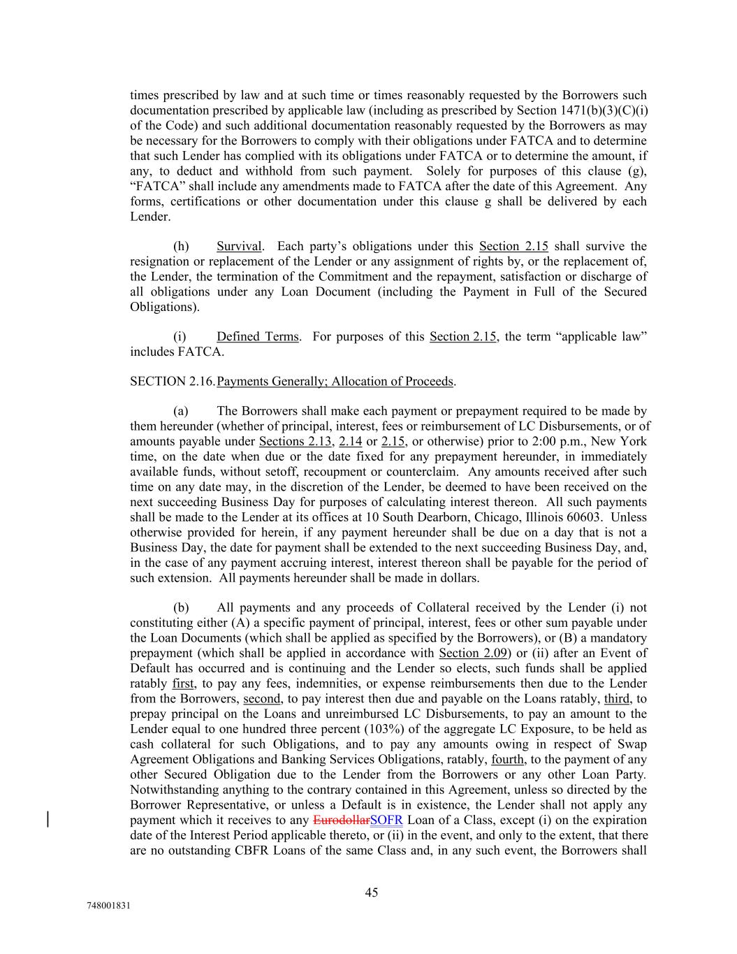 times prescribed by law and at such time or times reasonably requested by the Borrowers such documentation prescribed by applicable law (including as prescribed by Section 1471(b)(3)(C)(i) of the Code) and such additional documentation reasonably requested by the Borrowers as may be necessary for the Borrowers to comply with their obligations under FATCA and to determine that such Lender has complied with its obligations under FATCA or to determine the amount, if any, to deduct and withhold from such payment. Solely for purposes of this clause (g), “FATCA” shall include any amendments made to FATCA after the date of this Agreement. Any forms, certifications or other documentation under this clause g shall be delivered by each Lender. (h) Survival. Each party’s obligations under this Section 2.15 shall survive the resignation or replacement of the Lender or any assignment of rights by, or the replacement of, the Lender, the termination of the Commitment and the repayment, satisfaction or discharge of all obligations under any Loan Document (including the Payment in Full of the Secured Obligations). (i) Defined Terms. For purposes of this Section 2.15, the term “applicable law” includes FATCA. SECTION 2.16.Payments Generally; Allocation of Proceeds. (a) The Borrowers shall make each payment or prepayment required to be made by them hereunder (whether of principal, interest, fees or reimbursement of LC Disbursements, or of amounts payable under Sections 2.13, 2.14 or 2.15, or otherwise) prior to 2:00 p.m., New York time, on the date when due or the date fixed for any prepayment hereunder, in immediately available funds, without setoff, recoupment or counterclaim. Any amounts received after such time on any date may, in the discretion of the Lender, be deemed to have been received on the next succeeding Business Day for purposes of calculating interest thereon. All such payments shall be made to the Lender at its offices at 10 South Dearborn, Chicago, Illinois 60603. Unless otherwise provided for herein, if any payment hereunder shall be due on a day that is not a Business Day, the date for payment shall be extended to the next succeeding Business Day, and, in the case of any payment accruing interest, interest thereon shall be payable for the period of such extension. All payments hereunder shall be made in dollars. (b) All payments and any proceeds of Collateral received by the Lender (i) not constituting either (A) a specific payment of principal, interest, fees or other sum payable under the Loan Documents (which shall be applied as specified by the Borrowers), or (B) a mandatory prepayment (which shall be applied in accordance with Section 2.09) or (ii) after an Event of Default has occurred and is continuing and the Lender so elects, such funds shall be applied ratably first, to pay any fees, indemnities, or expense reimbursements then due to the Lender from the Borrowers, second, to pay interest then due and payable on the Loans ratably, third, to prepay principal on the Loans and unreimbursed LC Disbursements, to pay an amount to the Lender equal to one hundred three percent (103%) of the aggregate LC Exposure, to be held as cash collateral for such Obligations, and to pay any amounts owing in respect of Swap Agreement Obligations and Banking Services Obligations, ratably, fourth, to the payment of any other Secured Obligation due to the Lender from the Borrowers or any other Loan Party. Notwithstanding anything to the contrary contained in this Agreement, unless so directed by the Borrower Representative, or unless a Default is in existence, the Lender shall not apply any payment which it receives to any EurodollarSOFR Loan of a Class, except (i) on the expiration date of the Interest Period applicable thereto, or (ii) in the event, and only to the extent, that there are no outstanding CBFR Loans of the same Class and, in any such event, the Borrowers shall 45 748001831
