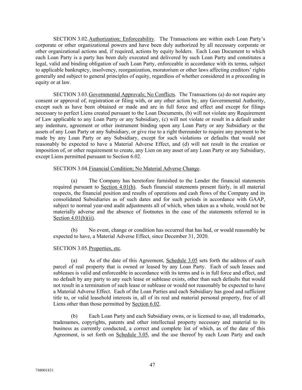 SECTION 3.02.Authorization; Enforceability. The Transactions are within each Loan Party’s corporate or other organizational powers and have been duly authorized by all necessary corporate or other organizational actions and, if required, actions by equity holders. Each Loan Document to which each Loan Party is a party has been duly executed and delivered by such Loan Party and constitutes a legal, valid and binding obligation of such Loan Party, enforceable in accordance with its terms, subject to applicable bankruptcy, insolvency, reorganization, moratorium or other laws affecting creditors’ rights generally and subject to general principles of equity, regardless of whether considered in a proceeding in equity or at law. SECTION 3.03.Governmental Approvals; No Conflicts. The Transactions (a) do not require any consent or approval of, registration or filing with, or any other action by, any Governmental Authority, except such as have been obtained or made and are in full force and effect and except for filings necessary to perfect Liens created pursuant to the Loan Documents, (b) will not violate any Requirement of Law applicable to any Loan Party or any Subsidiary, (c) will not violate or result in a default under any indenture, agreement or other instrument binding upon any Loan Party or any Subsidiary or the assets of any Loan Party or any Subsidiary, or give rise to a right thereunder to require any payment to be made by any Loan Party or any Subsidiary, except for such violations or defaults that would not reasonably be expected to have a Material Adverse Effect, and (d) will not result in the creation or imposition of, or other requirement to create, any Lien on any asset of any Loan Party or any Subsidiary, except Liens permitted pursuant to Section 6.02. SECTION 3.04.Financial Condition; No Material Adverse Change. (a) The Company has heretofore furnished to the Lender the financial statements required pursuant to Section 4.01(b). Such financial statements present fairly, in all material respects, the financial position and results of operations and cash flows of the Company and its consolidated Subsidiaries as of such dates and for such periods in accordance with GAAP, subject to normal year-end audit adjustments all of which, when taken as a whole, would not be materially adverse and the absence of footnotes in the case of the statements referred to in Section 4.01(b)(ii). (b) No event, change or condition has occurred that has had, or would reasonably be expected to have, a Material Adverse Effect, since December 31, 2020. SECTION 3.05.Properties, etc. (a) As of the date of this Agreement, Schedule 3.05 sets forth the address of each parcel of real property that is owned or leased by any Loan Party. Each of such leases and subleases is valid and enforceable in accordance with its terms and is in full force and effect, and no default by any party to any such lease or sublease exists, other than such defaults that would not result in a termination of such lease or sublease or would not reasonably be expected to have a Material Adverse Effect. Each of the Loan Parties and each Subsidiary has good and sufficient title to, or valid leasehold interests in, all of its real and material personal property, free of all Liens other than those permitted by Section 6.02. (b) Each Loan Party and each Subsidiary owns, or is licensed to use, all trademarks, tradenames, copyrights, patents and other intellectual property necessary and material to its business as currently conducted, a correct and complete list of which, as of the date of this Agreement, is set forth on Schedule 3.05, and the use thereof by each Loan Party and each 47 748001831