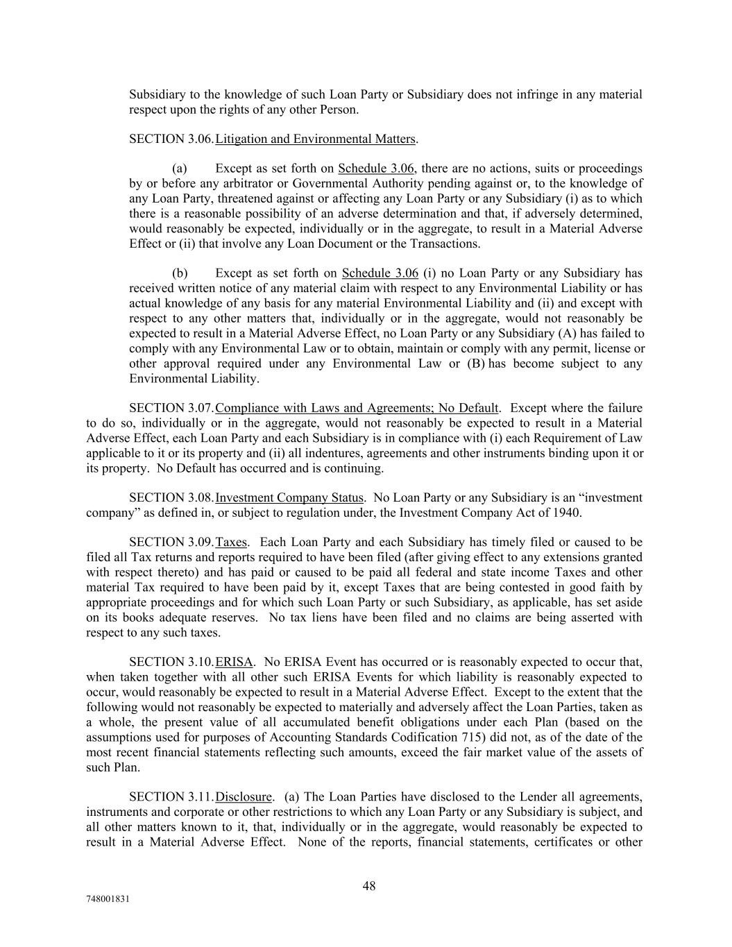 Subsidiary to the knowledge of such Loan Party or Subsidiary does not infringe in any material respect upon the rights of any other Person. SECTION 3.06.Litigation and Environmental Matters. (a) Except as set forth on Schedule 3.06, there are no actions, suits or proceedings by or before any arbitrator or Governmental Authority pending against or, to the knowledge of any Loan Party, threatened against or affecting any Loan Party or any Subsidiary (i) as to which there is a reasonable possibility of an adverse determination and that, if adversely determined, would reasonably be expected, individually or in the aggregate, to result in a Material Adverse Effect or (ii) that involve any Loan Document or the Transactions. (b) Except as set forth on Schedule 3.06 (i) no Loan Party or any Subsidiary has received written notice of any material claim with respect to any Environmental Liability or has actual knowledge of any basis for any material Environmental Liability and (ii) and except with respect to any other matters that, individually or in the aggregate, would not reasonably be expected to result in a Material Adverse Effect, no Loan Party or any Subsidiary (A) has failed to comply with any Environmental Law or to obtain, maintain or comply with any permit, license or other approval required under any Environmental Law or (B) has become subject to any Environmental Liability. SECTION 3.07.Compliance with Laws and Agreements; No Default. Except where the failure to do so, individually or in the aggregate, would not reasonably be expected to result in a Material Adverse Effect, each Loan Party and each Subsidiary is in compliance with (i) each Requirement of Law applicable to it or its property and (ii) all indentures, agreements and other instruments binding upon it or its property. No Default has occurred and is continuing. SECTION 3.08.Investment Company Status. No Loan Party or any Subsidiary is an “investment company” as defined in, or subject to regulation under, the Investment Company Act of 1940. SECTION 3.09.Taxes. Each Loan Party and each Subsidiary has timely filed or caused to be filed all Tax returns and reports required to have been filed (after giving effect to any extensions granted with respect thereto) and has paid or caused to be paid all federal and state income Taxes and other material Tax required to have been paid by it, except Taxes that are being contested in good faith by appropriate proceedings and for which such Loan Party or such Subsidiary, as applicable, has set aside on its books adequate reserves. No tax liens have been filed and no claims are being asserted with respect to any such taxes. SECTION 3.10.ERISA. No ERISA Event has occurred or is reasonably expected to occur that, when taken together with all other such ERISA Events for which liability is reasonably expected to occur, would reasonably be expected to result in a Material Adverse Effect. Except to the extent that the following would not reasonably be expected to materially and adversely affect the Loan Parties, taken as a whole, the present value of all accumulated benefit obligations under each Plan (based on the assumptions used for purposes of Accounting Standards Codification 715) did not, as of the date of the most recent financial statements reflecting such amounts, exceed the fair market value of the assets of such Plan. SECTION 3.11.Disclosure. (a) The Loan Parties have disclosed to the Lender all agreements, instruments and corporate or other restrictions to which any Loan Party or any Subsidiary is subject, and all other matters known to it, that, individually or in the aggregate, would reasonably be expected to result in a Material Adverse Effect. None of the reports, financial statements, certificates or other 48 748001831