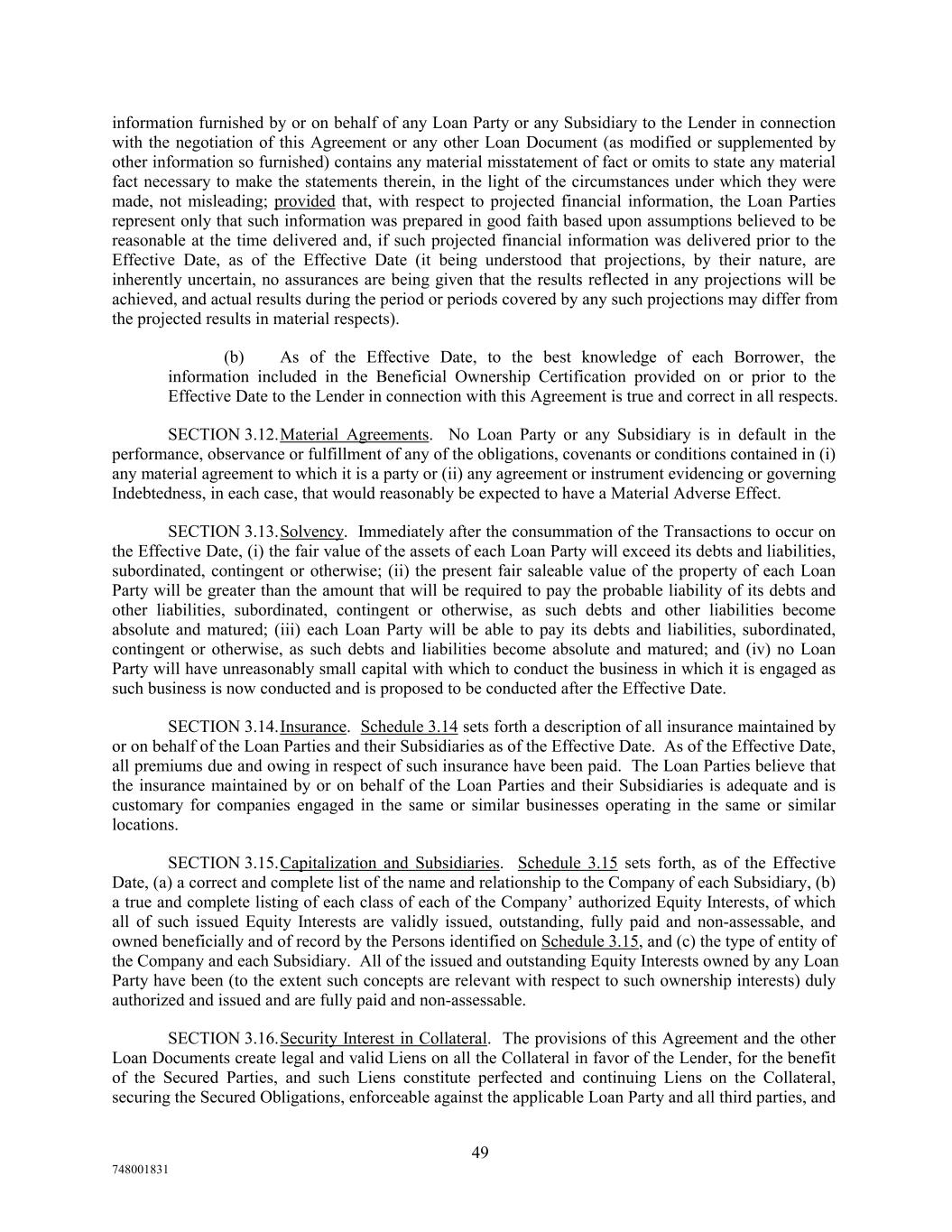 information furnished by or on behalf of any Loan Party or any Subsidiary to the Lender in connection with the negotiation of this Agreement or any other Loan Document (as modified or supplemented by other information so furnished) contains any material misstatement of fact or omits to state any material fact necessary to make the statements therein, in the light of the circumstances under which they were made, not misleading; provided that, with respect to projected financial information, the Loan Parties represent only that such information was prepared in good faith based upon assumptions believed to be reasonable at the time delivered and, if such projected financial information was delivered prior to the Effective Date, as of the Effective Date (it being understood that projections, by their nature, are inherently uncertain, no assurances are being given that the results reflected in any projections will be achieved, and actual results during the period or periods covered by any such projections may differ from the projected results in material respects). (b) As of the Effective Date, to the best knowledge of each Borrower, the information included in the Beneficial Ownership Certification provided on or prior to the Effective Date to the Lender in connection with this Agreement is true and correct in all respects. SECTION 3.12.Material Agreements. No Loan Party or any Subsidiary is in default in the performance, observance or fulfillment of any of the obligations, covenants or conditions contained in (i) any material agreement to which it is a party or (ii) any agreement or instrument evidencing or governing Indebtedness, in each case, that would reasonably be expected to have a Material Adverse Effect. SECTION 3.13.Solvency. Immediately after the consummation of the Transactions to occur on the Effective Date, (i) the fair value of the assets of each Loan Party will exceed its debts and liabilities, subordinated, contingent or otherwise; (ii) the present fair saleable value of the property of each Loan Party will be greater than the amount that will be required to pay the probable liability of its debts and other liabilities, subordinated, contingent or otherwise, as such debts and other liabilities become absolute and matured; (iii) each Loan Party will be able to pay its debts and liabilities, subordinated, contingent or otherwise, as such debts and liabilities become absolute and matured; and (iv) no Loan Party will have unreasonably small capital with which to conduct the business in which it is engaged as such business is now conducted and is proposed to be conducted after the Effective Date. SECTION 3.14.Insurance. Schedule 3.14 sets forth a description of all insurance maintained by or on behalf of the Loan Parties and their Subsidiaries as of the Effective Date. As of the Effective Date, all premiums due and owing in respect of such insurance have been paid. The Loan Parties believe that the insurance maintained by or on behalf of the Loan Parties and their Subsidiaries is adequate and is customary for companies engaged in the same or similar businesses operating in the same or similar locations. SECTION 3.15.Capitalization and Subsidiaries. Schedule 3.15 sets forth, as of the Effective Date, (a) a correct and complete list of the name and relationship to the Company of each Subsidiary, (b) a true and complete listing of each class of each of the Company’ authorized Equity Interests, of which all of such issued Equity Interests are validly issued, outstanding, fully paid and non-assessable, and owned beneficially and of record by the Persons identified on Schedule 3.15, and (c) the type of entity of the Company and each Subsidiary. All of the issued and outstanding Equity Interests owned by any Loan Party have been (to the extent such concepts are relevant with respect to such ownership interests) duly authorized and issued and are fully paid and non-assessable. SECTION 3.16.Security Interest in Collateral. The provisions of this Agreement and the other Loan Documents create legal and valid Liens on all the Collateral in favor of the Lender, for the benefit of the Secured Parties, and such Liens constitute perfected and continuing Liens on the Collateral, securing the Secured Obligations, enforceable against the applicable Loan Party and all third parties, and 49 748001831