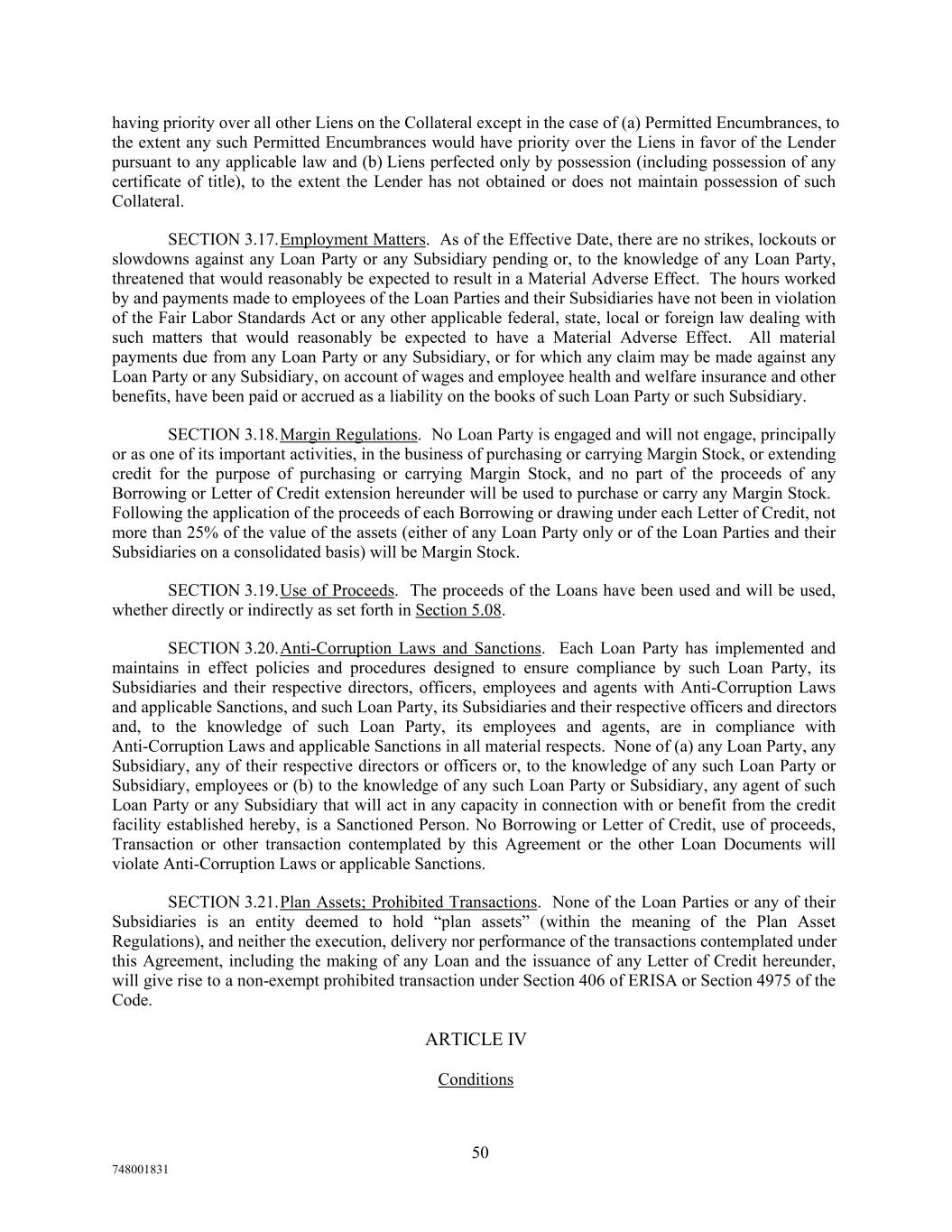 having priority over all other Liens on the Collateral except in the case of (a) Permitted Encumbrances, to the extent any such Permitted Encumbrances would have priority over the Liens in favor of the Lender pursuant to any applicable law and (b) Liens perfected only by possession (including possession of any certificate of title), to the extent the Lender has not obtained or does not maintain possession of such Collateral. SECTION 3.17.Employment Matters. As of the Effective Date, there are no strikes, lockouts or slowdowns against any Loan Party or any Subsidiary pending or, to the knowledge of any Loan Party, threatened that would reasonably be expected to result in a Material Adverse Effect. The hours worked by and payments made to employees of the Loan Parties and their Subsidiaries have not been in violation of the Fair Labor Standards Act or any other applicable federal, state, local or foreign law dealing with such matters that would reasonably be expected to have a Material Adverse Effect. All material payments due from any Loan Party or any Subsidiary, or for which any claim may be made against any Loan Party or any Subsidiary, on account of wages and employee health and welfare insurance and other benefits, have been paid or accrued as a liability on the books of such Loan Party or such Subsidiary. SECTION 3.18.Margin Regulations. No Loan Party is engaged and will not engage, principally or as one of its important activities, in the business of purchasing or carrying Margin Stock, or extending credit for the purpose of purchasing or carrying Margin Stock, and no part of the proceeds of any Borrowing or Letter of Credit extension hereunder will be used to purchase or carry any Margin Stock. Following the application of the proceeds of each Borrowing or drawing under each Letter of Credit, not more than 25% of the value of the assets (either of any Loan Party only or of the Loan Parties and their Subsidiaries on a consolidated basis) will be Margin Stock. SECTION 3.19.Use of Proceeds. The proceeds of the Loans have been used and will be used, whether directly or indirectly as set forth in Section 5.08. SECTION 3.20.Anti-Corruption Laws and Sanctions. Each Loan Party has implemented and maintains in effect policies and procedures designed to ensure compliance by such Loan Party, its Subsidiaries and their respective directors, officers, employees and agents with Anti-Corruption Laws and applicable Sanctions, and such Loan Party, its Subsidiaries and their respective officers and directors and, to the knowledge of such Loan Party, its employees and agents, are in compliance with Anti-Corruption Laws and applicable Sanctions in all material respects. None of (a) any Loan Party, any Subsidiary, any of their respective directors or officers or, to the knowledge of any such Loan Party or Subsidiary, employees or (b) to the knowledge of any such Loan Party or Subsidiary, any agent of such Loan Party or any Subsidiary that will act in any capacity in connection with or benefit from the credit facility established hereby, is a Sanctioned Person. No Borrowing or Letter of Credit, use of proceeds, Transaction or other transaction contemplated by this Agreement or the other Loan Documents will violate Anti-Corruption Laws or applicable Sanctions. SECTION 3.21.Plan Assets; Prohibited Transactions. None of the Loan Parties or any of their Subsidiaries is an entity deemed to hold “plan assets” (within the meaning of the Plan Asset Regulations), and neither the execution, delivery nor performance of the transactions contemplated under this Agreement, including the making of any Loan and the issuance of any Letter of Credit hereunder, will give rise to a non-exempt prohibited transaction under Section 406 of ERISA or Section 4975 of the Code. ARTICLE IV Conditions 50 748001831
