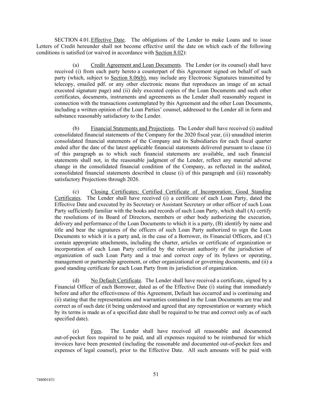 SECTION 4.01.Effective Date. The obligations of the Lender to make Loans and to issue Letters of Credit hereunder shall not become effective until the date on which each of the following conditions is satisfied (or waived in accordance with Section 8.02): (a) Credit Agreement and Loan Documents. The Lender (or its counsel) shall have received (i) from each party hereto a counterpart of this Agreement signed on behalf of such party (which, subject to Section 8.06(b), may include any Electronic Signatures transmitted by telecopy, emailed pdf. or any other electronic means that reproduces an image of an actual executed signature page) and (ii) duly executed copies of the Loan Documents and such other certificates, documents, instruments and agreements as the Lender shall reasonably request in connection with the transactions contemplated by this Agreement and the other Loan Documents, including a written opinion of the Loan Parties’ counsel, addressed to the Lender all in form and substance reasonably satisfactory to the Lender. (b) Financial Statements and Projections. The Lender shall have received (i) audited consolidated financial statements of the Company for the 2020 fiscal year, (ii) unaudited interim consolidated financial statements of the Company and its Subsidiaries for each fiscal quarter ended after the date of the latest applicable financial statements delivered pursuant to clause (i) of this paragraph as to which such financial statements are available, and such financial statements shall not, in the reasonable judgment of the Lender, reflect any material adverse change in the consolidated financial condition of the Company, as reflected in the audited, consolidated financial statements described in clause (i) of this paragraph and (iii) reasonably satisfactory Projections through 2026. (c) Closing Certificates; Certified Certificate of Incorporation; Good Standing Certificates. The Lender shall have received (i) a certificate of each Loan Party, dated the Effective Date and executed by its Secretary or Assistant Secretary or other officer of such Loan Party sufficiently familiar with the books and records of such Loan Party, which shall (A) certify the resolutions of its Board of Directors, members or other body authorizing the execution, delivery and performance of the Loan Documents to which it is a party, (B) identify by name and title and bear the signatures of the officers of such Loan Party authorized to sign the Loan Documents to which it is a party and, in the case of a Borrower, its Financial Officers, and (C) contain appropriate attachments, including the charter, articles or certificate of organization or incorporation of each Loan Party certified by the relevant authority of the jurisdiction of organization of such Loan Party and a true and correct copy of its bylaws or operating, management or partnership agreement, or other organizational or governing documents, and (ii) a good standing certificate for each Loan Party from its jurisdiction of organization. (d) No Default Certificate. The Lender shall have received a certificate, signed by a Financial Officer of each Borrower, dated as of the Effective Date (i) stating that immediately before and after the effectiveness of this Agreement, Default has occurred and is continuing and (ii) stating that the representations and warranties contained in the Loan Documents are true and correct as of such date (it being understood and agreed that any representation or warranty which by its terms is made as of a specified date shall be required to be true and correct only as of such specified date). (e) Fees. The Lender shall have received all reasonable and documented out-of-pocket fees required to be paid, and all expenses required to be reimbursed for which invoices have been presented (including the reasonable and documented out-of-pocket fees and expenses of legal counsel), prior to the Effective Date. All such amounts will be paid with 51 748001831