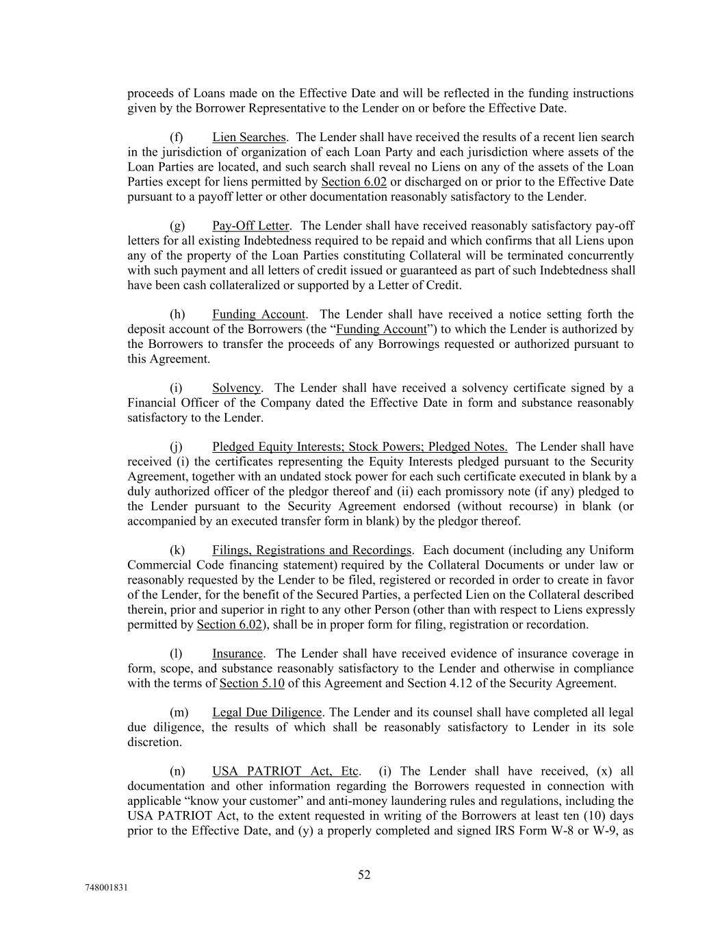 proceeds of Loans made on the Effective Date and will be reflected in the funding instructions given by the Borrower Representative to the Lender on or before the Effective Date. (f) Lien Searches. The Lender shall have received the results of a recent lien search in the jurisdiction of organization of each Loan Party and each jurisdiction where assets of the Loan Parties are located, and such search shall reveal no Liens on any of the assets of the Loan Parties except for liens permitted by Section 6.02 or discharged on or prior to the Effective Date pursuant to a payoff letter or other documentation reasonably satisfactory to the Lender. (g) Pay-Off Letter. The Lender shall have received reasonably satisfactory pay-off letters for all existing Indebtedness required to be repaid and which confirms that all Liens upon any of the property of the Loan Parties constituting Collateral will be terminated concurrently with such payment and all letters of credit issued or guaranteed as part of such Indebtedness shall have been cash collateralized or supported by a Letter of Credit. (h) Funding Account. The Lender shall have received a notice setting forth the deposit account of the Borrowers (the “Funding Account”) to which the Lender is authorized by the Borrowers to transfer the proceeds of any Borrowings requested or authorized pursuant to this Agreement. (i) Solvency. The Lender shall have received a solvency certificate signed by a Financial Officer of the Company dated the Effective Date in form and substance reasonably satisfactory to the Lender. (j) Pledged Equity Interests; Stock Powers; Pledged Notes. The Lender shall have received (i) the certificates representing the Equity Interests pledged pursuant to the Security Agreement, together with an undated stock power for each such certificate executed in blank by a duly authorized officer of the pledgor thereof and (ii) each promissory note (if any) pledged to the Lender pursuant to the Security Agreement endorsed (without recourse) in blank (or accompanied by an executed transfer form in blank) by the pledgor thereof. (k) Filings, Registrations and Recordings. Each document (including any Uniform Commercial Code financing statement) required by the Collateral Documents or under law or reasonably requested by the Lender to be filed, registered or recorded in order to create in favor of the Lender, for the benefit of the Secured Parties, a perfected Lien on the Collateral described therein, prior and superior in right to any other Person (other than with respect to Liens expressly permitted by Section 6.02), shall be in proper form for filing, registration or recordation. (l) Insurance. The Lender shall have received evidence of insurance coverage in form, scope, and substance reasonably satisfactory to the Lender and otherwise in compliance with the terms of Section 5.10 of this Agreement and Section 4.12 of the Security Agreement. (m) Legal Due Diligence. The Lender and its counsel shall have completed all legal due diligence, the results of which shall be reasonably satisfactory to Lender in its sole discretion. (n) USA PATRIOT Act, Etc. (i) The Lender shall have received, (x) all documentation and other information regarding the Borrowers requested in connection with applicable “know your customer” and anti-money laundering rules and regulations, including the USA PATRIOT Act, to the extent requested in writing of the Borrowers at least ten (10) days prior to the Effective Date, and (y) a properly completed and signed IRS Form W-8 or W-9, as 52 748001831