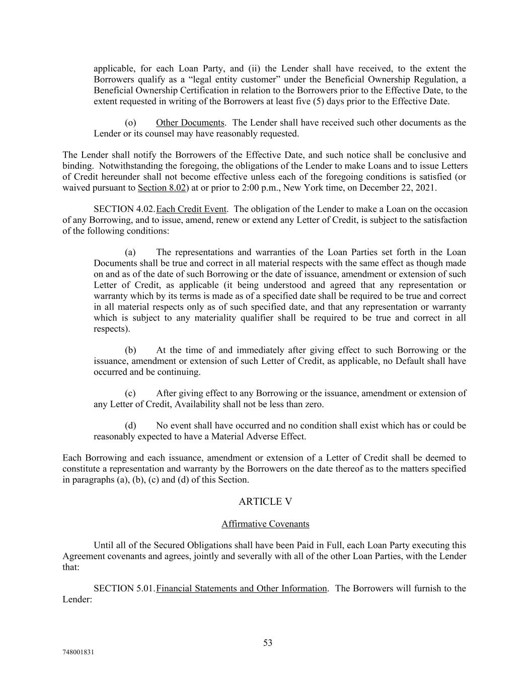 applicable, for each Loan Party, and (ii) the Lender shall have received, to the extent the Borrowers qualify as a “legal entity customer” under the Beneficial Ownership Regulation, a Beneficial Ownership Certification in relation to the Borrowers prior to the Effective Date, to the extent requested in writing of the Borrowers at least five (5) days prior to the Effective Date. (o) Other Documents. The Lender shall have received such other documents as the Lender or its counsel may have reasonably requested. The Lender shall notify the Borrowers of the Effective Date, and such notice shall be conclusive and binding. Notwithstanding the foregoing, the obligations of the Lender to make Loans and to issue Letters of Credit hereunder shall not become effective unless each of the foregoing conditions is satisfied (or waived pursuant to Section 8.02) at or prior to 2:00 p.m., New York time, on December 22, 2021. SECTION 4.02.Each Credit Event. The obligation of the Lender to make a Loan on the occasion of any Borrowing, and to issue, amend, renew or extend any Letter of Credit, is subject to the satisfaction of the following conditions: (a) The representations and warranties of the Loan Parties set forth in the Loan Documents shall be true and correct in all material respects with the same effect as though made on and as of the date of such Borrowing or the date of issuance, amendment or extension of such Letter of Credit, as applicable (it being understood and agreed that any representation or warranty which by its terms is made as of a specified date shall be required to be true and correct in all material respects only as of such specified date, and that any representation or warranty which is subject to any materiality qualifier shall be required to be true and correct in all respects). (b) At the time of and immediately after giving effect to such Borrowing or the issuance, amendment or extension of such Letter of Credit, as applicable, no Default shall have occurred and be continuing. (c) After giving effect to any Borrowing or the issuance, amendment or extension of any Letter of Credit, Availability shall not be less than zero. (d) No event shall have occurred and no condition shall exist which has or could be reasonably expected to have a Material Adverse Effect. Each Borrowing and each issuance, amendment or extension of a Letter of Credit shall be deemed to constitute a representation and warranty by the Borrowers on the date thereof as to the matters specified in paragraphs (a), (b), (c) and (d) of this Section. ARTICLE V Affirmative Covenants Until all of the Secured Obligations shall have been Paid in Full, each Loan Party executing this Agreement covenants and agrees, jointly and severally with all of the other Loan Parties, with the Lender that: SECTION 5.01.Financial Statements and Other Information. The Borrowers will furnish to the Lender: 53 748001831