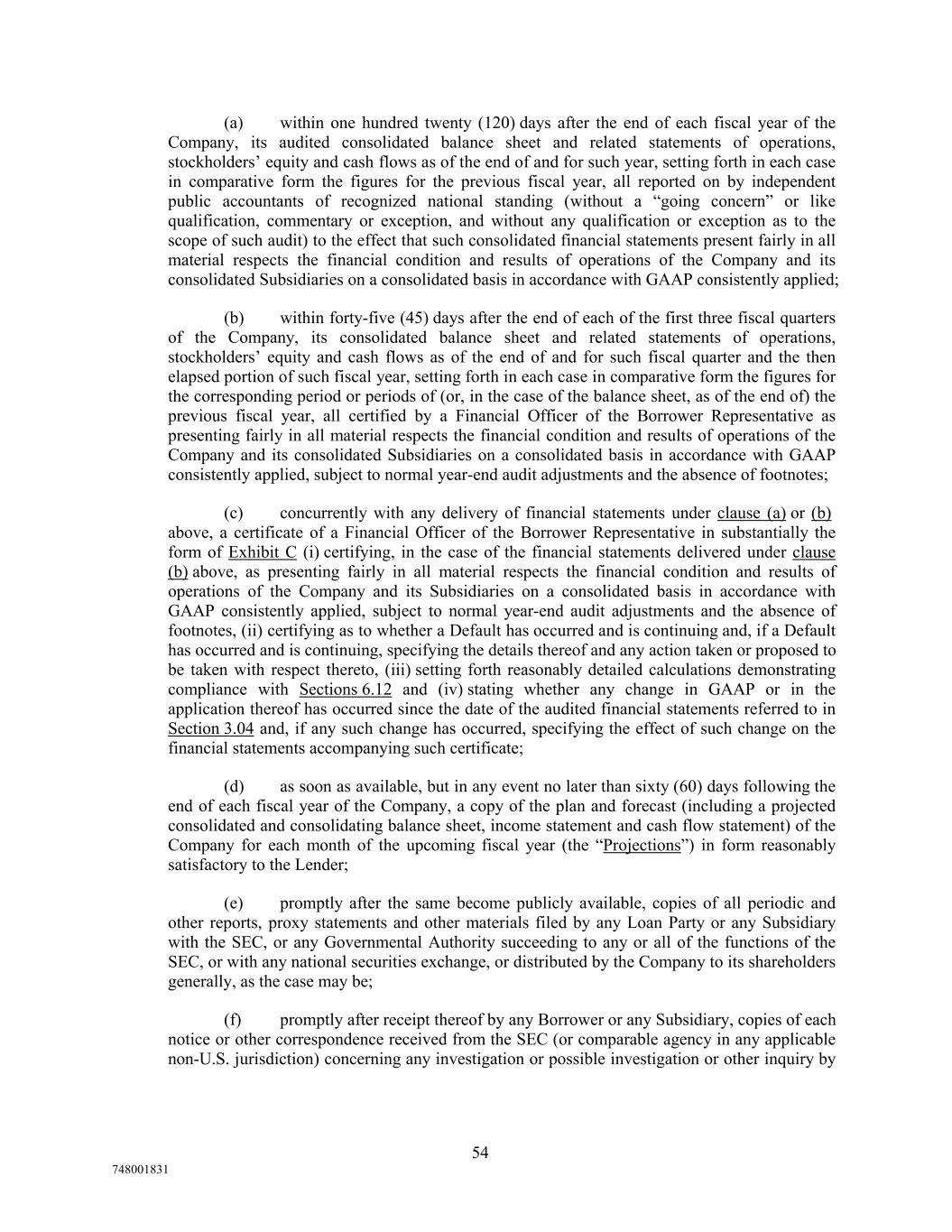 (a) within one hundred twenty (120) days after the end of each fiscal year of the Company, its audited consolidated balance sheet and related statements of operations, stockholders’ equity and cash flows as of the end of and for such year, setting forth in each case in comparative form the figures for the previous fiscal year, all reported on by independent public accountants of recognized national standing (without a “going concern” or like qualification, commentary or exception, and without any qualification or exception as to the scope of such audit) to the effect that such consolidated financial statements present fairly in all material respects the financial condition and results of operations of the Company and its consolidated Subsidiaries on a consolidated basis in accordance with GAAP consistently applied; (b) within forty-five (45) days after the end of each of the first three fiscal quarters of the Company, its consolidated balance sheet and related statements of operations, stockholders’ equity and cash flows as of the end of and for such fiscal quarter and the then elapsed portion of such fiscal year, setting forth in each case in comparative form the figures for the corresponding period or periods of (or, in the case of the balance sheet, as of the end of) the previous fiscal year, all certified by a Financial Officer of the Borrower Representative as presenting fairly in all material respects the financial condition and results of operations of the Company and its consolidated Subsidiaries on a consolidated basis in accordance with GAAP consistently applied, subject to normal year-end audit adjustments and the absence of footnotes; (c) concurrently with any delivery of financial statements under clause (a) or (b) above, a certificate of a Financial Officer of the Borrower Representative in substantially the form of Exhibit C (i) certifying, in the case of the financial statements delivered under clause (b) above, as presenting fairly in all material respects the financial condition and results of operations of the Company and its Subsidiaries on a consolidated basis in accordance with GAAP consistently applied, subject to normal year-end audit adjustments and the absence of footnotes, (ii) certifying as to whether a Default has occurred and is continuing and, if a Default has occurred and is continuing, specifying the details thereof and any action taken or proposed to be taken with respect thereto, (iii) setting forth reasonably detailed calculations demonstrating compliance with Sections 6.12 and (iv) stating whether any change in GAAP or in the application thereof has occurred since the date of the audited financial statements referred to in Section 3.04 and, if any such change has occurred, specifying the effect of such change on the financial statements accompanying such certificate; (d) as soon as available, but in any event no later than sixty (60) days following the end of each fiscal year of the Company, a copy of the plan and forecast (including a projected consolidated and consolidating balance sheet, income statement and cash flow statement) of the Company for each month of the upcoming fiscal year (the “Projections”) in form reasonably satisfactory to the Lender; (e) promptly after the same become publicly available, copies of all periodic and other reports, proxy statements and other materials filed by any Loan Party or any Subsidiary with the SEC, or any Governmental Authority succeeding to any or all of the functions of the SEC, or with any national securities exchange, or distributed by the Company to its shareholders generally, as the case may be; (f) promptly after receipt thereof by any Borrower or any Subsidiary, copies of each notice or other correspondence received from the SEC (or comparable agency in any applicable non-U.S. jurisdiction) concerning any investigation or possible investigation or other inquiry by 54 748001831
