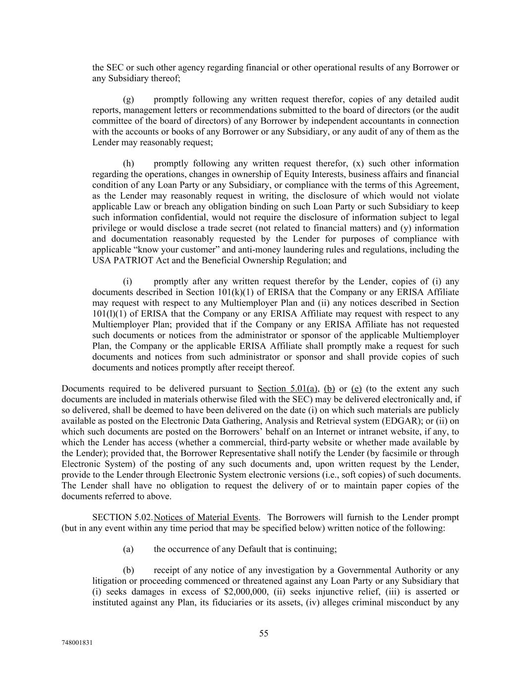 the SEC or such other agency regarding financial or other operational results of any Borrower or any Subsidiary thereof; (g) promptly following any written request therefor, copies of any detailed audit reports, management letters or recommendations submitted to the board of directors (or the audit committee of the board of directors) of any Borrower by independent accountants in connection with the accounts or books of any Borrower or any Subsidiary, or any audit of any of them as the Lender may reasonably request; (h) promptly following any written request therefor, (x) such other information regarding the operations, changes in ownership of Equity Interests, business affairs and financial condition of any Loan Party or any Subsidiary, or compliance with the terms of this Agreement, as the Lender may reasonably request in writing, the disclosure of which would not violate applicable Law or breach any obligation binding on such Loan Party or such Subsidiary to keep such information confidential, would not require the disclosure of information subject to legal privilege or would disclose a trade secret (not related to financial matters) and (y) information and documentation reasonably requested by the Lender for purposes of compliance with applicable “know your customer” and anti-money laundering rules and regulations, including the USA PATRIOT Act and the Beneficial Ownership Regulation; and (i) promptly after any written request therefor by the Lender, copies of (i) any documents described in Section 101(k)(1) of ERISA that the Company or any ERISA Affiliate may request with respect to any Multiemployer Plan and (ii) any notices described in Section 101(l)(1) of ERISA that the Company or any ERISA Affiliate may request with respect to any Multiemployer Plan; provided that if the Company or any ERISA Affiliate has not requested such documents or notices from the administrator or sponsor of the applicable Multiemployer Plan, the Company or the applicable ERISA Affiliate shall promptly make a request for such documents and notices from such administrator or sponsor and shall provide copies of such documents and notices promptly after receipt thereof. Documents required to be delivered pursuant to Section 5.01(a), (b) or (e) (to the extent any such documents are included in materials otherwise filed with the SEC) may be delivered electronically and, if so delivered, shall be deemed to have been delivered on the date (i) on which such materials are publicly available as posted on the Electronic Data Gathering, Analysis and Retrieval system (EDGAR); or (ii) on which such documents are posted on the Borrowers’ behalf on an Internet or intranet website, if any, to which the Lender has access (whether a commercial, third-party website or whether made available by the Lender); provided that, the Borrower Representative shall notify the Lender (by facsimile or through Electronic System) of the posting of any such documents and, upon written request by the Lender, provide to the Lender through Electronic System electronic versions (i.e., soft copies) of such documents. The Lender shall have no obligation to request the delivery of or to maintain paper copies of the documents referred to above. SECTION 5.02.Notices of Material Events. The Borrowers will furnish to the Lender prompt (but in any event within any time period that may be specified below) written notice of the following: (a) the occurrence of any Default that is continuing; (b) receipt of any notice of any investigation by a Governmental Authority or any litigation or proceeding commenced or threatened against any Loan Party or any Subsidiary that (i) seeks damages in excess of $2,000,000, (ii) seeks injunctive relief, (iii) is asserted or instituted against any Plan, its fiduciaries or its assets, (iv) alleges criminal misconduct by any 55 748001831