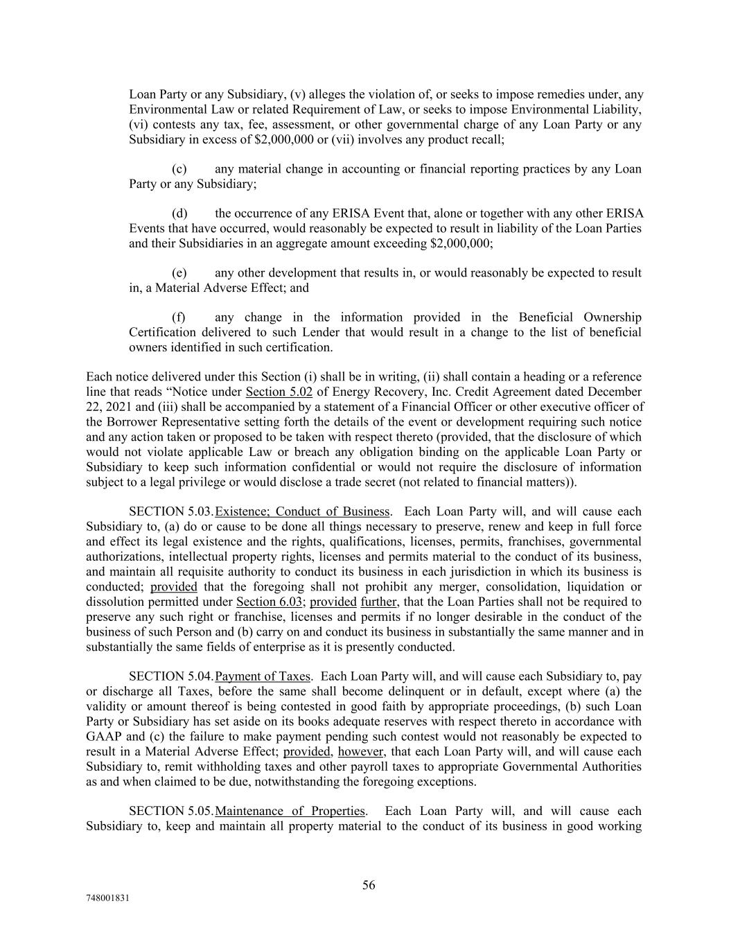 Loan Party or any Subsidiary, (v) alleges the violation of, or seeks to impose remedies under, any Environmental Law or related Requirement of Law, or seeks to impose Environmental Liability, (vi) contests any tax, fee, assessment, or other governmental charge of any Loan Party or any Subsidiary in excess of $2,000,000 or (vii) involves any product recall; (c) any material change in accounting or financial reporting practices by any Loan Party or any Subsidiary; (d) the occurrence of any ERISA Event that, alone or together with any other ERISA Events that have occurred, would reasonably be expected to result in liability of the Loan Parties and their Subsidiaries in an aggregate amount exceeding $2,000,000; (e) any other development that results in, or would reasonably be expected to result in, a Material Adverse Effect; and (f) any change in the information provided in the Beneficial Ownership Certification delivered to such Lender that would result in a change to the list of beneficial owners identified in such certification. Each notice delivered under this Section (i) shall be in writing, (ii) shall contain a heading or a reference line that reads “Notice under Section 5.02 of Energy Recovery, Inc. Credit Agreement dated December 22, 2021 and (iii) shall be accompanied by a statement of a Financial Officer or other executive officer of the Borrower Representative setting forth the details of the event or development requiring such notice and any action taken or proposed to be taken with respect thereto (provided, that the disclosure of which would not violate applicable Law or breach any obligation binding on the applicable Loan Party or Subsidiary to keep such information confidential or would not require the disclosure of information subject to a legal privilege or would disclose a trade secret (not related to financial matters)). SECTION 5.03.Existence; Conduct of Business. Each Loan Party will, and will cause each Subsidiary to, (a) do or cause to be done all things necessary to preserve, renew and keep in full force and effect its legal existence and the rights, qualifications, licenses, permits, franchises, governmental authorizations, intellectual property rights, licenses and permits material to the conduct of its business, and maintain all requisite authority to conduct its business in each jurisdiction in which its business is conducted; provided that the foregoing shall not prohibit any merger, consolidation, liquidation or dissolution permitted under Section 6.03; provided further, that the Loan Parties shall not be required to preserve any such right or franchise, licenses and permits if no longer desirable in the conduct of the business of such Person and (b) carry on and conduct its business in substantially the same manner and in substantially the same fields of enterprise as it is presently conducted. SECTION 5.04.Payment of Taxes. Each Loan Party will, and will cause each Subsidiary to, pay or discharge all Taxes, before the same shall become delinquent or in default, except where (a) the validity or amount thereof is being contested in good faith by appropriate proceedings, (b) such Loan Party or Subsidiary has set aside on its books adequate reserves with respect thereto in accordance with GAAP and (c) the failure to make payment pending such contest would not reasonably be expected to result in a Material Adverse Effect; provided, however, that each Loan Party will, and will cause each Subsidiary to, remit withholding taxes and other payroll taxes to appropriate Governmental Authorities as and when claimed to be due, notwithstanding the foregoing exceptions. SECTION 5.05.Maintenance of Properties. Each Loan Party will, and will cause each Subsidiary to, keep and maintain all property material to the conduct of its business in good working 56 748001831