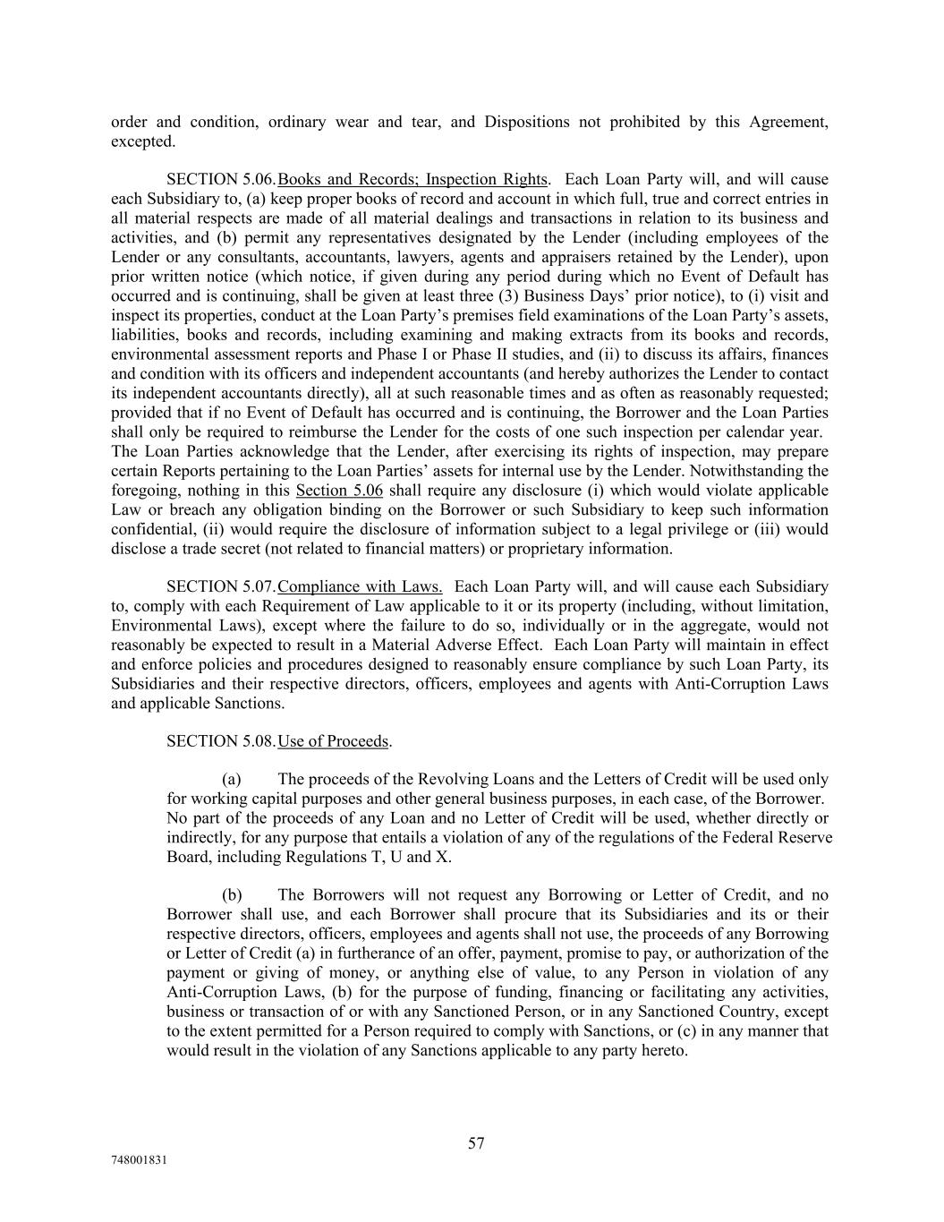 order and condition, ordinary wear and tear, and Dispositions not prohibited by this Agreement, excepted. SECTION 5.06.Books and Records; Inspection Rights. Each Loan Party will, and will cause each Subsidiary to, (a) keep proper books of record and account in which full, true and correct entries in all material respects are made of all material dealings and transactions in relation to its business and activities, and (b) permit any representatives designated by the Lender (including employees of the Lender or any consultants, accountants, lawyers, agents and appraisers retained by the Lender), upon prior written notice (which notice, if given during any period during which no Event of Default has occurred and is continuing, shall be given at least three (3) Business Days’ prior notice), to (i) visit and inspect its properties, conduct at the Loan Party’s premises field examinations of the Loan Party’s assets, liabilities, books and records, including examining and making extracts from its books and records, environmental assessment reports and Phase I or Phase II studies, and (ii) to discuss its affairs, finances and condition with its officers and independent accountants (and hereby authorizes the Lender to contact its independent accountants directly), all at such reasonable times and as often as reasonably requested; provided that if no Event of Default has occurred and is continuing, the Borrower and the Loan Parties shall only be required to reimburse the Lender for the costs of one such inspection per calendar year. The Loan Parties acknowledge that the Lender, after exercising its rights of inspection, may prepare certain Reports pertaining to the Loan Parties’ assets for internal use by the Lender. Notwithstanding the foregoing, nothing in this Section 5.06 shall require any disclosure (i) which would violate applicable Law or breach any obligation binding on the Borrower or such Subsidiary to keep such information confidential, (ii) would require the disclosure of information subject to a legal privilege or (iii) would disclose a trade secret (not related to financial matters) or proprietary information. SECTION 5.07.Compliance with Laws. Each Loan Party will, and will cause each Subsidiary to, comply with each Requirement of Law applicable to it or its property (including, without limitation, Environmental Laws), except where the failure to do so, individually or in the aggregate, would not reasonably be expected to result in a Material Adverse Effect. Each Loan Party will maintain in effect and enforce policies and procedures designed to reasonably ensure compliance by such Loan Party, its Subsidiaries and their respective directors, officers, employees and agents with Anti-Corruption Laws and applicable Sanctions. SECTION 5.08.Use of Proceeds. (a) The proceeds of the Revolving Loans and the Letters of Credit will be used only for working capital purposes and other general business purposes, in each case, of the Borrower. No part of the proceeds of any Loan and no Letter of Credit will be used, whether directly or indirectly, for any purpose that entails a violation of any of the regulations of the Federal Reserve Board, including Regulations T, U and X. (b) The Borrowers will not request any Borrowing or Letter of Credit, and no Borrower shall use, and each Borrower shall procure that its Subsidiaries and its or their respective directors, officers, employees and agents shall not use, the proceeds of any Borrowing or Letter of Credit (a) in furtherance of an offer, payment, promise to pay, or authorization of the payment or giving of money, or anything else of value, to any Person in violation of any Anti-Corruption Laws, (b) for the purpose of funding, financing or facilitating any activities, business or transaction of or with any Sanctioned Person, or in any Sanctioned Country, except to the extent permitted for a Person required to comply with Sanctions, or (c) in any manner that would result in the violation of any Sanctions applicable to any party hereto. 57 748001831